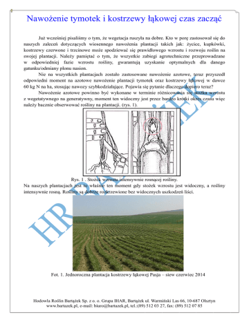 Nawożenie tymotek i kostrzewy łąkowej czas zacząć Już wcześniej pisaliśmy o tym, że wegetacja ruszyła na dobre. Kto w porę zastosował się do naszych zaleceń dotyczących wiosennego nawożenia plantacji takich jak: życice, kupkówki, kostrzewy czerwone i trzcinowe może spodziewać się prawidłowego wzrostu i rozwoju roślin na swojej plantacji. Należy pamiętać o tym, że wszystkie zabiegi agrotechniczne przeprowadzane w odpowiedniej fazie wzrostu rośliny, gwarantują uzyskanie optymalnych dla danego gatunku/odmiany plonu nasion. Nie na wszystkich plantacjach zostało zastosowane nawożenie azotowe, teraz przyszedł odpowiedni moment na azotowe nawożenie plantacji tymotek oraz kostrzewy łąkowej w dawce 60 kg N na ha, stosując nawozy szybkodziałające. Pojawia się pytanie dlaczego dopiero teraz? Nawożenie azotowe powinno być wykonane w terminie różnicowania się stożka wzrostu z wegetatywnego na generatywny, moment ten widoczny jest przez bardzo krótki okres czasu więc należy bacznie obserwować rośliny na plantacji. (rys. 1). Rys. 1 . Stożek wzrostu intensywnie rosnącej rośliny. Na naszych plantacjach jest to właśnie ten moment gdy stożek wzrostu jest widoczny, a rośliny intensywnie rosną. Rośliny są dobrze rozkrzewione bez widocznych uszkodzeń liści. Fot. 1. Jednoroczna plantacja kostrzewy łąkowej Pasja – siew czerwiec 2014 Hodowla Roślin Bartążek Sp. z o. o. Grupa IHAR, Bartążek ul. Warmiński Las 66, 10-687 Olsztyn www.bartazek.pl, e-mail: [email protected], tel.:(89) 512 03 27, fax: (89) 512 07 85 Nawożenie tymotek i kostrzewy łąkowej czas zacząć Fot. 2. Krzewiące się rośliny kostrzewy łąkowej Pasja. Należy pamiętać o tym aby nie przesadzić z ilością zastosowanego nawożenia azotowego. Zawsze lepiej postępować z zasadą mniejszej dawki i w razie potrzeby zastosować kolejną dawkę azotu. Zbyt duża jednorazowa dawka azotu może spowodować wyleganie plantacji nasiennej. Długo utrzymująca się susza powoduje duże straty azotu dla tego nawożenie najlepiej stosować przed spodziewanymi opadami deszczu. Plonotwórcze działanie azotu to: wzrost masy nadziemnej i podziemnej roślin - wyższy plon korzeni, zielonej masy i nasion, dłuższy okres wegetacji, co pozwala na lepsze wykorzystanie składników pokarmowych, większa zawartość i jakość białka, lepsza wartość biologiczna plonu. Nadmiar azotu słabe zimowanie roślin, wyleganie, nierównomierne i opóźnione dojrzewanie, zwiększenie podatność roślin na choroby i szkodniki, pogarsza wartość biologiczną i technologiczną plonu. Niedobór azotu hamuje wzrost roślin- rośliny są wówczas słabo rozkrzewione, o pokroju strzelistym, mają mniejsze jasnozielone, szybko żółknące liście Hodowla Roślin Bartążek Sp. z o. o. Grupa IHAR, Bartążek ul. Warmiński Las 66, 10-687 Olsztyn www.bartazek.pl, e-mail: [email protected], tel.:(89) 512 03 27, fax: (89) 512 07 85
