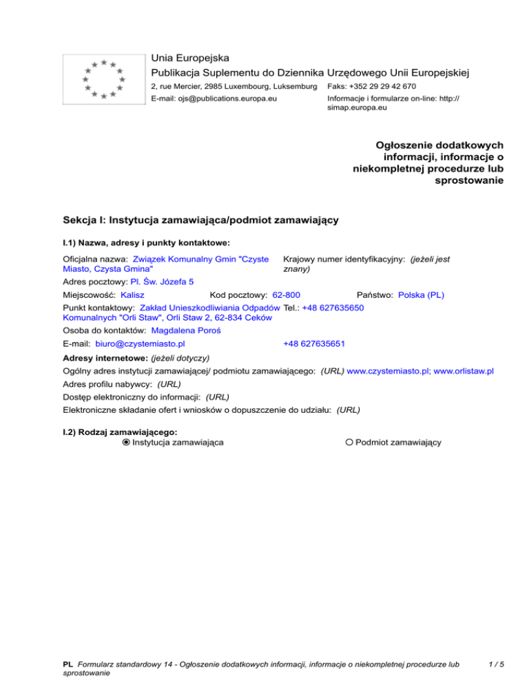 Unia Europejska Publikacja Suplementu do Dziennika Urzędowego Unii Europejskiej 2, rue Mercier, 2985 Luxembourg, Luksemburg Faks: +352 29 29 42 670 E-mail: [email protected] Informacje i formularze on-line: http:// simap.europa.eu Ogłoszenie dodatkowych informacji, informacje o niekompletnej procedurze lub sprostowanie Sekcja I: Instytucja zamawiająca/podmiot zamawiający I.1) Nazwa, adresy i punkty kontaktowe: Oficjalna nazwa: Związek Komunalny Gmin "Czyste Miasto, Czysta Gmina" Krajowy numer identyfikacyjny: (jeżeli jest znany) _____ Adres pocztowy: Pl. Św. Józefa 5 Miejscowość: Kalisz Kod pocztowy: 62-800 Państwo: Polska (PL) Punkt kontaktowy: Zakład Unieszkodliwiania Odpadów Tel.: +48 627635650 Komunalnych "Orli Staw", Orli Staw 2, 62-834 Ceków Osoba do kontaktów: Magdalena Poroś E-mail: [email protected] +48 627635651 Adresy internetowe: (jeżeli dotyczy) Ogólny adres instytucji zamawiającej/ podmiotu zamawiającego: (URL) www.czystemiasto.pl; www.orlistaw.pl Adres profilu nabywcy: (URL) _____ Dostęp elektroniczny do informacji: (URL) _____ Elektroniczne składanie ofert i wniosków o dopuszczenie do udziału: (URL) _____ I.2) Rodzaj zamawiającego: Instytucja zamawiająca Podmiot zamawiający PL Formularz standardowy 14 - Ogłoszenie dodatkowych informacji, informacje o niekompletnej procedurze lub sprostowanie 1/5 Sekcja II: Przedmiot zamówienia II.1.1) Nazwa nadana zamówieniu: Dostawa oleju napędowego, benzyny bezołowiowej 95 i oleju opałowego lekkiego do Związku Komunalnego Gmin „Czyste Miasto, Czysta Gmina” II.1.2) Krótki opis zamówienia lub zakupu:(podano w pierwotnym ogłoszeniu) Przedmiotem zamówienia jest dostawa do Związku Komunalnego Gmin „Czyste Miasto, Czysta Gmina”: - oleju napędowego w szacunkowej ilości 138 000 litrów oraz benzyny bezołowiowej 95 w szacunkowej ilości 450 litrów (Zadanie nr 1), - oleju opałowego lekkiego w szacunkowej ilości 22 000 litrów (Zadanie nr 2), na adres: Zakład Unieszkodliwiania Odpadów Komunalnych "Orli Staw", Orli Staw 2, 62-834 Ceków II.1.3) Wspólny Słownik Zamówień (CPV) Główny przedmiot Dodatkowe przedmioty Słownik główny 09100000 09134100 09132100 09135100 Słownik uzupełniający (jeżeli dotyczy) PL Formularz standardowy 14 - Ogłoszenie dodatkowych informacji, informacje o niekompletnej procedurze lub sprostowanie 2/5 Sekcja IV: Procedura IV.1)Rodzaj procedury(podano w pierwotnym ogłoszeniu) Otwarta Ograniczona Ograniczona przyspieszona Negocjacyjna Negocjacyjna przyspieszona Dialog konkurencyjny Negocjacyjna z uprzednim ogłoszeniem Negocjacyjna bez uprzedniego ogłoszenia Negocjacyjna z publikacją ogłoszenia o zamówieniu Negocjacyjna bez publikacji ogłoszenia o zamówieniu Udzielenie zamówienia bez uprzedniej publikacji ogłoszenia o zamówieniu w Dzienniku Urzędowym Unii Europejskiej IV.2)Informacje administracyjne IV.2.1)Numer referencyjny: (podano w pierwotnym ogłoszeniu) UA.271.1.3.2012 IV.2.2)Dane referencyjne ogłoszenia w przypadku ogłoszeń przesłanych drogą elektroniczną: Pierwotne ogłoszenie przesłane przez eNotices TED eSender Login: ENOTICES_czystemiasto Dane referencyjne ogłoszenia: 2012-010388 rok i numer dokumentu IV.2.3)Ogłoszenie, którego dotyczy niniejsza publikacja: Numer ogłoszenia w Dz.U.: 2012/S 15-023686 z dnia: 24/01/2012 (dd/mm/rrrr) IV.2.4)Data wysłania pierwotnego ogłoszenia: 19/01/2012 (dd/mm/rrrr) PL Formularz standardowy 14 - Ogłoszenie dodatkowych informacji, informacje o niekompletnej procedurze lub sprostowanie 3/5 Sekcja VI: Informacje uzupełniające VI.1) Ogłoszenie dotyczy: Procedury niepełnej Sprostowania Informacji dodatkowych VI.2) Informacje na temat niepełnej procedury udzielenia zamówienia: Postępowanie o udzielenie zamówienia zostało przerwane Postępowanie o udzielenie zamówienia uznano za nieskuteczne Zamówienia nie udzielono Zamówienie może być przedmiotem ponownej publikacji VI.3) Informacje do poprawienia lub dodania : VI.3.1) Zmiana oryginalnej informacji podanej przez instytucję zamawiającą Publikacja w witrynie TED niezgodna z oryginalną informacją, przekazaną przez instytucję zamawiającą Oba przypadki VI.3.2) W ogłoszeniu pierwotnym W odpowiedniej dokumentacji przetargowej (więcej informacji w odpowiedniej dokumentacji przetargowej) W obu przypadkach (więcej informacji w odpowiedniej dokumentacji przetargowej) VI.3.3) Tekst, który należy poprawić w pierwotnym ogłoszeniu Miejsce, w którym znajduje się Zamiast: zmieniany tekst: Czas trwania zamówienia lub termin II.3) realizacji Okres w miesiącach: 12 (od udzielenia zamówienia) Powinno być: Czas trwania zamówienia lub termin realizacji Do dnia 31 grudnia 2012 Miejsce, w którym znajduje się zmieniany tekst: Informacje o częściach zamówienia Część nr: 1 Nazwa: 1 4) Zamiast: Powinno być: Informacje o różnych datach dotyczących czasu trwania lub rozpoczęcia/realizacji zamówienia Okres w miesiącach: 12 (od udzielenia zamówienia) Informacje o różnych datach dotyczących czasu trwania lub rozpoczęcia/realizacji zamówienia Do dnia 31 grudnia 2012 Miejsce, w którym znajduje się zmieniany tekst: Informacje o częściach zamówienia Część nr: 2 Nazwa: 2 4) Zamiast: Powinno być: Informacje o różnych datach dotyczących czasu trwania lub rozpoczęcia/realizacji zamówienia Okres w miesiącach: 12 (od udzielenia zamówienia) Informacje o różnych datach dotyczących czasu trwania lub rozpoczęcia/realizacji zamówienia Do dnia 31 grudnia 2012 VI.3.4) Daty, które należy poprawić w pierwotnym ogłoszeniu Miejsce, w którym znajdują się Zamiast: zmieniane daty: 29/02/2012 Godzina: 10:00 IV.3.3) (dd/mm/rrrr) Miejsce, w którym znajdują się zmieniane daty: Zamiast: 29/02/2012 Godzina: 10:00 (dd/mm/rrrr) Powinno być: 01/03/2012 Godzina: 10:00 (dd/mm/rrrr) Powinno być: 01/03/2012 Godzina: 10:00 (dd/mm/rrrr) PL Formularz standardowy 14 - Ogłoszenie dodatkowych informacji, informacje o niekompletnej proc