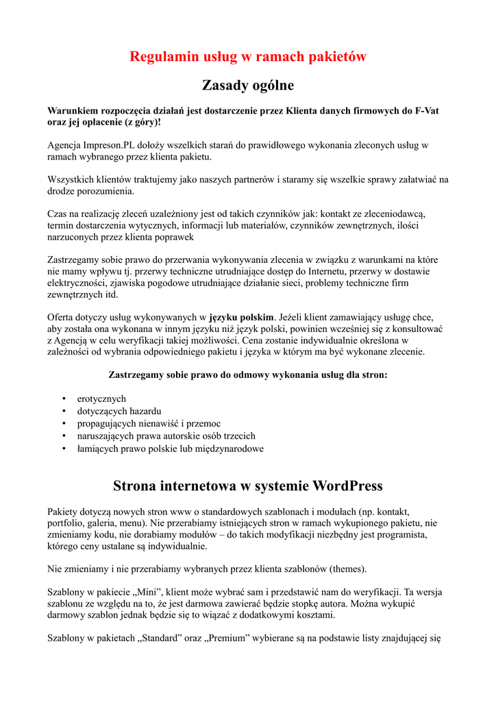Regulamin usług w ramach pakietów Zasady ogólne Warunkiem rozpoczęcia działań jest dostarczenie przez Klienta danych firmowych do F-Vat oraz jej opłacenie (z góry)! Agencja Impreson.PL dołoży wszelkich starań do prawidłowego wykonania zleconych usług w ramach wybranego przez klienta pakietu. Wszystkich klientów traktujemy jako naszych partnerów i staramy się wszelkie sprawy załatwiać na drodze porozumienia. Czas na realizację zleceń uzależniony jest od takich czynników jak: kontakt ze zleceniodawcą, termin dostarczenia wytycznych, informacji lub materiałów, czynników zewnętrznych, ilości narzuconych przez klienta poprawek Zastrzegamy sobie prawo do przerwania wykonywania zlecenia w związku z warunkami na które nie mamy wpływu tj. przerwy techniczne utrudniające dostęp do Internetu, przerwy w dostawie elektryczności, zjawiska pogodowe utrudniające działanie sieci, problemy techniczne firm zewnętrznych itd. Oferta dotyczy usług wykonywanych w języku polskim. Jeżeli klient zamawiający usługę chce, aby została ona wykonana w innym języku niż język polski, powinien wcześniej się z konsultować z Agencją w celu weryfikacji takiej możliwości. Cena zostanie indywidualnie określona w zależności od wybrania odpowiedniego pakietu i języka w którym ma być wykonane zlecenie. Zastrzegamy sobie prawo do odmowy wykonania usług dla stron: • • • • • erotycznych dotyczących hazardu propagujących nienawiść i przemoc naruszających prawa autorskie osób trzecich łamiących prawo polskie lub międzynarodowe Strona internetowa w systemie WordPress Pakiety dotyczą nowych stron www o standardowych szablonach i modułach (np. kontakt, portfolio, galeria, menu). Nie przerabiamy istniejących stron w ramach wykupionego pakietu, nie zmieniamy kodu, nie dorabiamy modułów – do takich modyfikacji niezbędny jest programista, którego ceny ustalane są indywidualnie. Nie zmieniamy i nie przerabiamy wybranych przez klienta szablonów (themes). Szablony w pakiecie „Mini”, klient może wybrać sam i przedstawić nam do weryfikacji. Ta wersja szablonu ze względu na to, że jest darmowa zawierać będzie stopkę autora. Można wykupić darmowy szablon jednak będzie się to wiązać z dodatkowymi kosztami. Szablony w pakietach „Standard” oraz „Premium” wybierane są na podstawie listy znajdującej się pod tym linkiem ==> http://www.elegantthemes.com/gallery/ Strona internetowa zostanie zrobiona według wytycznych klienta, przesłanych np. drogą mailową. Usługa dotyczy stworzenia strony firmowej z kilkoma zakładkami (5-7) w systemie CMS WordPress na darmowym lub płatnym szablonie, w zależności od wykupionego pakietu. Usługa nie obejmuje skomplikowanych projektów, czy też przeróbek portali internetowych, platform, sklepów internetowych itp. Stronna www oraz domena utrzymywane są na naszym hostingu. Usługa wkalkulowana jest w cenę pakietów, czyli jest nierozłączna. Po upływie okresu trwania umowy, w zależności od pakietu 1 rok, 2 lata lub 3 lata strona oraz domena mogą być przeniesione na miejsce hostingowe wskazane przez klienta, lub być dalej utrzymywana na naszym hostingu. Pomoc w wyborze domeny oraz roczny abonament dotyczy domen polskich .pl, funkcjonalnych np. .com.pl, .net.pl, .org.pl, regionalnych np. .waw.pl oraz europejskich .eu. Domeny globalne, narodowe, specjalistyczne wyceniane są indywidualnie. Firma BIZBIA Zbigniew Sieczka właściciel Agencji Impreson.PL nie ponosi odpowiedzialności za przerwy w działaniu strony www wynikające z przyczyn zewnętrznych, niezależnych od Agencji. Działania SEO Klient w ramach usługi otrzyma optymalizacje strony pod kątem SEO. Optymalizacja strony internetowej jest podstawą do rozpoczęcia procesu pozycjonowania i przygotowuje ją do szerszych działań. Należy jednak pamiętać, że nie można poprzestać na samej optymalizacji, w momencie, kiedy oczekujemy wysokich pozycji w Google. Pozycjonowanie jest procesem złożonym, a optymalizacja jest jego pierwszym etapem. Dodanie strony do katalogów ze względów „bezpieczeństwa” (filtr od Google) odbywać się będzie w określonych ramach czasowych: pakiet MINI 20 katalogów max. 30 dni pakiet STANDART 50 katalogów max. 60 dni pakiet PREMIUM 100 katalogów max. 120 dni Takie działanie spowodowane jest ochroną strony przed zbyt szybkim wzrostem linków, które Google może uznać za nienaturalne działanie. Copywriting Wszystkie artykuły pisane są przez naszych specjalistów. Artykuły pisane są na tematy związane z działalnością firmy. Klient może sam narzucać temat tekstu, jednak nie odbiegającego tematem od tego, w jakiej branży działa. Termin dostarczenia tekstów ustalany jest indywidualnie ale przyjmuje się, że piszemy jeden artykuł miesięcznie. Ilość artykułów dostępnych w poszczególnych pakietach może być dowolnie zwiększana na życzenie klienta. Cena jednostkowa za artykuł bez grafiki wynosi 100 zł brutto za 2 strony A4. Identyfikacja wizualna Wszystkie projekty graficzne wykonane są na legalnym oprogramowaniu. Zdjęcia wykorzystane w projektach wizytówek oraz ulotek pochodzą z legalnego źródła (banku zdjęć). Termin realizacji ustalany jest indywidualnie z klientem. Projekty mogą być jednostronne lub dwustronne w zależności od zapotrzebowania klienta. Cena za projekt oraz druk jednostronny lub dwustronny jest taka sama. Projekt logo w zależności od wykupionego pakietu zawiera: pakiet MINI 2 koncepcje loga do wyboru + 2 poprawki przeniesienie praw autorskich do loga formaty zapisu: .cdr .pdf (do druku) .jpg .png (do internetu) pakiet STANDART 3 koncepcje loga do wyboru + 5 poprawek przeniesienie praw autorskich do loga formaty zapisu: .cdr .pdf (do druku) .jpg .png (do internetu) pakiet PREMIUM 4 koncepcje loga do wyboru + 8 poprawek przeniesienie praw autorskich do loga formaty zapisu: .cdr .pdf (do druku) .jpg .png (do internetu) Profil firmowy na Fac