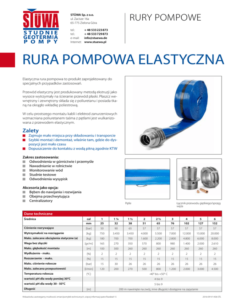 Rury pompowe STÜWA Sp. z o.o. ul. Zacisze 16a 65-775 Zielona Góra tel.: tel.: e-mail: Internet: + 48 533 223 873 + 48 533 729 873 [email protected] www.stuewa.pl Rura pompowa elastyczna Elastyczna rura pompowa to produkt zaprojektowany do specjalnych przypadków zastosowań. Przewód elastyczny jest produkowany metodą ekstruzji jako wysoce wytrzymały na ścieranie przewód płaski. Płaszcz wewnętrzny i zewnętrzny składa się z poliuretanu i posiada tkaną na okrągło wkładkę poliestrową. W celu prostszego montażu kabli i elektrod zanurzeniowych wzmacniana poliuretanem taśma z pętlami jest wulkanizowana z przewodem elastycznym. Zalety Zajmuje mało miejsca przy składowaniu i transporcie Szybki montaż i demontaż, właśnie tam, gdzie do dyspozycji jest mało czasu Dopuszczenie do kontaktu z wodą pitną zgodnie KTW Zakres zastosowania: Odwodnienia w górnictwie i przemyśle Nawadnianie w rolnictwie Monitorowanie wód Studnie testowe Odwodnienia wysypisk Akcesoria jako opcja: Bęben do nawijania i rozwijania Obejma przechwytująca Centralizatory Pętle Łącznik przewodu giętkiego/sprzęg węża Dane techniczne Średnica cal mm Ciśnienie rozrywające [bar] 50 90 65 57 57 57 57 57 57 Wytrzymałość na rozciąganie [kg] 750 3.450 3.450 4.000 5.500 7.000 12.000 15.000 20.000 Maks. zalecane obciążenia statyczne (a) 1 25 1¼ 32 1½ 38 2 51 2½ 65 3 76 4 102 5 127 6 152 [kg] 180 700 700 1.600 2.200 2.800 4.800 6.000 8.000 [gr/m] 165 270 350 570 800 980 1.400 2.000 2.610 Maks. głębokość montażu [m] 100 300 260 260 260 260 260 260 260 Wydłużenie - maks. [%] 2 2 2 2 2 2 2 2 2 Rozszerzenie - maks. [%] 15 15 15 15 15 15 15 15 15 Maks. ciśnienie robocze [bar] 15 30 26 26 26 26 26 26 26 [l/min] 120 200 270 500 800 1.200 2.000 3.000 4.500 Waga bez złączki Maks. zalecana przepustowość Temperatura robocza [°C] -40° bis +50° C wartość pH dla wody poniżej 30°C 4 bis 9 wartość pH dla wody 30 - 50°C 5 bis 9 Długość [m] Wskazówka: zastrzegamy możliwość zmian/pomyłek technicznych, więcej informacji patrz Rozdział 15 200 m nawinięte na zwój, inne długości dostępne na zapytanie 2016-09-V1-K06-STL