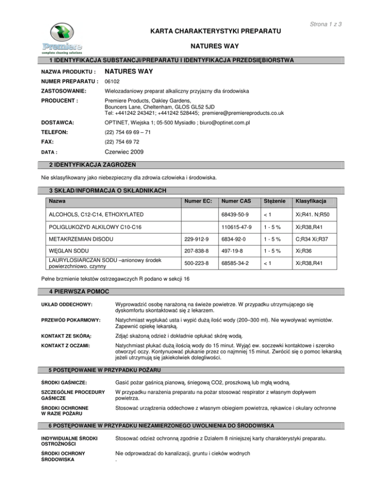 Strona 1 z 3 KARTA CHARAKTERYSTYKI PREPARATU NATURES WAY 1 IDENTYFIKACJA SUBSTANCJI/PREPARATU I IDENTYFIKACJA PRZEDSIĘBIORSTWA NAZWA PRODUKTU : NATURES WAY NUMER PREPARATU : 06102 ZASTOSOWANIE: Wielozadaniowy preparat alkaliczny przyjazny dla środowiska PRODUCENT : Premiere Products, Oakley Gardens, Bouncers Lane, Cheltenham, GLOS GL52 5JD Tel: +441242 243421; +441242 528445; [email protected] DOSTAWCA: OPTINET, Wiejska 1; 05-500 Mysiadło ; [email protected] TELEFON: (22) 754 69 69 – 71 FAX: (22) 754 69 72 DATA : Czerwiec 2009 2 IDENTYFIKACJA ZAGROŻEŃ Nie sklasyfikowany jako niebezpieczny dla zdrowia człowieka i środowiska. 3 SKŁAD/INFORMACJA O SKŁADNIKACH Nazwa Numer EC: Numer CAS Stężenie Klasyfikacja ALCOHOLS, C12-C14, ETHOXYLATED 68439-50-9 <1 Xi;R41. N;R50 POLIGLUKOZYD ALKILOWY C10-C16 110615-47-9 1-5% Xi;R38,R41 METAKRZEMIAN DISODU 229-912-9 6834-92-0 1-5% C;R34 Xi;R37 WĘGLAN SODU 207-838-8 497-19-8 1-5% Xi;R36 LAURYLOSIARCZAN SODU –anionowy środek powierzchniowo. czynny 500-223-8 68585-34-2 <1 Xi;R38,R41 Pełne brzmienie tekstów ostrzegawczych R podano w sekcji 16 4 PIERWSZA POMOC UKŁAD ODDECHOWY: Wyprowadzić osobę narażoną na świeże powietrze. W przypadku utrzymującego się dyskomfortu skontaktować się z lekarzem. PRZEWÓD POKARMOWY: Natychmiast wypłukać usta i wypić dużą ilość wody (200–300 ml). Nie wywoływać wymiotów. Zapewnić opiekę lekarską. KONTAKT ZE SKÓRĄ: Zdjąć skażoną odzież i dokładnie opłukać skórę wodą. KONTAKT Z OCZAMI: Natychmiast płukać dużą ilością wody do 15 minut. Wyjąć ew. soczewki kontaktowe i szeroko otworzyć oczy. Kontynuować płukanie przez co najmniej 15 minut. Zwrócić się o pomoc lekarską jeżeli utrzymują się jakiekolwiek dolegliwości. 5 POSTĘPOWANIE W PRZYPADKU POŻARU ŚRODKI GAŚNICZE: Gasić pożar gaśnicą pianową, śniegową CO2, proszkową lub mgłą wodną. SZCZEGÓLNE PROCEDURY GAŚNICZE W przypadku narażenia preparatu na pożar stosować respirator z własnym dopływem powietrza. ŚRODKI OCHRONNE W RAZIE POŻARU Stosować urządzenia oddechowe z własnym obiegiem powietrza, rękawice i okulary ochronne 6 POSTĘPOWANIE W PRZYPADKU NIEZAMIERZONEGO UWOLNIENIA DO ŚRODOWISKA INDYWIDUALNE ŚRODKI OSTROŻNOŚCI Stosować odzież ochronną zgodnie z Działem 8 niniejszej karty charakterystyki preparatu. ŚRODKI OCHRONY ŚRODOWISKA Nie odprowadzać do kanalizacji, gruntu i cieków wodnych . Strona 2 z 3 NATURES WAY METODY OCZYSZCZANIA / Materiał rozsypany lub rozlany zebrać niepalnym chłonnym materiałem. Spłukać teren wodą. Odpady i zanieczyszczone materiały należy jak najszybciej zebrać i usunąć z terenu pracy do odpowiednio oznakowanego pojemnika 7 POSTĘPOWANIE Z PREPARATEM I JEGO MAGAZYNOWANIE POSTĘPOWANIE: Stosować się do zaleceń producenta. MAGAZYNOWANIE: Przechowywać w szczelnie zamkniętym oryginalnym opakowaniu w suchym i chłodnym miejscu. KLASA SKŁADOWANIA Magazyn substancji chemicznych. 8 KONTROLA NARAŻENIA I SRODKI OCHRONY INDYWIDUALNEJ OCHRONA DRÓG ODDECHOWYCH: Nie dotyczy OCHRONA RĄK: Przy długotrwałym użyciu zaleca się stosowanie rękawic. OCHRONA OCZU: W przypadku prawdopodobieństwa narażenia oczu stosować okulary ochronne zatwierdzone dla substancji chemicznych. INNE ŚRODKI OCHRONNE Nie wymagane. 9 WŁAŚCIWOŚCI FIZYKOCHEMICZNE POSTAĆ FIZYCZNA Lepki płyn KOLOR Zielony ZAPACH Owocowy GĘSTOŚĆ: 1.044 kg/l przy 20 C ROZPUSZCZALNOŚĆ : Rozpuszcza się w wodzie. WARTOŚĆ pH, ROZTWÓR STĘŻONY 12,0 WSPÓŁCZYNNIK ZAŁAMANIA 10% o 10 STABILNOŚĆ I REAKTYWNOŚĆ STABILNOŚĆ Stabilny w normalnych warunkach temperaturowych i stosowania zgodnie z zaleceniami. UNIKAĆ WARUNKÓW Unikać długotrwałego nadmiernego ciepła. UNIKAĆ MATERIAŁÓW Mocne kwasy. NIEBEZPIECZNE PRODUKTY ROZPADU Żadne niebezpieczne produkty rozkładu nie są znane . 11 INFORMACJE TOKSYKOLOGICZNE INFORMACJE TOKSYKOLOGICZNE: Nie zanotowano żadnych danych. 12 INFORMACJE EKOLOGICZNE ZAGROŻENIA DLA ŚRODOWISKA: Preparat nie jest uważany za niebezpieczny dla środowiska. Brak danych o ekotoksyczności preparatu ROZKŁADALNOŚĆ Przewiduje się, że preparat ulega biodegradacji. MOBILNOŚĆ Preparat rozpuszcza się w wodzie. 13 POSTĘPOWANIE Z ODPADAMI SPOSÓB USUWANIA : Pozostałości mogą zostać usunięte przy użyciu dużej ilości wody. Niewielkie ilości można spłukać wodą do kanału ściekowego. Puste opakowanie po umyciu może być powtórnie użyte 14 INFORMACJE O TRANSPORCIE INFORMACJE OGÓLNE: Nie sklasyfikowano pod względem transportu. Strona 3 z 3 NATURES WAY 15 INFORMACJE DOTYSZACE PRZEPISÓW PRAWNYCH ZWROTY OSTRZEGAWCZE : NC Nie sklasyfikowane jako niebezpieczny. ZWROTY BEZPIECZEŃSTWA : S2 P13 Chronić przed dziećmi. Karta charakterystyki dostępna na żądanie użytkownika prowadzącego działalność zawodową. DYREKTYWY EC: Dyrektywa w sprawie karty charakterystyki, dyrektywa 91/155/EEC w postaci dyrektywy 2001/58/EC (z 27 lipca 2001) INSTRUMENTY USTAWOWE: Przepisy dot. Substancji chemicznych (Pakowanie i Informacje o Zagrożeniach) ZATWIERDZONE ZASADY POSTĘPOWANIA: Zbiór kart charakterystyki L130. WYTYCZNE: Wielkości Normatywne Czynników Narażenia Zawodowego EH40. Zatwierdzone wytyczne na temat klasyfikacji i etykietowania substancji i preparatów niebezpiecznych. L100 Rozporządzenie WE/648/2004 z dnia 31.03.2004 w sprawie detergentów (wraz z późniejszymi zmianami). Rozporządzenie WE 1907/2006 Parlamentu Europejskiego i Rady z dnia 18 grudnia 2006 r. w sprawie rejestracji, oceny, udzielania zezwoleń i stosowanych ograniczeń w zakresie chemikaliów (REACH) Ustawa z dnia 11 stycznia 2001 r. o substancjach i preparatach chemicznych (Dz. U. 2001, nr. 11, poz. 84, wraz z późniejszymi zmianami). Rozporządzenie Ministra Zdrowia z dnia 28.09.2005r. w sprawie wykazu substancji niebezpiecznych wraz z ich klasyfikacją i oznakowaniem (Dz. U.2005, nr 201, poz. 1674). Rozporządzenie Ministra Zdrowia z dnia 13.11.2007 w sprawie karty