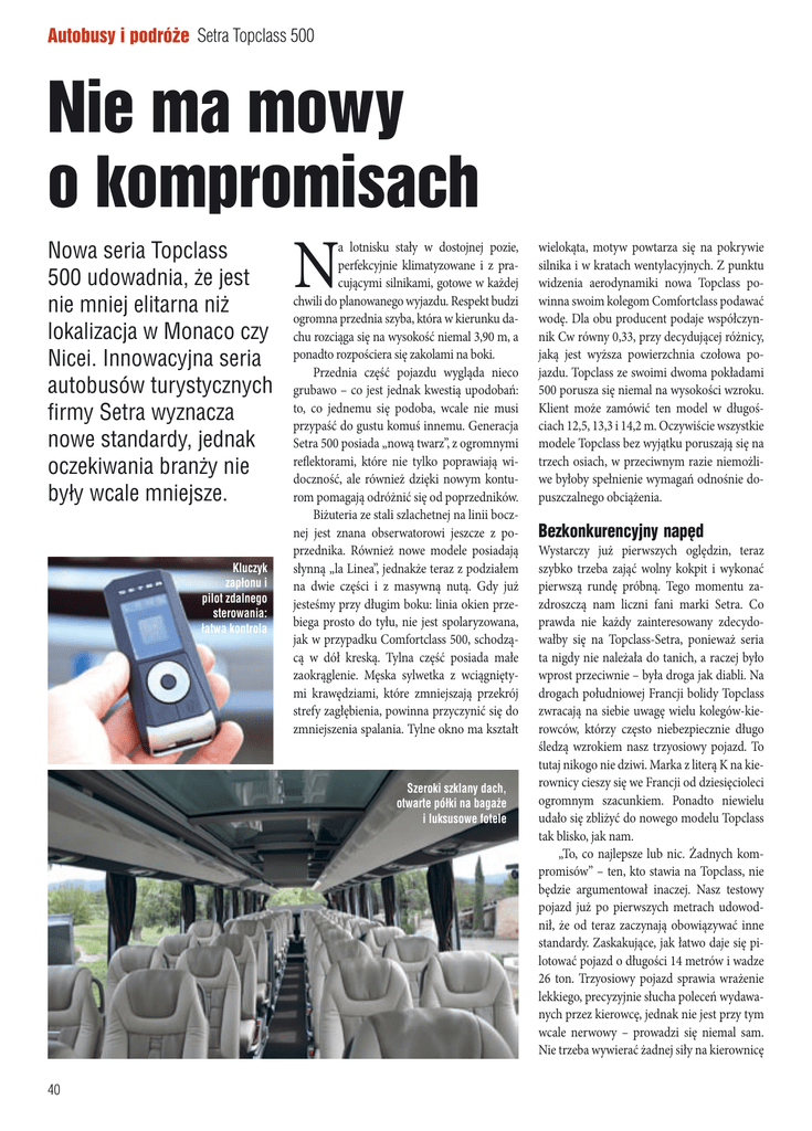 Autobusy i podróże Setra Topclass 500 Nie ma mowy o kompromisach Nowa seria Topclass 500 udowadnia, że jest nie mniej elitarna niż lokalizacja w Monaco czy Nicei. Innowacyjna seria autobusów turystycznych firmy Setra wyznacza nowe standardy, jednak oczekiwania branży nie były wcale mniejsze. Kluczyk zapłonu i pilot zdalnego sterowania: łatwa kontrola N a lotnisku stały w dostojnej pozie, perfekcyjnie klimatyzowane i z pracującymi silnikami, gotowe w każdej chwili do planowanego wyjazdu. Respekt budzi ogromna przednia szyba, która w kierunku dachu rozciąga się na wysokość niemal 3,90 m, a ponadto rozpościera się zakolami na boki. Przednia część pojazdu wygląda nieco grubawo – co jest jednak kwestią upodobań: to, co jednemu się podoba, wcale nie musi przypaść do gustu komuś innemu. Generacja Setra 500 posiada „nową twarz”, z ogromnymi reflektorami, które nie tylko poprawiają widoczność, ale również dzięki nowym konturom pomagają odróżnić się od poprzedników. Biżuteria ze stali szlachetnej na linii bocznej jest znana obserwatorowi jeszcze z poprzednika. Również nowe modele posiadają słynną „la Linea”, jednakże teraz z podziałem na dwie części i z masywną nutą. Gdy już jesteśmy przy długim boku: linia okien przebiega prosto do tyłu, nie jest spolaryzowana, jak w przypadku Comfortclass 500, schodzącą w dół kreską. Tylna część posiada małe zaokrąglenie. Męska sylwetka z wciągniętymi krawędziami, które zmniejszają przekrój strefy zagłębienia, powinna przyczynić się do zmniejszenia spalania. Tylne okno ma kształt Szeroki szklany dach, otwarte półki na bagaże i luksusowe fotele 40 wielokąta, motyw powtarza się na pokrywie silnika i w kratach wentylacyjnych. Z punktu widzenia aerodynamiki nowa Topclass powinna swoim kolegom Comfortclass podawać wodę. Dla obu producent podaje współczynnik Cw równy 0,33, przy decydującej różnicy, jaką jest wyższa powierzchnia czołowa pojazdu. Topclass ze swoimi dwoma pokładami 500 porusza się niemal na wysokości wzroku. Klient może zamówić ten model w długościach 12,5, 13,3 i 14,2 m. Oczywiście wszystkie modele Topclass bez wyjątku poruszają się na trzech osiach, w przeciwnym razie niemożliwe byłoby spełnienie wymagań odnośnie dopuszczalnego obciążenia. Bezkonkurencyjny napęd Wystarczy już pierwszych oględzin, teraz szybko trzeba zająć wolny kokpit i wykonać pierwszą rundę próbną. Tego momentu zazdroszczą nam liczni fani marki Setra. Co prawda nie każdy zainteresowany zdecydowałby się na Topclass-Setra, ponieważ seria ta nigdy nie należała do tanich, a raczej było wprost przeciwnie – była droga jak diabli. Na drogach południowej Francji bolidy Topclass zwracają na siebie uwagę wielu kolegów-kierowców, którzy często niebezpiecznie długo śledzą wzrokiem nasz trzyosiowy pojazd. To tutaj nikogo nie dziwi. Marka z literą K na kierownicy cieszy się we Francji od dziesięcioleci ogromnym szacunkiem. Ponadto niewielu udało się zbliżyć do nowego modelu Topclass tak blisko, jak nam. „To, co najlepsze lub nic. Żadnych kompromisów” – ten, kto stawia na Topclass, nie będzie argumentował inaczej. Nasz testowy pojazd już po pierwszych metrach udowodnił, że od teraz zaczynają obowiązywać inne standardy. Zaskakujące, jak łatwo daje się pilotować pojazd o długości 14 metrów i wadze 26 ton. Trzyosiowy pojazd sprawia wrażenie lekkiego, precyzyjnie słucha poleceń wydawanych przez kierowcę, jednak nie jest przy tym wcale nerwowy – prowadzi się niemal sam. Nie trzeba wywierać żadnej siły na kierownicę Precyzyjna obsługa: ciężki, trzyosiowy pojazd prowadzi się tak lekko, jak dwuosiowy ani na pedały, ośmiostopniowa przekładnia Powershift zmienia biegi bez ingerencji kierowcy w sposób niesamowicie pewny, bez żadnych szarpnięć. Kierowca zauważa jedynie moment zmiany biegów po strzałce obrotomierza, maszyna zdaje się pozostawać w tle aż do granic percepcji. Moc? Wystarczająca. Nie ma się co dziwić, skoro pojazd napędza 510 KM. Z tyłu pracuje jak zawsze standardowy rzędowy silnik sześciocylindrowy, bez trudu radząc sobie z masą 40 ton. Z nieskromnej pojemności 12,8 l można wydobyć do wyboru 350 kW/476 KM lub nawet 375 kW/510 KM, silniejszy diesel z 2500 Nm nie skąpi momentu obrotowego. Mniej niż 1000 obr./min wystarcza, aby napędzić pojazd, a przy wyższej prędkości obrotowej potężny silnik jest jeszcze bardziej żwawy. Miłośnicy ośmiocylindrowych, komfortowych jednostek napędowych zostaną szybko nawróceni – nowy rzędowy silnik sześciocylindrowy po prostu wszystko robi lepiej. Szczególnie pod względem dźwięku nigdy nie wypada ze swojej roli, to samo dotyczy poziomu hałasu na zewnątrz. Opcjonalnie można zamówić tempomat z GPS, który nazywa się PPC lub Predictive Powertrain Control i wykorzystuje do pracy dane topograficzne. W zależności od życzeń kierowcy dotyczących dynamiki jazdy utrzymuje on odpowiednią prędkość i odległość od poprzedzającego pojazdu. Wybór optymalnych biegów powoduje, że toczy się na luzie z góry, oszczędzając przy tym paliwo, w szczególności na autostradzie. O tym, jak dobrze działa PPC w serii Topclass nie mogliśmy się niestety przekonać ze względu na rodzaj trasy. Pierwsze jazdy testowe zostały już umówione. Układ jezdny jest najwyższej jakości, co już wiemy, gdyż nasz S 517 HDH poruszał się po wąskich i nie zawsze równych uliczkach wzdłuż nabrzeża w pobliżu Nicei z brawurą i niebywałą zręcznością. Precyzyjne prowadzenie kół pozwala utrzymać trzyosiowy pojazd na właściwym kursie, resorowanie o długim skoku i niezbyt twarda amortyzacja nie pozwalają, aby niedoskonałości nawierzchni były odczuwane przez pasażerów. Niech każdy mówi co chce, my wiemy jedno – Topclass jest jeszcze lepsza. Wnętrze Najwyższy czas zakosztować komfortu jazdy. Wprawdzie do przedzia