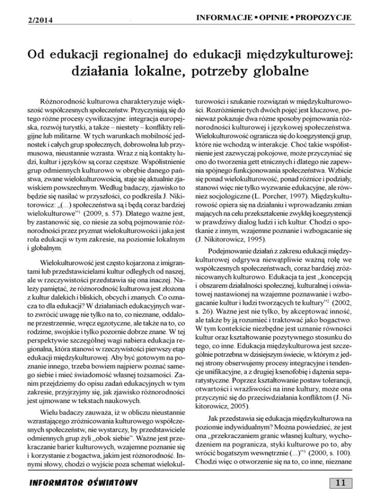 INFORMACJE § OPINIE § PROPOZYCJE 2/2014 Od edukacji regionalnej do edukacji miêdzykulturowej: dzia³ania lokalne, potrzeby globalne Ró¿norodnoæ kulturowa charakteryzuje wiêkszoæ wspó³czesnych spo³eczeñstw. Przyczyniaj¹ siê do tego ró¿ne procesy cywilizacyjne: integracja europejska, rozwój turystki, a tak¿e niestety konflikty religijne lub militarne. W tych warunkach mobilnoæ jednostek i ca³ych grup spo³ecznych, dobrowolna lub przymusowa, nieustannie wzrasta. Wraz z ni¹ kontakty ludzi, kultur i jêzyków s¹ coraz czêstsze. Wspó³istnienie grup odmiennych kulturowo w obrêbie danego pañstwa, zwane wielokulturowoci¹, staje siê aktualnie zjawiskiem powszechnym. Wed³ug badaczy, zjawisko to bêdzie siê nasilaæ w przysz³oci, co podkrela J. Nikitorowicz: (...) spo³eczeñstwa s¹ i bêd¹ coraz bardziej wielokulturowe1 (2009, s. 57). Dlatego wa¿ne jest, by zastanowiæ siê, co niesie za sob¹ pojmowanie ró¿norodnoci przez pryzmat wielokulturowoci i jaka jest rola edukacji w tym zakresie, na poziomie lokalnym i globalnym. Wielokulturowoæ jest czêsto kojarzona z imigrantami lub przedstawicielami kultur odleg³ych od naszej, ale w rzeczywistoci przedstawia siê ona inaczej. Nale¿y pamiêtaæ, ¿e ró¿norodnoæ kulturowa jest z³o¿ona z kultur dalekich i bliskich, obcych i znanych. Co oznacza to dla edukacji? W dzia³aniach edukacyjnych warto zwróciæ uwagê nie tylko na to, co nieznane, oddalone przestrzennie, wrêcz egzotyczne, ale tak¿e na to, co rodzime, swojskie i tylko pozornie dobrze znane. W tej perspektywie szczególnej wagi nabiera edukacja regionalna, która stanowi w rzeczywistoci pierwszy etap edukacji miêdzykulturowej. Aby byæ gotowym na poznanie innego, trzeba bowiem najpierw poznaæ samego siebie i mieæ wiadomoæ w³asnej to¿samoci. Zanim przejdziemy do opisu zadañ edukacyjnych w tym zakresie, przyjrzyjmy siê, jak zjawisko ró¿norodnoci jest ujmowane w tekstach naukowych. Wielu badaczy zauwa¿a, i¿ w obliczu nieustannie wzrastaj¹cego zró¿nicowania kulturowego wspó³czesnych spo³eczeñstw, nie wystarczy, by przedstawiciele odmiennych grup ¿yli obok siebie. Wa¿ne jest przekraczanie barier kulturowych, wzajemne poznanie siê i korzystanie z bogactwa, jakim jest ró¿norodnoæ. Innymi s³owy, chodzi o wyjcie poza schemat wielokul- INFORMATOR OSWIATOWY turowoci i szukanie rozwi¹zañ w miêdzykulturowoci. Rozró¿nienie tych dwóch pojêæ jest kluczowe, poniewa¿ pokazuje dwa ró¿ne sposoby pojmowania ró¿norodnoci kulturowej i jêzykowej spo³eczeñstwa. Wielokulturowoæ ogranicza siê do koegzystencji grup, które nie wchodz¹ w interakcje. Choæ takie wspó³istnienie jest zazwyczaj pokojowe, mo¿e przyczyniaæ siê ono do tworzenia gett etnicznych i dlatego nie zapewnia spójnego funkcjonowania spo³eczeñstwa. Wzbicie siê ponad wielokulturowoæ, ponad ró¿nice i podzia³y, stanowi wiêc nie tylko wyzwanie edukacyjne, ale równie¿ socjologiczne (L. Porcher, 1997). Miêdzykulturowoæ opiera siê na dzia³aniu i wprowadzaniu zmian maj¹cych na celu przekszta³cenie zwyk³ej koegzystencji w prawdziwy dialog ludzi i ich kultur. Chodzi o spotkanie z innym, wzajemne poznanie i wzbogacanie siê (J. Nikitorowicz, 1995). Podejmowanie dzia³añ z zakresu edukacji miêdzykulturowej odgrywa niew¹tpliwie wa¿n¹ rolê we wspó³czesnych spo³eczeñstwach, coraz bardziej zró¿nicowanych kulturowo. Edukacja ta jest koncepcj¹ i obszarem dzia³alnoci spo³ecznej, kulturalnej i owiatowej nastawionej na wzajemne poznawanie i wzbogacanie kultur i ludzi tworz¹cych te kultury2 (2002, s. 26). Wa¿ne jest nie tylko, by akceptowaæ innoæ, ale tak¿e by j¹ rozumieæ i traktowaæ jako bogactwo. W tym kontekcie niezbêdne jest uznanie równoci kultur oraz kszta³towanie pozytywnego stosunku do tego, co inne. Edukacja miêdzykulturowa jest szczególnie potrzebna w dzisiejszym wiecie, w którym z jednej strony obserwujemy procesy integracyjne i tendencje unifikacyjne, a z drugiej ksenofobiê i d¹¿enia separatystyczne. Poprzez kszta³towanie postaw tolerancji, otwartoci i wra¿liwoci na inne kultury, mo¿e ona przyczyniæ siê do przeciwdzia³ania konfliktom (J. Nikitorowicz, 2005). Jak przedstawia siê edukacja miêdzykulturowa na poziomie indywidualnym? Mo¿na powiedzieæ, ¿e jest ona przekraczaniem granic w³asnej kultury, wychodzeniem na pogranicza, styki kulturowe po to, aby wróciæ bogatszym wewnêtrznie (...)3 (2000, s. 100). Chodzi wiêc o otworzenie siê na to, co inne, nieznane 11 INFORMACJE § OPINIE § PROPOZYCJE 2/2014 i zaakceptowanie przenikania siê ró¿nych kultur. Nie oznacza to jednak rezygnacji z w³asnej to¿samoci, wrêcz przeciwnie: dostrzeganie innoci ma pomóc w rozwijaniu i wzbogacaniu to¿samoci jednostki (J. Nikitorowicz, 2000). Poza tym, nale¿y zauwa¿yæ, i¿ spotkanie miêdzykulturowe zaczyna siê w rzeczywistoci od spotkania siebie samego. Znajomoæ w³asnej kultury i wiadomoæ w³asnej to¿samoci s¹ bowiem niezbêdne w dialogu kultur: Jedynie w sytuacji, kiedy radzimy sobie z samymi sob¹, mo¿emy wyjæ naprzeciw innemu kulturowo4 (2004, s. 39). By byæ gotowym na poznanie innego, trzeba najpierw poznaæ w³asne korzenie i byæ w najwy¿szym stopniu wiadomym tego, kim siê jest. czyæ w tych procesach, potrafiæ otworzyæ siê na innoæ, nie zatracaj¹c tym samym siebie samego. Podkrela to J. Nikitorowicz pisz¹c: Edukacja regionalna rozpoczyna proces dialogu edukacyjnego, wzmacniaj¹c si³y jednostki poprzez poznanie i zrozumienie siebie oraz swojej najbli¿szej kultury, w efekcie pozwala dostrzegaæ odmiennoci oraz poszukiwaæ sposobów wzajemnego zrozumienia, porozumienia i wspó³pracy6 (2009, s. 219). Jeli chodzi o treci edukacji regionalnej, to mog¹ one byæ zwi¹zane m.in. z krajobrazem, dziedzictwem kulturowym (architektura, zabytki, sztuka ludowa, legendy, tradycje, ...), histori¹ i z jêzykiem (J. Nikitorowicz, 2009). Bior¹c pod Wspó³czesne spo³eczeñuwagê bogactwo polskich stwa s¹ coraz ba