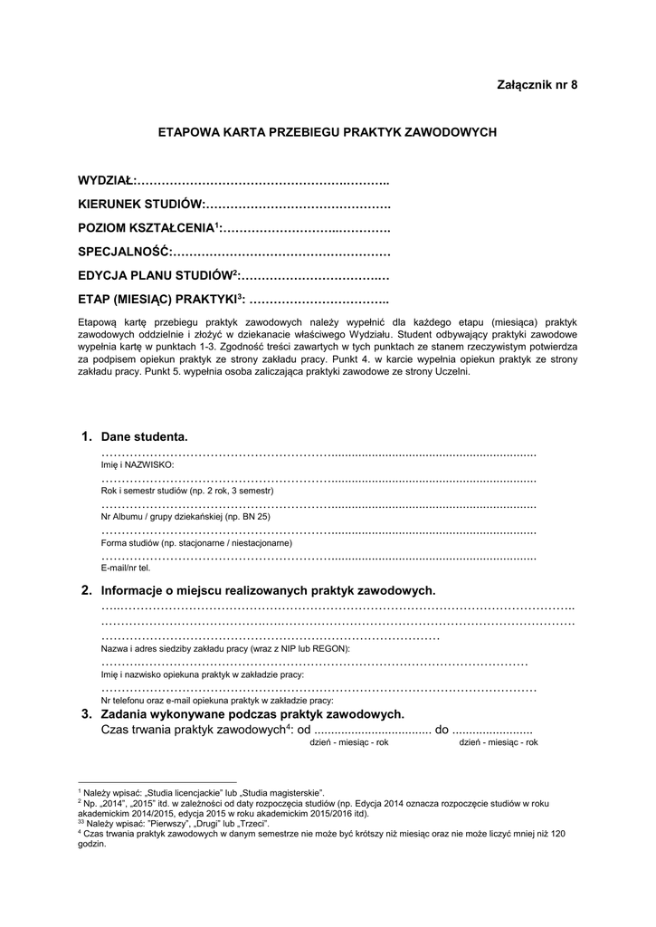 Załącznik nr 8 ETAPOWA KARTA PRZEBIEGU PRAKTYK ZAWODOWYCH WYDZIAŁ:…………………………………………….……….. KIERUNEK STUDIÓW:………………………………………. POZIOM KSZTAŁCENIA1:………………………..…………. SPECJALNOŚĆ:……………………………………………… EDYCJA PLANU STUDIÓW2:…………………………….… ETAP (MIESIĄC) PRAKTYKI3: …………………………….. Etapową kartę przebiegu praktyk zawodowych należy wypełnić dla każdego etapu (miesiąca) praktyk zawodowych oddzielnie i złożyć w dziekanacie właściwego Wydziału. Student odbywający praktyki zawodowe wypełnia kartę w punktach 1-3. Zgodność treści zawartych w tych punktach ze stanem rzeczywistym potwierdza za podpisem opiekun praktyk ze strony zakładu pracy. Punkt 4. w karcie wypełnia opiekun praktyk ze strony zakładu pracy. Punkt 5. wypełnia osoba zaliczająca praktyki zawodowe ze strony Uczelni. 1. Dane studenta. …………………………………………………............................................................. Imię i NAZWISKO: …………………………………………………............................................................. Rok i semestr studiów (np. 2 rok, 3 semestr) …………………………………………………............................................................. Nr Albumu / grupy dziekańskiej (np. BN 25) …………………………………………………............................................................. Forma studiów (np. stacjonarne / niestacjonarne) …………………………………………………............................................................. E-mail/nr tel. 2. Informacje o miejscu realizowanych praktyk zawodowych. …..………………………………………………………………………………………………….. .………………………………….….………………………………………………………………. ………………………………………………………………………… Nazwa i adres siedziby zakładu pracy (wraz z NIP lub REGON): ……….…………………………………………………………………………………… Imię i nazwisko opiekuna praktyk w zakładzie pracy: ……………………………………………………………………………………………… Nr telefonu oraz e-mail opiekuna praktyk w zakładzie pracy: 3. Zadania wykonywane podczas praktyk zawodowych. Czas trwania praktyk zawodowych4: od ................................... do ........................ dzień - miesiąc - rok dzień - miesiąc - rok Należy wpisać: „Studia licencjackie” lub „Studia magisterskie”. Np. „2014”, „2015” itd. w zależności od daty rozpoczęcia studiów (np. Edycja 2014 oznacza rozpoczęcie studiów w roku akademickim 2014/2015, edycja 2015 w roku akademickim 2015/2016 itd). 33 Należy wpisać: ”Pierwszy”, „Drugi” lub „Trzeci”. 4 Czas trwania praktyk zawodowych w danym semestrze nie może być krótszy niż miesiąc oraz nie może liczyć mniej niż 120 godzin. 1 2 Dział, w którym odbywano praktyki Termin realizacji praktyk w dniach od - do wraz z liczbą godzin …………………………..……… (Podpis studenta) Wyszczególnienie realizowanych zadań podczas praktyk, uwagi oraz wnioski praktykanta co do wykonywanej pracy ………..…................................... (Data i podpis opiekuna praktyki w zakładzie pracy) 4. OPINIA opiekuna praktyk ze strony zakładu pracy o realizacji praktyk zawodowych. a) sposób weryfikacji oraz potwierdzenie osiągnięcia założonych efektów kształcenia: Efekty kształcenia: Sposób weryfikacji efektów kształcenia Potwierdzenie osiągnięcia założonych efektów kształcenia5* (forma zaliczeń) Wiedza: 1 2 3 4 Umiejętności: 1 2 3 4 Kompetencje społeczne: 1 2 3 4 b) ocena postawy praktykanta (wg skali: celujący - 6, bardzo dobry - 5, dobry plus - +4, dobry - 4, dostateczny plus - +3, dostateczny - 3, niedostateczny - 2): obowiązkowość: .................................................................................................. samodzielność: ................................................................................................... punktualność: ..................................................................................................... kreatywność: ...................................................................................................... pracowitość: ....................................................................................................... Należy wpisać zal./nzal. przy każdym efekcie kształcenia. Praktyki zawodowe zostaną zaliczone studentowi tylko w przypadku osiągnięcia wszystkich założonych efektów kształcenia. 5 samokrytycyzm: .................................................................................................. odpowiedzialność: .............................................................................................. empatia: .............................................................................................................. nastawienie do wychowanków/klientów zakładu pracy (osób będących podmiotem oddziaływania ze strony praktykanta):……………………...................... nastawienie do pracowników zakładu pracy……………………………………….. inne cechy, uznane za ważne przez opiekuna w danym miejscu praktyki:…………………………………………………………………………………………… ……………………………………………………………………………………………………… ……………………………………………………………………………… c) dodatkowe uwagi opiekuna praktyk w zakładzie pracy: ........................