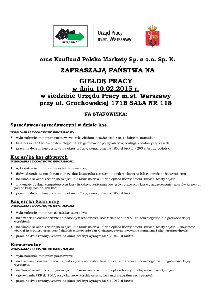 oraz Kaufland Polska Markety Sp. z o.o. Sp. K. ZAPRASZAJĄ PAŃSTWA NA GIEŁDĘ PRACY w dniu 10.02.2015 r. w siedzibie Urzędu Pracy m.st. Warszawy przy ul. Grochowskiej 171B SALA NR 118 NA STANOWISKA: Sprzedawca/sprzedawczyni w dziale kas WYMAGANIA I DODATKOWE INFORMACJE: • • • wykształcenie: minimum podstawowe; mile widziane doświadczenie na podobnym stanowisku; książeczka sanitarno – epidemiologiczna lub gotowość do jej wyrobienia; obsługa klientów przy kasach; praca na dwie zmiany, umowa na okres próbny; wynagrodzenie 1850 zł brutto + 200 zł brutto dodatek. Kasjer/ka kas głównych WYMAGANIA I DODATKOWE INFORMACJE: • • • • • wykształcenie: minimum zasadnicze zawodowe; doświadczenie na podobnym stanowisku; książeczka sanitarno – epidemiologiczna lub gotowość do jej wyrobienia; możliwość szkolenia w innym miejscu niż zamieszkania – firma opłaca koszty hotelu, zwraca koszty dojazdu; znajomość obsługi komputera oraz kasy fiskalnej; rozliczanie kasjerów, prace przy kasie ; nadzorowanie raportów kasowych, pomoc kasjerom na linii kas; praca na dwie zmiany, umowa na okres próbny; wynagrodzenie 1850 zł brutto. Kasjer/ka Scanninig WYMAGANIA I DODATKOWE INFORMACJE: • • • • wykształcenie: minimum zasadnicze zawodowe; mile widziane doświadczenie na podobnym stanowisku; książeczka sanitarno – epidemiologiczna lub gotowość do jej wyrobienia; możliwość szkolenia w innym miejscu niż zamieszkania – firma opłaca koszty hotelu, zwraca koszty dojazdu; znajomość obsługi komputera oraz kasy fiskalnej; skanowanie cen w sklepie, przygotowywanie wizualizacji akcji promocyjnych; praca na dwie zmiany, umowa na okres próbny; wynagrodzenie 1850 zł brutto. Konserwator WYMAGANIA I DODATKOWE INFORMACJE: • • • • • wykształcenie: minimum podstawowe; mile widziane doświadczenie na podobnym stanowisku; książeczka sanitarno – epidemiologiczna lub gotowość do jej wyrobienia; możliwość szkolenia w innym miejscu niż zamieszkania – firma opłaca koszty hotelu, zwraca koszty dojazdu; uprawnienia SEP do 1 KV, prace konserwatorskie oraz nadzór nad pracą firm zewnętrznych; praca na dwie zmiany, umowa na okres próbny; wynagrodzenie 1950 zł brutto. Pracownik Porządkowy WYMAGANIA I DODATKOWE INFORMACJE: • • wykształcenie: minimum podstawowe; mile widziane doświadczenie na podobnym stanowisku; książeczka sanitarno – epidemiologiczna lub gotowość do jej wyrobienia; dbanie o porządek czystość, higienę w markecie; • praca na dwie zmiany, umowa na okres próbny; wynagrodzenie 1850 zł brutto + dodatek 200 zł brutto. Pracownik Działu Przyjęcia Towaru WYMAGANIA I DODATKOWE INFORMACJE: • • • wykształcenie: minimum zasadnicze zawodowe; możliwość szkolenia w innym miejscu niż zamieszkania – firma opłaca koszty hotelu, zwraca koszty dojazdu; mile widziane doświadczenie na podobnym stanowisku; książeczka sanitarno – epidemiologiczna; uprawnienia do obsługi wózków widłowych, przyjęcia towaru, praca na magazynie; • praca na dwie zmiany, umowa na okres próbny; wynagrodzenie 1900 zł brutto. Kierownik Grupy w dziale art. świeżych WYMAGANIA I DODATKOWE INFORMACJE: • • • • wykształcenie: minimum zasadnicze zawodowe; doświadczenie na stanowisku kierowniczym; książeczka sanitarno – epidemiologiczna lub gotowość do jej wyrobienia; umiejętność pracy w grupie, zarządzaniem niewielkim zespołem, zatowarowanie działu, ekspozycja towaru, zapewnienie prawidłowego przebiegu składania i realizacji zamówień; • możliwość szkolenia w innym miejscu niż zamieszkania – firma opłaca koszty hotelu, zwraca koszty dojazdu; • praca na dwie zmiany, umowa na okres próbny; wynagrodzenie 2500 zł brutto. Pracownik Informacji WYMAGANIA I DODATKOWE INFORMACJE: • wykształcenie: minimum zasadnicze zawodowe; • doświadczenie mile widziane na podobnym stanowisku; • książeczka sanitarno – epidemiologiczna lub gotowość do jej wyrobienia; • obsługa klientów, rozpatrywanie reklamacji, dokonywanie zwrotów; obsługa centrali komunikacyjnej; • możliwość szkolenia w innym miejscu niż zamieszkania – firma opłaca koszty hotelu, zwraca koszty dojazdu; • praca na dwie zmiany, umowa na okres próbny; wynagrodzenie 1850 zł brutto. Referent ds. administracyjnych WYMAGANIA I DODATKOWE INFORMACJE: • • • • • wykształcenie: minimum zasadnicze zawodowe; doświadczenie mile widziane na podobnym stanowisku; książeczka sanitarno – epidemiologiczna lub gotowość do jej wyrobienia; możliwość szkolenia w innym miejscu niż zamieszkania – firma opłaca koszty hotelu, zwraca koszty dojazdu; dobra obsługa komputera, mile widziana znajomość SAP; opracowywanie dokumentów, kontrola stanu zapasów, księgowanie dostaw, praca również na hali marketu; • praca na dwie zmiany, umowa na okres próbny; wynagrodzenie 1850 zł brutto. Referent ds. administracyjno-kontrolnych WYMAGANIA I DODATKOWE INFORMACJE: • • • • • • wykształcenie: minimum zasadnicze zawodowe; doświadczenie mile widziane na podobnym stanowisku; książeczka sanitarno – epidemiologiczna lub gotowość do jej wyrobienia; możliwość szkolenia w innym miejscu niż zamieszkania – firma opłaca koszty hotelu, zwraca koszty dojazdu; dobra obsługa komputera, mile widziana znajomość SAP; prowadzenie kontroli przestrzegania zasad w obszarze jakości, świeżości artykułów, prowadzenie kontroli wewnętrznych, porównań cenowych; praca na dwie zmiany, umowa na okres próbny; wynagrodzenie 1850 zł brutto. Wszystkie osoby zainteresowane prosimy o zgłaszanie się do pośredników pracy w siedzibie Urzędu przy ul. Ciołka 10a w pokojach nr 203, 204, 212, 213, 215, 216, 217 oraz w siedzibie Urzędu przy ul. Grochowskiej 171b na stanowiskach: 2-16.