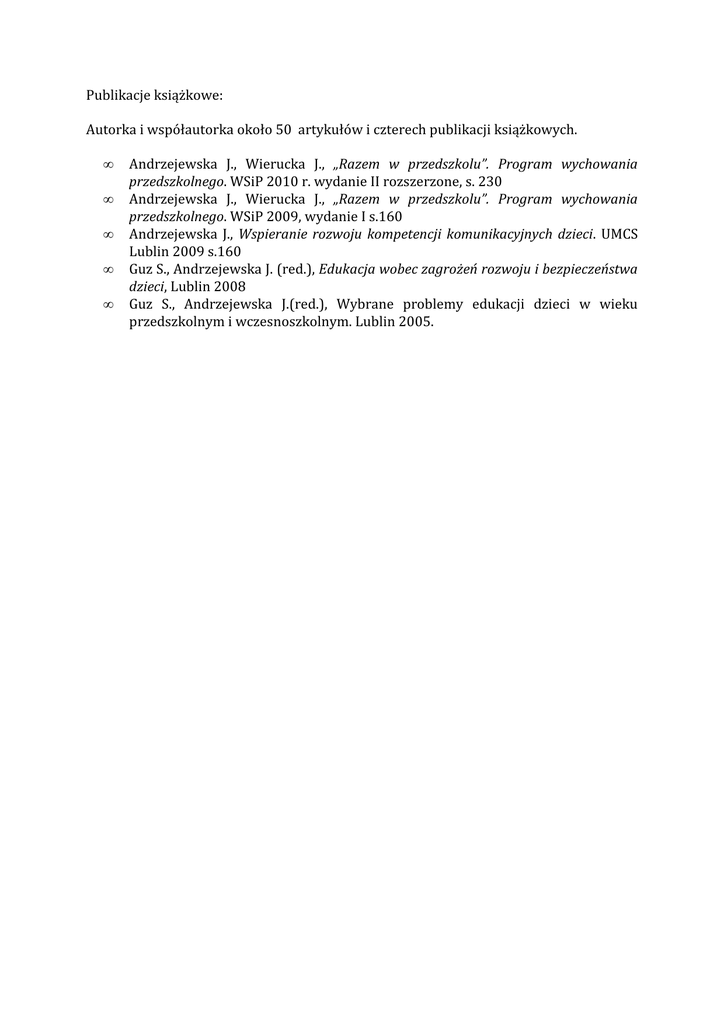 Publikacje książkowe: Autorka i współautorka około 50 artykułów i czterech publikacji książkowych. • • • • • Andrzejewska J., Wierucka J., „Razem w przedszkolu”. Program wychowania przedszkolnego. WSiP 2010 r. wydanie II rozszerzone, s. 230 Andrzejewska J., Wierucka J., „Razem w przedszkolu”. Program wychowania przedszkolnego. WSiP 2009, wydanie I s.160 Andrzejewska J., Wspieranie rozwoju kompetencji komunikacyjnych dzieci. UMCS Lublin 2009 s.160 Guz S., Andrzejewska J. (red.), Edukacja wobec zagrożeń rozwoju i bezpieczeństwa dzieci, Lublin 2008 Guz S., Andrzejewska J.(red.), Wybrane problemy edukacji dzieci w wieku przedszkolnym i wczesnoszkolnym. Lublin 2005.