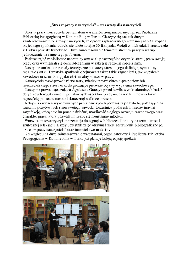 „Stres w pracy nauczyciela” – warsztaty dla nauczycieli Stres w pracy nauczyciela był tematem warsztatów zorganizowanych przez Publiczną Bibliotekę Pedagogiczną w Koninie Filię w Turku. Cieszyły się one tak dużym zainteresowaniem ze strony nauczycieli, że oprócz zaplanowanego wcześniej na 23 listopada br. jednego spotkania, odbyło się także kolejne 30 listopada. Wzięli w nich udział nauczyciele z Turku i powiatu tureckiego. Duże zainteresowanie tematem stresu w pracy wskazuje jednocześnie na rangę tego problemu. Podczas zajęć w bibliotece uczestnicy omawiali poszczególne czynniki stresujące w swojej pracy oraz wymieniali się doświadczeniami w zakresie radzenia sobie z nimi. Następnie omówione zostały teoretyczne podstawy stresu – jego definicje, symptomy i możliwe skutki. Tematyka spotkania obejmowała także takie zagadnienia, jak wypalenie zawodowe oraz mobbing jako ekstremalny stresor w pracy. Nauczyciele rozwiązywali różne testy, między innymi określające poziom ich nauczycielskiego stresu oraz diagnozujące pierwsze objawy wypalenia zawodowego. Następnie prowadząca zajęcia Agnieszka Graczyk przedstawiła wyniki aktualnych badań dotyczących negatywnych i pozytywnych aspektów pracy nauczycieli. Omówiła także najczęściej polecane techniki skutecznej walki ze stresem. Jednym z ćwiczeń wykonywanych przez nauczycieli podczas zajęć było to, polegające na szukaniu pozytywnych stron swojego zawodu. Uczestnicy podkreślali między innymi satysfakcję, którą daje im praca z dziećmi, możliwość ciągłego rozwoju zawodowego oraz charakter pracy, który pozwala im „czuć się nieustannie młodym”. Warsztatom towarzyszyła prezentacja dostępnej w bibliotece literatury na temat stresu i skutecznej relaksacji. Każdy uczestnik zajęć otrzymał także zestawienie bibliograficzne pt. „Stres w pracy nauczyciela” oraz inne ciekawe materiały. Ze względu na duże zainteresowanie warsztatami, organizator czyli Publiczna Biblioteka Pedagogiczna w Koninie Filia w Turku już planuje koleją edycję spotkań.