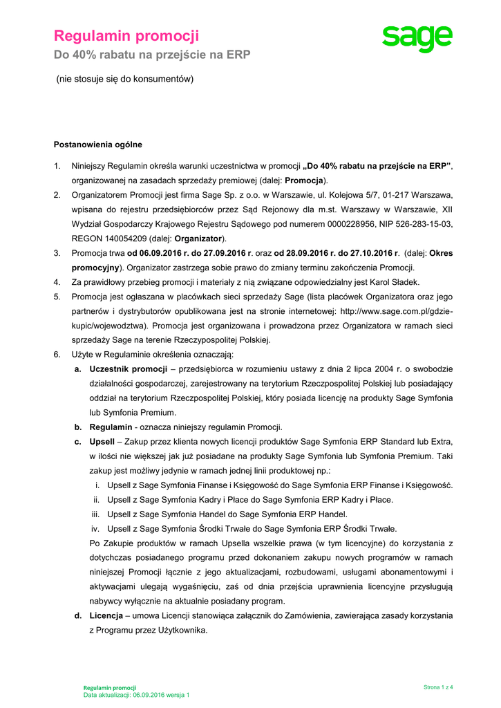 Regulamin promocji Do 40% rabatu na przejście na ERP (nie stosuje się do konsumentów) Postanowienia ogólne 1. Niniejszy Regulamin określa warunki uczestnictwa w promocji „Do 40% rabatu na przejście na ERP”, organizowanej na zasadach sprzedaży premiowej (dalej: Promocja). 2. Organizatorem Promocji jest firma Sage Sp. z o.o. w Warszawie, ul. Kolejowa 5/7, 01-217 Warszawa, wpisana do rejestru przedsiębiorców przez Sąd Rejonowy dla m.st. Warszawy w Warszawie, XII Wydział Gospodarczy Krajowego Rejestru Sądowego pod numerem 0000228956, NIP 526-283-15-03, REGON 140054209 (dalej: Organizator). 3. Promocja trwa od 06.09.2016 r. do 27.09.2016 r. oraz od 28.09.2016 r. do 27.10.2016 r. (dalej: Okres promocyjny). Organizator zastrzega sobie prawo do zmiany terminu zakończenia Promocji. 4. Za prawidłowy przebieg promocji i materiały z nią związane odpowiedzialny jest Karol Sładek. 5. Promocja jest ogłaszana w placówkach sieci sprzedaży Sage (lista placówek Organizatora oraz jego partnerów i dystrybutorów opublikowana jest na stronie internetowej: http://www.sage.com.pl/gdziekupic/wojewodztwa). Promocja jest organizowana i prowadzona przez Organizatora w ramach sieci sprzedaży Sage na terenie Rzeczypospolitej Polskiej. 6. Użyte w Regulaminie określenia oznaczają: a. Uczestnik promocji – przedsiębiorca w rozumieniu ustawy z dnia 2 lipca 2004 r. o swobodzie działalności gospodarczej, zarejestrowany na terytorium Rzeczpospolitej Polskiej lub posiadający oddział na terytorium Rzeczpospolitej Polskiej, który posiada licencję na produkty Sage Symfonia lub Symfonia Premium. b. Regulamin - oznacza niniejszy regulamin Promocji. c. Upsell – Zakup przez klienta nowych licencji produktów Sage Symfonia ERP Standard lub Extra, w ilości nie większej jak już posiadane na produkty Sage Symfonia lub Symfonia Premium. Taki zakup jest możliwy jedynie w ramach jednej linii produktowej np.: i. Upsell z Sage Symfonia Finanse i Księgowość do Sage Symfonia ERP Finanse i Księgowość. ii. Upsell z Sage Symfonia Kadry i Płace do Sage Symfonia ERP Kadry i Płace. iii. Upsell z Sage Symfonia Handel do Sage Symfonia ERP Handel. iv. Upsell z Sage Symfonia Środki Trwałe do Sage Symfonia ERP Środki Trwałe. Po Zakupie produktów w ramach Upsella wszelkie prawa (w tym licencyjne) do korzystania z dotychczas posiadanego programu przed dokonaniem zakupu nowych programów w ramach niniejszej Promocji łącznie z jego aktualizacjami, rozbudowami, usługami abonamentowymi i aktywacjami ulegają wygaśnięciu, zaś od dnia przejścia uprawnienia licencyjne przysługują nabywcy wyłącznie na aktualnie posiadany program. d. Licencja – umowa Licencji stanowiąca załącznik do Zamówienia, zawierająca zasady korzystania z Programu przez Użytkownika. Regulamin promocji Data aktualizacji: 06.09.2016 wersja 1 Strona 1 z 4 e. Program w subskrypcji / Subskrypcja – oprogramowanie komputerowe stanowiące część systemów Sage Symfonia ERP w subskrypcji, co do którego Klient uzyskuje uprawnienie do czasowego korzystania w ramach usługi Sage Gwarancja Podstawowa+, Gwarancja Komfort+ lub VIP+ na zasadach określonych właściwym regulaminem świadczenia usług Sage Gwarancja dostępnym na stronie Sage www.sage.com.pl w okresie obowiązywania Programu w subskrypcji i w zakresie wskazanym w Licencji. Zasady promocji 7. Promocja skierowana jest do Uczestników promocji spełniających warunki wskazane w niniejszym Regulaminie, którzy w Okresie promocyjnym złożą u Organizatora zamówienie na zasadach objętych Promocją. 8. Promocja polega na oferowaniu Uczestnikom promocji spełniającym warunki wskazane w niniejszym Regulaminie, produktów Sage Symfonia ERP z rabatem opisanym w poniższych tabelach w przypadku Upsell’a: a. Przy zakupie produktów Sage w Licencji Uczestnik promocji może otrzymać następujące rabaty przy zakupie wybranej Gwarancji. W Okresie promocyjnym 6.09.2016 – 27.09.2016 przy zakupie Gwarancji: Podstawowej Premium Komfort VIP Rabat na Upsell produktów Sage Symfonia ERP do 25% 30% 30% 40% Rabat na dodatkowe produkty Sage Symfonia ERP i stanowiska - 40% 40% 50% Rabat na zakup Sage eAudytora - 20% 20% 30% W Okresie promocyjnym 28.09.2016 – 27.10.2016 przy zakupie Gwarancji: Podstawowej Premium Komfort VIP Rabat na Upsell produktów Sage Symfonia ERP do 25% 30% 30% 35% Rabat na dodatkowe produkty Sage Symfonia ERP i stanowiska - 20% 20% 35% Rabat na zakup Sage eAudytora - 20% 20% 30% Regulamin promocji Data aktualizacji: 06.09.2016 wersja 1 Strona 2 z 4 b. Przy zakupie produktów Sage w Subskrypcji Uczestnik promocji może otrzymać następujące rabaty przy zakupie wybranej Gwarancji. W Okresie promocyjnym 6.09.2016 – 27.09.2016 przy zakupie Gwarancji: Podstawowej+ Komfort+ VIP+ Rabat na Upsell produktów Sage Symfonia ERP do 25% 30% 40% Rabat na dodatkowe produkty Sage Symfonia ERP i stanowiska - 40% 50% Rabat na zakup Sage eAudytora - 20% 30% W Okresie promocyjnym 28.09.2016 – 27.10.2016 przy zakupie Gwarancji: Podstawowej+ Komfort+ VIP+ Rabat na Upsell produktów Sage Symfonia ERP do 25% 30% 40% Rabat na dodatkowe produkty Sage Symfonia ERP i stanowiska - 40% 50% Rabat na zakup Sage eAudytora - 20% 30% 9. Rabaty o których mowa w punkcie 8. niniejszego regulaminu tj: a. na Upsell produktów Sage Symfonia ERP oraz b. na dodatkowe produkty Sage Symfonia ERP i stanowiska c. na zakup Sage e-Audytor Mogą zostać przydzielone jedynie w ramach jednego zakupu produktów Sage Symfonia ERP w ramach Upsell’a. Postanowienia końcowe 10. Uczestnictwo w Promocji oznacza akceptację zasad określonych w niniejszym Regulaminie. 11. Promocja nie jest grą losową, zakładem wzajemnym, ani grą na automatach których wynik zależy od przypadku w rozumieniu art. 2 ustawy z dnia 19 listopada 2009 r. o grach hazardowych. 12. Zasady licencjonowania Programów określa każdorazowo umowa licencji. Regulamin promocji Data aktualizacji: 06.09.2016 wersja 1 Strona 3 z 4 13. 
