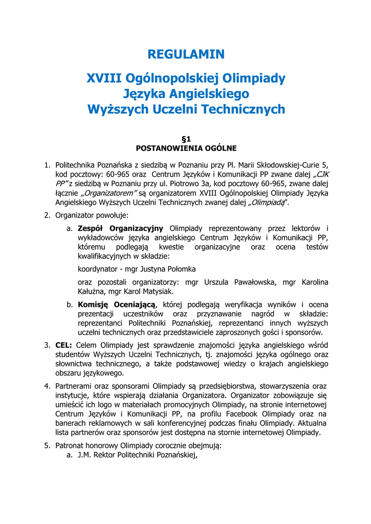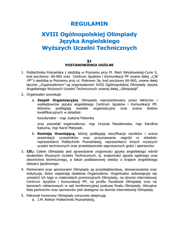 REGULAMIN XVIII Ogólnopolskiej Olimpiady Języka Angielskiego Wyższych Uczelni Technicznych §1 POSTANOWIENIA OGÓLNE 1. Politechnika Poznańska z siedzibą w Poznaniu przy Pl. Marii Skłodowskiej-Curie 5, kod pocztowy: 60-965 oraz Centrum Języków i Komunikacji PP zwane dalej „CJK PP” z siedzibą w Poznaniu przy ul. Piotrowo 3a, kod pocztowy 60-965, zwane dalej łącznie „Organizatorem” są organizatorem XVIII Ogólnopolskiej Olimpiady Języka Angielskiego Wyższych Uczelni Technicznych zwanej dalej „Olimpiadą”. 2. Organizator powołuje: a. Zespół Organizacyjny Olimpiady reprezentowany przez lektorów i wykładowców języka angielskiego Centrum Języków i Komunikacji PP, któremu podlegają kwestie organizacyjne oraz ocena testów kwalifikacyjnych w składzie: koordynator - mgr Justyna Połomka oraz pozostali organizatorzy: mgr Urszula Pawałowska, mgr Karolina Kałużna, mgr Karol Matysiak. b. Komisję Oceniającą, której podlegają weryfikacja wyników i ocena prezentacji uczestników oraz przyznawanie nagród w składzie: reprezentanci Politechniki Poznańskiej, reprezentanci innych wyższych uczelni technicznych oraz przedstawiciele zaproszonych gości i sponsorów. 3. CEL: Celem Olimpiady jest sprawdzenie znajomości języka angielskiego wśród studentów Wyższych Uczelni Technicznych, tj. znajomości języka ogólnego oraz słownictwa technicznego, a także podstawowej wiedzy o krajach angielskiego obszaru językowego. 4. Partnerami oraz sponsorami Olimpiady są przedsiębiorstwa, stowarzyszenia oraz instytucje, które wspierają działania Organizatora. Organizator zobowiązuje się umieścić ich logo w materiałach promocyjnych Olimpiady, na stronie internetowej Centrum Języków i Komunikacji PP, na profilu Facebook Olimpiady oraz na banerach reklamowych w sali konferencyjnej podczas finału Olimpiady. Aktualna lista partnerów oraz sponsorów jest dostępna na stornie internetowej Olimpiady. 5. Patronat honorowy Olimpiady corocznie obejmują: a. J.M. Rektor Politechniki Poznańskiej, b. Konsul Honorowy Zjednoczonego Królestwa Wielkiej Brytanii i Irlandii Północnej, c. Prezes Towarzystwa Polsko-Irlandzkiego. §2 UCZESTNICY 1. Uczestnikami Olimpiady są studenci studiów stacjonarnych i niestacjonarnych I, II i III stopnia Wyższych Uczelni Technicznych w Polsce, którzy zgłoszą się we wskazanym w ogłoszeniach terminie do Sekretariatu Studium Języków Obcych danej uczelni. Zapisy dokonywane są na podstawie ważnej legitymacji studenckiej. 2. Postanowienia szczegółowe dotyczące uczestnictwa: a. W Olimpiadzie mogą brać udział uczestnicy poprzednich Olimpiad Języka Angielskiego za wyjątkiem laureatów z miejsc od 1 do 5 (z poprzednich edycji Olimpiady). Za weryfikację studentów zgłaszających się do I etapu odpowiadają koordynatorzy z poszczególnych Uczelni. b. W Olimpiadzie mogą brać udział studenci obcokrajowcy, za wyjątkiem studentów pochodzących z krajów, w których język angielski jest językiem urzędowym. c. Uczestnikami Olimpiady nie mogą humanistycznych oraz filologicznych. być studenci kierunków §3 ORGANIZACJA OLIMPIADY 1. XVIII Ogólnopolska Olimpiada Języka Technicznych jest Olimpiadą dwuetapową. Angielskiego Wyższych Uczelni a. Etap I- półfinał ogólnopolski, odbywa się w uczelniach macierzystych uczestników, b. Etap II – finał ogólnopolski, odbywa się na terenie Politechniki Poznańskiej. §4 ETAP I 1. Etap I odbędzie się w piątek 02.12.2016 w godzinach 15.15-17.15. Są to eliminacje wewnątrzuczelniane pisemne, bazujące na teście przygotowanym w Centrum Języków i Komunikacji PP w Poznaniu. 2. Studenci zapisują się na Olimpiadę w swoich macierzystych uczelniach u koordynatora Olimpiady danej uczelni. 2 3. Studenci Politechniki Poznańskiej zapisują się na Olimpiadę mailowo - zakładka Olimpiady na stronie CJK PP. 4. Zapisy na Olimpiadę w całym kraju kończą się 25.11.2016 r. o godz. 15.00. 5. Test na etap wewnątrzuczelniany jest wysyłany w formie pisemnej, listem priorytetowym i nie ma możliwości otrzymania go w formie elektronicznej. 6. Organizatorzy zastrzegają sobie prawa autorskie do testów, w związku z tym wyklucza się możliwość ich kopiowania do celów komercyjnych. Testy mogą być powielane tylko i wyłącznie w celu wykorzystania ich w etapie wewnątrzuczelnianym. 7. Koordynatorzy przekazują listę uczestników po zamknięciu rejestracji na danej uczelni tj. 25.11.2016 na adres mailowy wskazany przez koordynatora Olimpiady CJK PP. 8. Organizatorzy pierwszego etapu (poszczególne uczelnie) są zobowiązani do przesłania wyników w tabelce na adres mailowy Olimpiady w formie pliku Excel (do pobrania na stronie: http://www.clc.put.poznan.pl) w terminie do 09.12.2016 oraz przesłanie testów wszystkich uczestników i płyt CD pocztą na adres CJK Politechniki Poznańskiej (adres na stronie CJK PP), listem poleconym z dopiskiem OLIMPIADA. 9. Testy muszą być sprawdzone przez dwóch lektorów i opatrzone dwoma podpisami. 10. Wyniki łącznie z listą uczestników kwalifikujących się do II etapu ogólnopolskiego zostaną ogłoszone do dnia 20.12.2016 r. na stronie CJK PP oraz przesłane drogą mailową do poszczególnych uczelni. 11. Czas trwania testu: 2 godziny zegarowe – nie ma przerwy. 12. Organizatorzy zastrzegają sobie prawo wyrywkowego kontrolowania testów nadesłanych z poszczególnych uczelni. 13. Osoby zakwalifikowane do kolejnego etapu są zobowiązane do przygotowania prezentacji w formie multimedialnej. Temat prezentacji: "Do not go where the path may lead, go instead where there is no path and leave a trail." Ralph Waldo Emerson 14. Prezentacja w etapie finałowym musi być przygotowana na dwóch różnych nośnikach elektronicznych. Studenci są zobowiązani do korzystania z laptopa udostępnionego przez CJK PP. Zabrania się używania prywatnych laptopów uczestników. 15. Czas trwania prezentacji nie może przekroczyć 10 minut. 3 §5 ETAP 