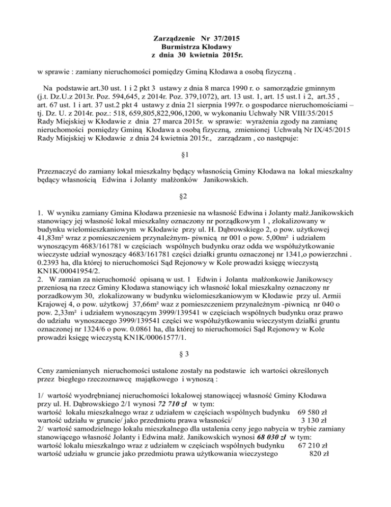 Zarządzenie Nr 37/2015 Burmistrza Kłodawy z dnia 30 kwietnia 2015r. w sprawie : zamiany nieruchomości pomiędzy Gminą Kłodawa a osobą fizyczną . Na podstawie art.30 ust. 1 i 2 pkt 3 ustawy z dnia 8 marca 1990 r. o samorządzie gminnym (j.t. Dz.U.z 2013r. Poz. 594,645, z 2014r. Poz. 379,1072), art. 13 ust. 1, art. 15 ust.1 i 2, art.35 , art. 67 ust. 1 i art. 37 ust.2 pkt 4 ustawy z dnia 21 sierpnia 1997r. o gospodarce nieruchomościami – tj. Dz. U. z 2014r. poz.: 518, 659,805,822,906,1200, w wykonaniu Uchwały NR VIII/35/2015 Rady Miejskiej w Kłodawie z dnia 27 marca 2015r. w sprawie: wyrażenia zgody na zamianę nieruchomości pomiędzy Gminą Kłodawa a osobą fizyczną, zmienionej Uchwałą Nr IX/45/2015 Rady Miejskiej w Kłodawie z dnia 24 kwietnia 2015r., zarządzam , co następuje: §1 Przeznaczyć do zamiany lokal mieszkalny będący własnością Gminy Kłodawa na lokal mieszkalny będący własnością Edwina i Jolanty małżonków Janikowskich. §2 1. W wyniku zamiany Gmina Kłodawa przeniesie na własność Edwina i Jolanty małż.Janikowskich stanowiący jej własność lokal mieszkalny oznaczony nr porządkowym 1 , zlokalizowany w budynku wielomieszkaniowym w Kłodawie przy ul. H. Dąbrowskiego 2, o pow. użytkowej 41,83m² wraz z pomieszczeniem przynależnym- piwnicą nr 001 o pow. 5,00m² i udziałem wynoszącym 4683/161781 w częściach wspólnych budynku oraz odda we współużytkowanie wieczyste udział wynoszący 4683/161781 części działki gruntu oznaczonej nr 1341,o powierzchni . 0.2393 ha, dla której to nieruchomości Sąd Rejonowy w Kole prowadzi księgę wieczystą KN1K/00041954/2. 2. W zamian za nieruchomość opisaną w ust. 1 Edwin i Jolanta małżonkowie Janikowscy przeniosą na rzecz Gminy Kłodawa stanowiący ich własność lokal mieszkalny oznaczony nr porzadkowym 30, zlokalizowany w budynku wielomieszkaniowym w Kłodawie przy ul. Armii Krajowej 4, o pow. użytkowj 37,66m² waz z pomieszczeniem przynależnym -piwnicą nr 040 o pow. 2,33m² i udziałem wynoszącym 3999/139541 w częściach wspólnych budynku oraz prawo do udziału wynoszacego 3999/139541 części we współużytkowaniu wieczystym działki gruntu oznaczonej nr 1324/6 o pow. 0.0861 ha, dla której to nieruchomości Sąd Rejonowy w Kole prowadzi księgę wieczystą KN1K/00061577/1. §3 Ceny zamienianych nieruchomości ustalone zostały na podstawie ich wartości określonych przez biegłego rzeczoznawcę majątkowego i wynoszą : 1/ wartość wyodrębnianej nieruchomości lokalowej stanowiącej własność Gminy Kłodawa przy ul. H. Dąbrowskiego 2/1 wynosi 72 710 zł w tym: wartość lokalu mieszkalnego wraz z udziałem w częściach wspólnych budynku 69 580 zł wartość udziału w gruncie/ jako przedmiotu prawa własności/ 3 130 zł 2/ wartość samodzielnego lokalu mieszkalnego dla ustalenia ceny jego nabycia w trybie zamiany stanowiącego własność Jolanty i Edwina małż. Janikowskich wynosi 68 030 zł w tym: wartość lokalu mieszkalngo wraz z udziałem w częściach wspólnych budynku 67 210 zł wartość udziału w gruncie jako przedmiotu prawa użytkowania wieczystego 820 zł §4 1.Wzajemne rozliczenie wartości zamienianych nieruchomości natępuje za dopłatą przez Edwina i Jolantę małż. Janikowskich kwoty 4.680 zł /słownie : cztery tys sześćset osiemdziesiat zł + podatek vat stawka zw na rzecz Gminy Kłodawa. Kwota ta jest równa różnicy wartości zamienianych nieruchomości. 2. Koszty związane z zamianą lokali mieszkalnych w całości ponoszą Wnioskujący o zamianę . §5 Wykaz nieruchomości lokalowych przeznaczonych do zamiany o których mowa w § 2 stanowi załączniki do niniejszego Zarządzenia. §6 Wykaz nieruchomości o których mowa w § 5 podlega wywieszeniu na okres 21 dni na tablicy ogłoszeń w siedzibie Urzędu Miasta i Gminy w Kłodawie a informację o wywieszeniu tego wykazu podana zostanie do publicznej wiadomości poprzez ogłoszenie w prasie lokalnej a także na stronach internetowych Urzędu www.bip.klodawa.wlkp.pl §7 Wykonanie Zarządzenia powierza się Koordynatorowi Referatu Gospodarki Nieruchomościami i Rolnictwa §8 Zarządzenie wchodzi w życie z dniem podjęcia. Burmistrz Kłodawy Robert Olejniczak Załącznik do Zarządzenia Nr 37/ 2015 Burmistrza Kłodawy z dn. 30 kwietnia 2015r. Wykaz nieruchomości lokalowych przeznaczonych do zamiany pomiędzy Gminą Kłodawa a osobą fizyczną Num er dział ki Powierzchnia w m2 1341 Lokal mieszkalny nr 1 o pow. 41,83m2 , pomieszczenie przynależne piwnice nr 001 o pow. 5,00m² i udział w nieruchomości wspólnej w 4683/161781 części budynku oraz udział we współużytkowaniu wieczystym w 4683/161781 części gruntu dz. nr 1341 o pow. 0.2393ha 1324 /6 Lokal mieszkalny nr 30 o pow. 37,66m2 , pomieszczenie przynależne piwnice nr 040 o pow. 2,33m² i udział w nieruchomości wspólnej w 3999/139541 części budynku oraz udział w gruncie jako przedmiotu prawa użytkowania wieczystego w 3999/139541 części gruntu dz. nr 1324/6 o pow. 0.0851ha Numer KW Położenie Przeznaczenie w planie zagospodarowan ia przestrzennego Własność Cena nieruchomości KN1K/ Kłodawa Lokal mieszk.: MM – 00041954/ ul. Henryka 2 pokoje, Zabudowa 2 Dąbrowskie kuchnia, mieszkaniowa go 2/1 łazienka jedno i przedpokój, wielorodzinna położony na wraz z parterze obiektami i budynku oraz urządzeniami pomieszczenie towarzyszącymi przynależne / dopuszcza się piwnica lokalizację usług oznaczone nr nieuciążliwych 001 jako uzupełnienie przeznaczenia podstawowego/ Gmina Kłodawa Zbycie w trybie bezprzetargowym /wartość wyodrębnianej w drodze umowy zamiany nieruchomości zgodnie z art. lokalowej/ 15 ustawy z dn. w tym: 21 sierpnia 1997r. 69 580 zł o gospodarce +podatekVAT nieruchomościami stawka zw./Dz. U. Z 2014. wart. lokalu poz. 518 z póź zmianami/ mieszk. wraz z KN1K/ Kłodawa 00061577/ ul.Armii 1 Krajowej 4/30 Opis nieruchomo ści Lokal mieszk.: MM – 2 pokoje, Zabudowa kuchnia, mieszkanio
