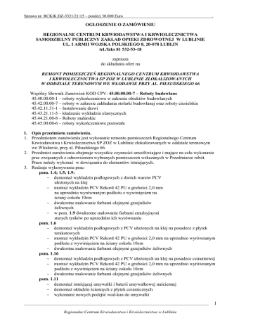 Sprawa nr: RCKiK.DZ-3321/21/15 – poniżej 30.000 Euro . OGŁOSZENIE O ZAMÓWIENIU REGIONALNE CENTRUM KRWIODAWSTWA I KRWIOLECZNICTWA SAMODZIELNY PUBLICZNY ZAKŁAD OPIEKI ZDROWOTNEJ W LUBLINIE UL. I ARMII WOJSKA POLSKIEGO 8, 20-078 LUBLIN tel./faks 81 532-53-18 zaprasza do składania ofert na REMONT POMIESZCZEŃ REGIONALNEGO CENTRUM KRWIODAWSTWA I KRWIOLECZNICTWA SP ZOZ W LUBLINIE ZLOKALIZOWANYCH W ODDZIALE TERENOWYM WE WŁODAWIE PRZY AL. PIŁSUDSKIEGO 66 Wspólny Słownik Zamówień KOD CPV: 45.00.00.00-7 – Roboty budowlane 45.40.00.00-1 – roboty wykończeniowe w zakresie obiektów budowlanych 45.42.00.00-7 – roboty w zakresie zakładania stolarki budowlanej oraz roboty ciesielskie 45.42.11.31-1 – Instalowanie drzwi 45.43.21.11-5 – kładzenie wykładzin elastycznych 45.44.21.00-8 – Roboty malarskie 45.45.00.00-6 – roboty wykończeniowe pozostałe I. Opis przedmiotu zamówienia. 1. Przedmiotem zamówienia jest wykonanie remontu pomieszczeń Regionalnego Centrum Krwiodawstwa i Krwiolecznictwa SP ZOZ w Lublinie zlokalizowanych w oddziale terenowym we Włodawie, przy al. Piłsudskiego 66. 2. Przedmiot zamówienia obejmuje wszystkie czynności umożliwiające i mające na celu wykonanie prac związanych z odnowieniem wybranych pomieszczeń wskazanych w Przedmiarze robót. Prace należy wykonać w dowiązaniu do elementów istniejących. 3. Rodzaje wykonywania prac: pom. 1.4; 1.5; 1.9: demontaż wykładzin podłogowych z dwóch warstw PCV ułożonych na klej montaż wykładzin PCV Rekord 42 PU o grubości 2,0 mm na uprzednio wyrównanym podłożu z wywinięciem na ściany cokołu 10cm dwukrotne malowanie farbami olejnymi grzejników żeliwnych w pom. 1.9 dwukrotne malowanie farbami emulsyjnymi starych tynków po uprzednim ich wyrównaniu pom. 1.6 demontaż wykładzin podłogowych z PCV ułożonych na klej na posadzce z płytek terakotowych montaż wykładzin PCV Rekord 42 PU o grubości 2,0 mm na uprzednio wyrównanym podłożu z wywinięciem na ściany cokołu 10cm dwukrotne malowanie farbami olejnymi grzejników żeliwnych pom. 1.16 demontaż wykładzin podłogowych z PCV ułożonych na klej na posadzce cementowej montaż wykładzin PCV Rekord 42 PU o grubości 2,0 mm na uprzednio wyrównanym podłożu z wywinięciem na ściany cokołu 10cm dwukrotne malowanie farbami olejnymi grzejników żeliwnych pom. 1.11 demontaż istniejącej umywalki i baterii umywalkowej naściennej demontaż okładzin ściennych z płytek ceramicznych wykonanie nowych podejść wod-kan do umywalki _______________________________________________________________________________________ Regionalne Centrum Krwiodawstwa i Krwiolecznictwa w Lublinie 1 Sprawa nr: RCKiK.DZ-3321/21/15 – poniżej 30.000 Euro . 4. 5. wykonanie fartucha wokół umywalki z płytek ceramicznych o wymiarach 100 x160cm montaż umywalki wraz z baterią stojącą pom. 1.12; 1.13; 1.14; 1.15 demontaż istniejącej umywalki i baterii umywalkowej naściennej demontaż istniejącej miski ustępowej demontaż okładzin ściennych i podłogowych z płytek ceramicznych demontaż drzwi do pomieszczeń wykonanie nowych podejść wod-kan do umywalki i miski ustępowej montaż nowych drzwi do pomieszczeń- do przedsionka drzwi o szerokości 90cm, do wc drzwi o szerokości 80cm wykonanie nowych okładzin podłóg i ścian z płytek ceramicznych do wysokości 2,0m montaż umywalki wraz z bateria stojącą montaż miski ustępowej ze spłuczką zabudowaną na elemencie montażowym Geberit Unifix dwukrotne malowanie farbami emulsyjnymi starych tynków po uprzednim ich wyrównaniu Wykonawca robót jest odpowiedzialny za jakość ich wykonania, za zgodność z wytycznymi określonymi w Opisie technicznym wykonania robót, poleceniami nadzoru inwestorskiego, zgodnie z art. 5, art.10 oraz art. 22 pkt.3a, 3b ustawy z dnia 7 lipca 1994 r. Prawo budowlane (Dz.U.2013.1409 j.t.) oraz § 3 pkt. 6, § 258 pkt 1 i 2, § 262 pkt 1, § 305 pkt 1 i 2 Rozporządzenia Ministra Infrastruktury z dnia 12 kwietnia 2002 r. w sprawie warunków technicznych jakim powinny odpowiadać budynki i ich usytuowanie (Dz.U.2002.75.690 z późn. zm.), oraz Warunkami technicznymi wykonania i odbioru robót budowlano-montażowych. Tom I Roboty Ogólnobudowlane. Szczegółowy zakres przedmiotu zamówienia oraz warunki wykonania i odbioru robót został określony w Opisie technicznym wykonania robót wraz z dokumentacją rysunkową oraz w Przedmiarze robót stanowiącymi załącznik nr 3 i 4 do Ogłoszenia o zamówieniu. II. Miejsce realizacji robót budowlanych: Regionalne Centrum Krwiodawstwa i Krwiolecznictwa w Lublinie w Lublinie, Oddział terenowy we Włodawie, al. Piłsudskiego 66, 22-200 Włodawa III. Termin realizacji: 1. Termin realizacji robót (zgłoszenia gotowości do odbioru końcowego) ustala się na 21 dni od daty protokolarnego przejęcia terenu robót budowlanych przez Wykonawcę. 2. Przekazanie terenu robót budowlanych zostanie potwierdzone protokołem zdawczo – odbiorczym sporządzonym z udziałem przedstawicieli obu Stron umowy. 3. Jeżeli zakończenie realizacji przedmiotu umowy opóźni się z winy Zamawiającego, Strony uzgodnią ze sobą nowy termin zakończenia robót. IV. Warunki płatności: 1. Płatność za wykonanie przedmiotu umowy nastąpi jednorazowo po dokonaniu końcowego odbioru robót. Odbiory częściowe nie uprawniają Wykonawcy do wystawiania faktur częściowych. Faktura może być wystawiona przez Wykonawcę wyłącznie na podstawie protokołu odbioru końcowego, przyjętego i podpisanego przez Zamawiającego. 2. Płatność faktury przez Zamawiającego nastąpi na rachunek w banku Wykonawcy, w terminie 30 dni od daty jej wpływu do Zamawiającego wraz z kopia podpisanego protokołu odbioru końcowego, 3. Brak załączonego protokołu będzie podstawą do wstrzymania płatności. 4. Strony oświadczają, że są płatnikami podatku VAT. 5. Jako datę zapłaty faktury przyjmuje się datę obciążenia rachunku bankowego Zamawiającego. 6. C