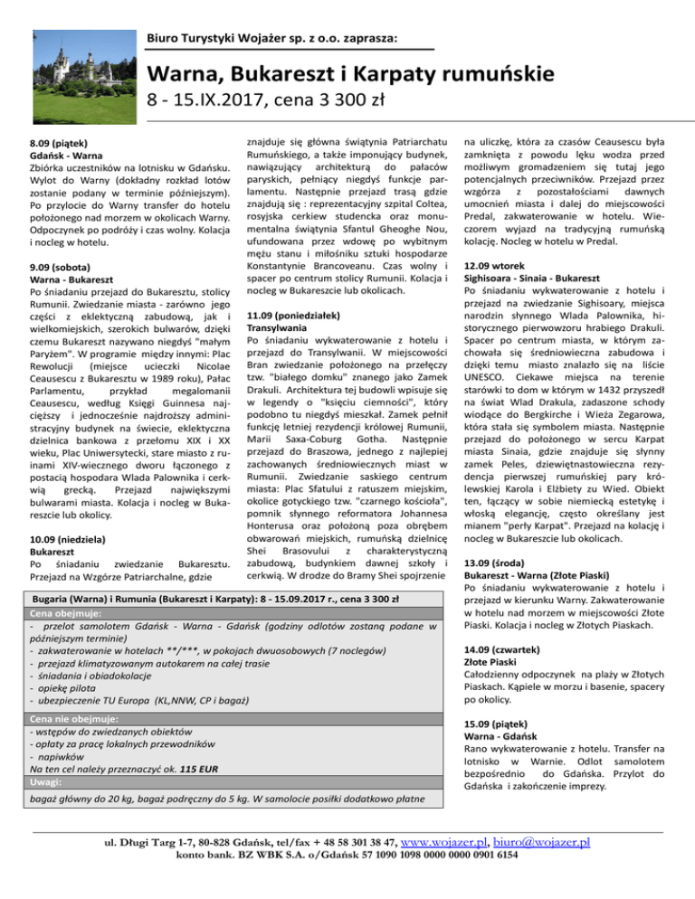 Biuro Turystyki Wojażer sp. z o.o. zaprasza: Warna, Bukareszt i Karpaty rumuńskie 8 - 15.IX.2017, cena 3 300 zł 8.09 (piątek) Gdańsk - Warna Zbiórka uczestników na lotnisku w Gdańsku. Wylot do Warny (dokładny rozkład lotów zostanie podany w terminie późniejszym). Po przylocie do Warny transfer do hotelu położonego nad morzem w okolicach Warny. Odpoczynek po podróży i czas wolny. Kolacja i nocleg w hotelu. 9.09 (sobota) Warna - Bukareszt Po śniadaniu przejazd do Bukaresztu, stolicy Rumunii. Zwiedzanie miasta - zarówno jego części z eklektyczną zabudową, jak i wielkomiejskich, szerokich bulwarów, dzięki czemu Bukareszt nazywano niegdyś "małym Paryżem". W programie między innymi: Plac Rewolucji (miejsce ucieczki Nicolae Ceausescu z Bukaresztu w 1989 roku), Pałac Parlamentu, przykład megalomanii Ceausescu, według Księgi Guinnesa najcięższy i jednocześnie najdroższy administracyjny budynek na świecie, eklektyczna dzielnica bankowa z przełomu XIX i XX wieku, Plac Uniwersytecki, stare miasto z ruinami XIV-wiecznego dworu łączonego z postacią hospodara Wlada Palownika i cerkwią grecką. Przejazd największymi bulwarami miasta. Kolacja i nocleg w Bukareszcie lub okolicy. 10.09 (niedziela) Bukareszt Po śniadaniu zwiedzanie Bukaresztu. Przejazd na Wzgórze Patriarchalne, gdzie znajduje się główna świątynia Patriarchatu Rumuńskiego, a także imponujący budynek, nawiązujący architekturą do pałaców paryskich, pełniący niegdyś funkcje parlamentu. Następnie przejazd trasą gdzie znajdują się : reprezentacyjny szpital Coltea, rosyjska cerkiew studencka oraz monumentalna świątynia Sfantul Gheoghe Nou, ufundowana przez wdowę po wybitnym mężu stanu i miłośniku sztuki hospodarze Konstantynie Brancoveanu. Czas wolny i spacer po centrum stolicy Rumunii. Kolacja i nocleg w Bukareszcie lub okolicach. 11.09 (poniedziałek) Transylwania Po śniadaniu wykwaterowanie z hotelu i przejazd do Transylwanii. W miejscowości Bran zwiedzanie położonego na przełęczy tzw. "białego domku" znanego jako Zamek Drakuli. Architektura tej budowli wpisuje się w legendy o "księciu ciemności", który podobno tu niegdyś mieszkał. Zamek pełnił funkcję letniej rezydencji królowej Rumunii, Marii Saxa-Coburg Gotha. Następnie przejazd do Braszowa, jednego z najlepiej zachowanych średniowiecznych miast w Rumunii. Zwiedzanie saskiego centrum miasta: Plac Sfatului z ratuszem miejskim, okolice gotyckiego tzw. "czarnego kościoła", pomnik słynnego reformatora Johannesa Honterusa oraz położoną poza obrębem obwarowań miejskich, rumuńską dzielnicę Shei Brasovului z charakterystyczną zabudową, budynkiem dawnej szkoły i cerkwią. W drodze do Bramy Shei spojrzenie Bugaria (Warna) i Rumunia (Bukareszt i Karpaty): 8 - 15.09.2017 r., cena 3 300 zł Cena obejmuje: - przelot samolotem Gdańsk - Warna - Gdańsk (godziny odlotów zostaną podane w późniejszym terminie) - zakwaterowanie w hotelach **/***, w pokojach dwuosobowych (7 noclegów) - przejazd klimatyzowanym autokarem na całej trasie - śniadania i obiadokolacje - opiekę pilota - ubezpieczenie TU Europa (KL,NNW, CP i bagaż) Cena nie obejmuje: - wstępów do zwiedzanych obiektów - opłaty za pracę lokalnych przewodników - napiwków Na ten cel należy przeznaczyć ok. 115 EUR Uwagi: na uliczkę, która za czasów Ceausescu była zamknięta z powodu lęku wodza przed możliwym gromadzeniem się tutaj jego potencjalnych przeciwników. Przejazd przez wzgórza z pozostałościami dawnych umocnień miasta i dalej do miejscowości Predal, zakwaterowanie w hotelu. Wieczorem wyjazd na tradycyjną rumuńską kolację. Nocleg w hotelu w Predal. 12.09 wtorek Sighisoara - Sinaia - Bukareszt Po śniadaniu wykwaterowanie z hotelu i przejazd na zwiedzanie Sighisoary, miejsca narodzin słynnego Wlada Palownika, historycznego pierwowzoru hrabiego Drakuli. Spacer po centrum miasta, w którym zachowała się średniowieczna zabudowa i dzięki temu miasto znalazło się na liście UNESCO. Ciekawe miejsca na terenie starówki to dom w którym w 1432 przyszedł na świat Wlad Drakula, zadaszone schody wiodące do Bergkirche i Wieża Zegarowa, która stała się symbolem miasta. Następnie przejazd do położonego w sercu Karpat miasta Sinaia, gdzie znajduje się słynny zamek Peles, dziewiętnastowieczna rezydencja pierwszej rumuńskiej pary królewskiej Karola i Elżbiety zu Wied. Obiekt ten, łączący w sobie niemiecką estetykę i włoską elegancję, często określany jest mianem "perły Karpat". Przejazd na kolację i nocleg w Bukareszcie lub okolicach. 13.09 (środa) Bukareszt - Warna (Złote Piaski) Po śniadaniu wykwaterowanie z hotelu i przejazd w kierunku Warny. Zakwaterowanie w hotelu nad morzem w miejscowości Złote Piaski. Kolacja i nocleg w Złotych Piaskach. 14.09 (czwartek) Złote Piaski Całodzienny odpoczynek na plaży w Złotych Piaskach. Kąpiele w morzu i basenie, spacery po okolicy. 15.09 (piątek) Warna - Gdańsk Rano wykwaterowanie z hotelu. Transfer na lotnisko w Warnie. Odlot samolotem bezpośrednio do Gdańska. Przylot do Gdańska i zakończenie imprezy. bagaż główny do 20 kg, bagaż podręczny do 5 kg. W samolocie posiłki dodatkowo płatne ul. Długi Targ 1-7, 80-828 Gdańsk, tel/fax + 48 58 301 38 47, www.wojazer.pl, [email protected] konto bank. BZ WBK S.A. o/Gdańsk 57 1090 1098 0000 0000 0901 6154