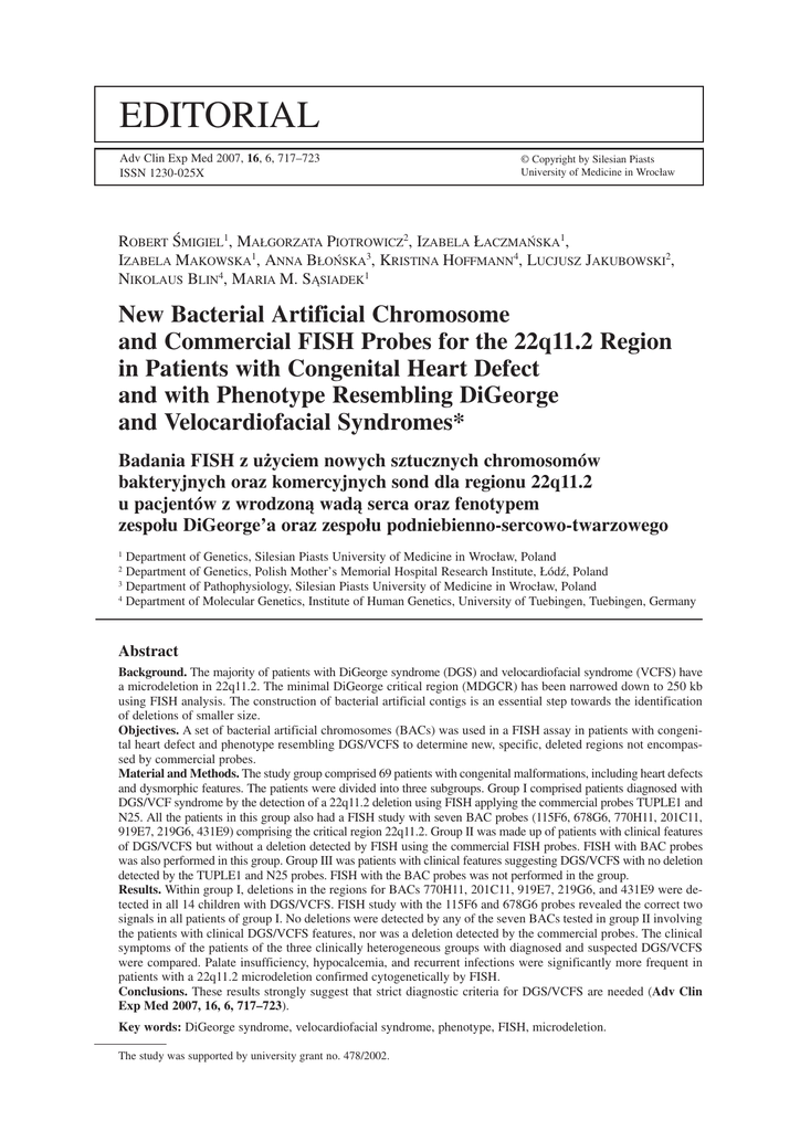 EDITORIAL Adv Clin Exp Med 2007, 16, 6, 717–723 ISSN 1230−025X © Copyright by Silesian Piasts University of Medicine in Wrocław ROBERT ŚMIGIEL1, MAŁGORZATA PIOTROWICZ2, IZABELA ŁACZMAŃSKA1, IZABELA MAKOWSKA1, ANNA BŁOŃSKA3, KRISTINA HOFFMANN4, LUCJUSZ JAKUBOWSKI2, NIKOLAUS BLIN4, MARIA M. SĄSIADEK1 New Bacterial Artificial Chromosome and Commercial FISH Probes for the 22q11.2 Region in Patients with Congenital Heart Defect and with Phenotype Resembling DiGeorge and Velocardiofacial Syndromes* Badania FISH z użyciem nowych sztucznych chromosomów bakteryjnych oraz komercyjnych sond dla regionu 22q11.2 u pacjentów z wrodzoną wadą serca oraz fenotypem zespołu DiGeorge’a oraz zespołu podniebienno−sercowo−twarzowego 1 Department of Genetics, Silesian Piasts University of Medicine in Wrocław, Poland Department of Genetics, Polish Mother’s Memorial Hospital Research Institute, Łódź, Poland 3 Department of Pathophysiology, Silesian Piasts University of Medicine in Wrocław, Poland 4 Department of Molecular Genetics, Institute of Human Genetics, University of Tuebingen, Tuebingen, Germany 2 Abstract Background. The majority of patients with DiGeorge syndrome (DGS) and velocardiofacial syndrome (VCFS) have a microdeletion in 22q11.2. The minimal DiGeorge critical region (MDGCR) has been narrowed down to 250 kb using FISH analysis. The construction of bacterial artificial contigs is an essential step towards the identification of deletions of smaller size. Objectives. A set of bacterial artificial chromosomes (BACs) was used in a FISH assay in patients with congeni− tal heart defect and phenotype resembling DGS/VCFS to determine new, specific, deleted regions not encompas− sed by commercial probes. Material and Methods. The study group comprised 69 patients with congenital malformations, including heart defects and dysmorphic features. The patients were divided into three subgroups. Group I comprised patients diagnosed with DGS/VCF syndrome by the detection of a 22q11.2 deletion using FISH applying the commercial probes TUPLE1 and N25. All the patients in this group also had a FISH study with seven BAC probes (115F6, 678G6, 770H11, 201C11, 919E7, 219G6, 431E9) comprising the critical region 22q11.2. Group II was made up of patients with clinical features of DGS/VCFS but without a deletion detected by FISH using the commercial FISH probes. FISH with BAC probes was also performed in this group. Group III was patients with clinical features suggesting DGS/VCFS with no deletion detected by the TUPLE1 and N25 probes. FISH with the BAC probes was not performed in the group. Results. Within group I, deletions in the regions for BACs 770H11, 201C11, 919E7, 219G6, and 431E9 were de− tected in all 14 children with DGS/VCFS. FISH study with the 115F6 and 678G6 probes revealed the correct two signals in all patients of group I. No deletions were detected by any of the seven BACs tested in group II involving the patients with clinical DGS/VCFS features, nor was a deletion detected by the commercial probes. The clinical symptoms of the patients of the three clinically heterogeneous groups with diagnosed and suspected DGS/VCFS were compared. Palate insufficiency, hypocalcemia, and recurrent infections were significantly more frequent in patients with a 22q11.2 microdeletion confirmed cytogenetically by FISH. Conclusions. These results strongly suggest that strict diagnostic criteria for DGS/VCFS are needed (Adv Clin Exp Med 2007, 16, 6, 717–723). Key words: DiGeorge syndrome, velocardiofacial syndrome, phenotype, FISH, microdeletion. The study was supported by university grant no. 478/2002. 718 R. ŚMIGIEL et al. Streszczenie Wprowadzenie. Delecja 22q11.2 jest jedną z najczęstszych mikrodelecji u człowieka i jest przyczyną kilku zespo− łów genetycznych, m.in.: zespołu DiGeorge’a (DGS) oraz podniebienno−sercowo−twarzowego (VCFS – velo−car− dio−facial syndrome). Rutynowa diagnostyka cytogenetyczna zespołów obejmuje fluorescencyjną hybrydyzację in situ (FISH) z użyciem sond charakterystycznych dla obszaru krytycznego. Ostatnie doniesienia wykazały, że w je− go obrębie mogą występować submikrodelecje obejmujące znacznie mniejsze obszary. Cel. Analiza submikrodelecji w obszarze 22q11.2 metodą FISH z użyciem sztucznych chromosomów bakteryjnych (BAC) u pacjentów z wrodzonymi wadami serca i cechami dysmorficznymi. Materiał i metody. Badania obejmowały 69 pacjentów z wadami wrodzonymi serca oraz cechami dysmorficznymi sugerującymi zespoły mikrodelecji 22q11.2. Pacjentów podzielono na 3 grupy: grupa I – pacjenci ze zdiagnozowa− nym zespołem DG/VCF za pomocą badania FISH z użyciem sond komercyjnych (TUPLE1, N25). W tej grupie wy− konano ponadto badanie FISH z użyciem siedmiu sond bakteryjnych (BAC – 115F6, 678G6, 770H11, 201C11, 919E7, 219G6, 431E9), obejmujących krytyczny region 22q11.2; grupa II – pacjenci z klinicznymi cechami suge− rującymi DGS/VCFS, ale bez zdiagnozowanej mikrodelecji sondami komercyjnymi. W tej grupie również wykona− no badanie FISH z użyciem sond bakteryjnych, charakterystycznych dla regionu 22q11.2, izolowanych ze sztucz− nych chromosomów bakterii; grupa III – pacjenci z cechami klinicznymi sugerującymi DGS/VCFS, bez zdiagnozo− wanej mikrodelecji sondami komercyjnymi, u których nie wykonano badania FISH z użyciem sond bakteryjnych. Wyniki. W grupie pierwszej u wszystkich pacjentów ze stwierdzoną mikrodelecją 22q11.2 wykazano również de− lecję w regionie wyznaczonym przez sondy bakteryjne (770H11, 201C11, 919E7, 219G6, 431E9). Badanie FISH, wykonane z sondami 115F6, 678G6, nie wykazało nieprawidłowości (brak delecji). W drugiej grupie u żadnego pac− jenta nie stwierdzono mikrodelecji za pomocą sond bakteryjnych. Potwierdziło to swoistość sond komercyjnych. W pracy przeprowadzono ponadto analizę porównawczą danych klinicznych pacjentów z trzech grup ze zdiagnozo