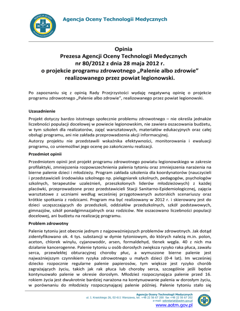 Agencja Oceny Technologii Medycznych Opinia Prezesa Agencji Oceny Technologii Medycznych nr 80/2012 z dnia 28 maja 2012 r. o projekcie programu zdrowotnego „Palenie albo zdrowie” realizowanego przez powiat legionowski. Po zapoznaniu się z opinią Rady Przejrzystości wydaję negatywną opinię o projekcie programu zdrowotnego „Palenie albo zdrowie”, realizowanego przez powiat legionowski. Uzasadnienie Projekt dotyczy bardzo istotnego społecznie problemu zdrowotnego – nie określa jednakże liczebności populacji docelowej w powiecie legionowskim, nie zawiera oszacowania budżetu, w tym szkoleń dla realizatorów, zajęć warsztatowych, materiałów edukacyjnych oraz całej obsługi programu, ani nie zakłada przeprowadzenia akcji informacyjnej. Autorzy projektu nie przedstawili wskaźnika efektywności, monitorowania i ewaluacji programu, co uniemożliwi jego ocenę po zakończeniu realizacji. Przedmiot opinii Przedmiotem opinii jest projekt programu zdrowotnego powiatu legionowskiego w zakresie profilaktyki, zmniejszenia rozpowszechnienia palenia tytoniu oraz zmniejszenia narażenia na bierne palenie dzieci i młodzieży. Program zakłada szkolenia dla koordynatorów (nauczycieli i przedstawicieli środowiska szkolnego np. pielęgniarek szkolnych, pedagogów, psychologów szkolnych, terapeutów uzależnień, przeszkolonych liderów młodzieżowych) z każdej placówki, przeprowadzone przez przedstawicieli Stacji Sanitarno-Epidemiologicznej, zajęcia warsztatowe z uczniami według wcześniej przygotowanych autorskich scenariuszy oraz krótkie spotkania z rodzicami. Program ma być realizowany w 2012 r. i skierowany jest do dzieci uczęszczających do przedszkoli, oddziałów przedszkolnych, szkół podstawowych, gimnazjów, szkół ponadgimnazjalnych oraz rodziców. Nie oszacowano liczebności populacji docelowej, ani budżetu na realizację programu. Problem zdrowotny Palenie tytoniu jest obecnie jednym z najpoważniejszych problemów zdrowotnych. Jak dotąd zidentyfikowano ok. 4 tys. substancji w dymie tytoniowym, do których należą m.in. polon, aceton, chlorek winylu, cyjanowodór, arsen, formaldehyd, tlenek węgla. 40 z nich ma działanie kancerogenne. Palenie tytoniu u osób dorosłych zwiększa ryzyko raka płuca, zawału serca, przewlekłej obturacyjnej choroby płuc, a wymuszone bierne palenie jest najważniejszym czynnikiem ryzyka zdrowotnego u małych dzieci (0-4 lat). Im wcześniej dziecko rozpocznie regularne palenie papierosów, tym większe jest ryzyko chorób zagrażających życiu, takich jak rak płuca lub choroby serca, szczególnie jeśli będzie kontynuowało palenie w okresie dorosłym. Młodzież rozpoczynająca palenie przed 16. rokiem życia jest dwukrotnie bardziej narażona na kontynuowanie palenia w dorosłym życiu, w porównaniu do młodzieży rozpoczynającej palenie później. Palenie tytoniu stało się Agencja Oceny Technologii Medycznych ul. I. Krasickiego 26, 02-611 Warszawa, tel. +48 22 56 67 200 fax +48 22 56 67 202 e-mail: [email protected] www.aotm.gov.pl Opinia Prezesa AOTM nr 80/2012 z dnia 28 maja 2012 r. główną przyczyną przedwczesnej umieralności mężczyzn w Polsce i jedną z podstawowych przyczyn przedwczesnej umieralności kobiet. Alternatywne świadczenia W Polsce realizowany jest „Program ograniczania zdrowotnych następstw palenia tytoniu w Polsce. Cele i zadania na lata 2010-2013”. W realizację tego programu zostały włączone jednostki samorządu terytorialnego. Jego kierunki są zgodne z programem Światowej Organizacji Zdrowia (Program „WHO Tobacco Free Europe”) i polityką zdrowotną Unii Europejskiej (Program „Europe Against Cancer”), uwzględniają także zobowiązania zawarte w Ramowej Konwencji WHO o „Ograniczeniu Użycia Tytoniu” (ratyfikowanej przez Polskę we wrześniu 2006 r.). Jednym z zadań tego programu jest zapobieganie palenia tytoniu przez dzieci i młodzież oraz programy edukacyjne propagujące modę na niepalenie. Interwencje realizowane w ramach tego programu obejmują m.in.: prowadzenie programów edukacyjnych i profilaktycznych (zapobiegających inicjacji palenia tytoniu) dla dzieci i młodzieży, ukazujących źródło i istotę zagrożenia toksycznymi i rakotwórczymi składnikami dymu tytoniowego, opracowanie i wdrożenie procedur postępowania wobec palących uczniów oraz promocję mody na niepalenie papierosów wśród młodzieży i nauczycieli oraz wychowawców, ze szczególnym uwzględnieniem wymogów wynikających ze statusu i prestiżu zawodu nauczyciela jako wzoru osobowego, tworzenie w środowisku domowym atmosfery wsparcia dla procesu edukacji zdrowotnej dzieci i młodzieży, a także warunków ochrony dzieci przed wymuszonym wdychaniem dymu tytoniowego, przygotowanie nauczycieli, katechetów i wychowawców do rozpoznawania potrzeb edukacji zdrowotnej na terenie szkół, konstruowania programów interwencyjnych i edukacyjnych oraz skutecznej ich realizacji. Od 2007 r. koordynacją programu w województwach i powiatach, zajmują się odpowiednio Państwowi Wojewódzcy Inspektorzy Sanitarni i Państwowi Powiatowi Inspektorzy Sanitarni. Wnioski z oceny przeprowadzonej przez Agencję Poniżej przedstawiono podsumowanie z odnalezionych wytycznych, dowodów naukowych oraz opinii eksperta: • profilaktyka, szczególnie wśród młodych ludzi oraz zaprzestanie i wspieranie zaprzestania palenia są najważniejszymi strategiami redukcji palenia tytoniu, • odnośnie dzieci programy powinny być realizowane od najmłodszych lat i kontynuowane w przyszłości, • populacją programów powinny być dzieci i młodzież ze szczególnym uwzględnieniem grup ryzyka, • programy nie powinny być przygotowywane ani realizowane we współpracy z przemysłem tytoniowym, • w realizację programów profilaktyki powinni być włączani rodzice, członkowie rodziny oraz społeczności dzieci, • dużą efektywnością charakteryzują się interwencje realizowane przez rówieśnikó