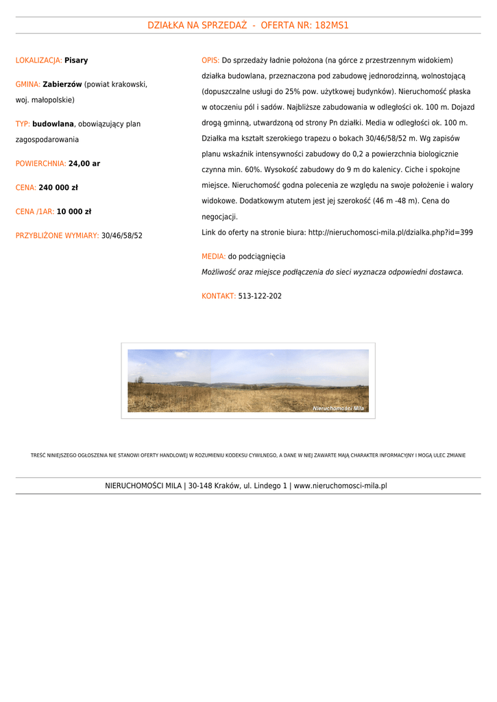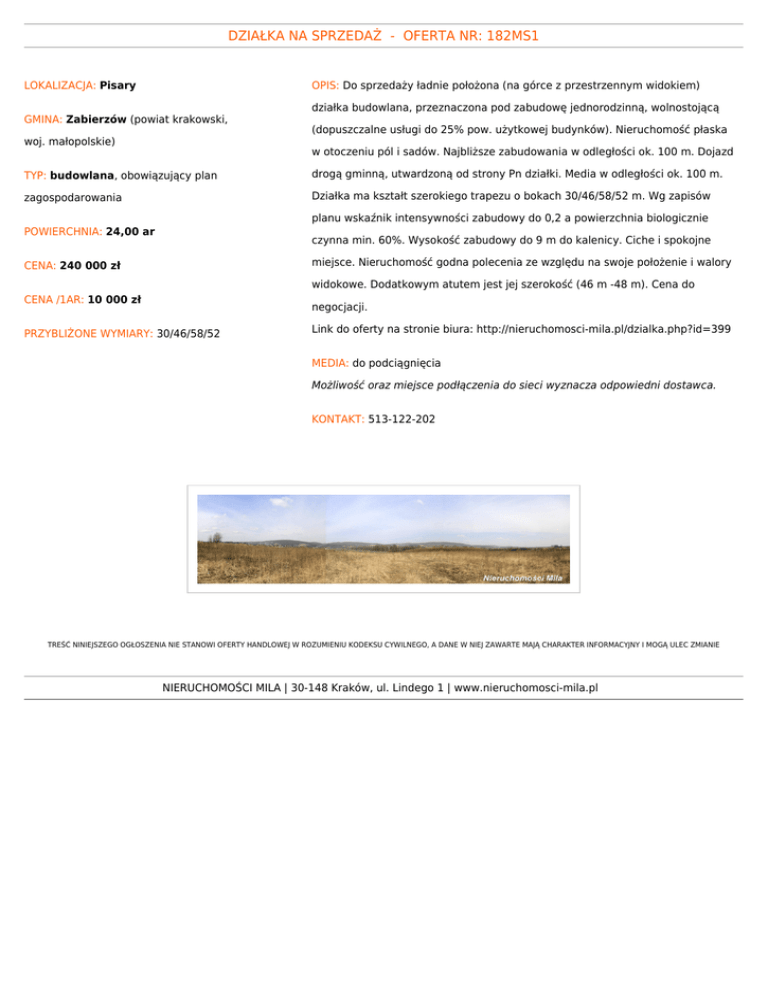 DZIAŁKA NA SPRZEDAŻ - OFERTA NR: 182MS1 LOKALIZACJA: Pisary OPIS: Do sprzedaży ładnie położona (na górce z przestrzennym widokiem) GMINA: Zabierzów (powiat krakowski, woj. małopolskie) działka budowlana, przeznaczona pod zabudowę jednorodzinną, wolnostojącą (dopuszczalne usługi do 25% pow. użytkowej budynków). Nieruchomość płaska w otoczeniu pól i sadów. Najbliższe zabudowania w odległości ok. 100 m. Dojazd TYP: budowlana, obowiązujący plan drogą gminną, utwardzoną od strony Pn działki. Media w odległości ok. 100 m. zagospodarowania Działka ma kształt szerokiego trapezu o bokach 30/46/58/52 m. Wg zapisów planu wskaźnik intensywności zabudowy do 0,2 a powierzchnia biologicznie POWIERCHNIA: 24,00 ar czynna min. 60%. Wysokość zabudowy do 9 m do kalenicy. Ciche i spokojne miejsce. Nieruchomość godna polecenia ze względu na swoje położenie i walory CENA: 240 000 zł widokowe. Dodatkowym atutem jest jej szerokość (46 m -48 m). Cena do CENA /1AR: 10 000 zł negocjacji. PRZYBLIŻONE WYMIARY: 30/46/58/52 Link do oferty na stronie biura: http://nieruchomosci-mila.pl/dzialka.php?id=399 MEDIA: do podciągnięcia Możliwość oraz miejsce podłączenia do sieci wyznacza odpowiedni dostawca. KONTAKT: 513-122-202 TREŚĆ NINIEJSZEGO OGŁOSZENIA NIE STANOWI OFERTY HANDLOWEJ W ROZUMIENIU KODEKSU CYWILNEGO, A DANE W NIEJ ZAWARTE MAJĄ CHARAKTER INFORMACYJNY I MOGĄ ULEC ZMIANIE NIERUCHOMOŚCI MILA | 30-148 Kraków, ul. Lindego 1 | www.nieruchomosci-mila.pl
