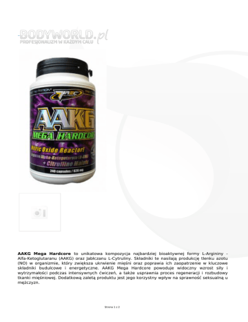 AAKG Mega Hardcore to unikatowa kompozycja najbardziej bioaktywnej formy L-Argininy Alfa-Ketoglutaranu (AAKG) oraz Jabłczanu L-Cytruliny. Składniki te nasilają produkcję tlenku azotu (NO) w organizmie, który zwiększa ukrwienie mięśni oraz poprawia ich zaopatrzenie w kluczowe składniki budulcowe i energetyczne. AAKG Mega Hardcore powoduje widoczny wzrost siły i wytrzymałości podczas intensywnych ćwiczeń, a także usprawnia proces regeneracji i rozbudowy tkanki mięśniowej. Dodatkową zaletą produktu jest jego korzystny wpływ na sprawność seksualną u mężczyzn. Strona 1 z 2 Strona 2 z 2