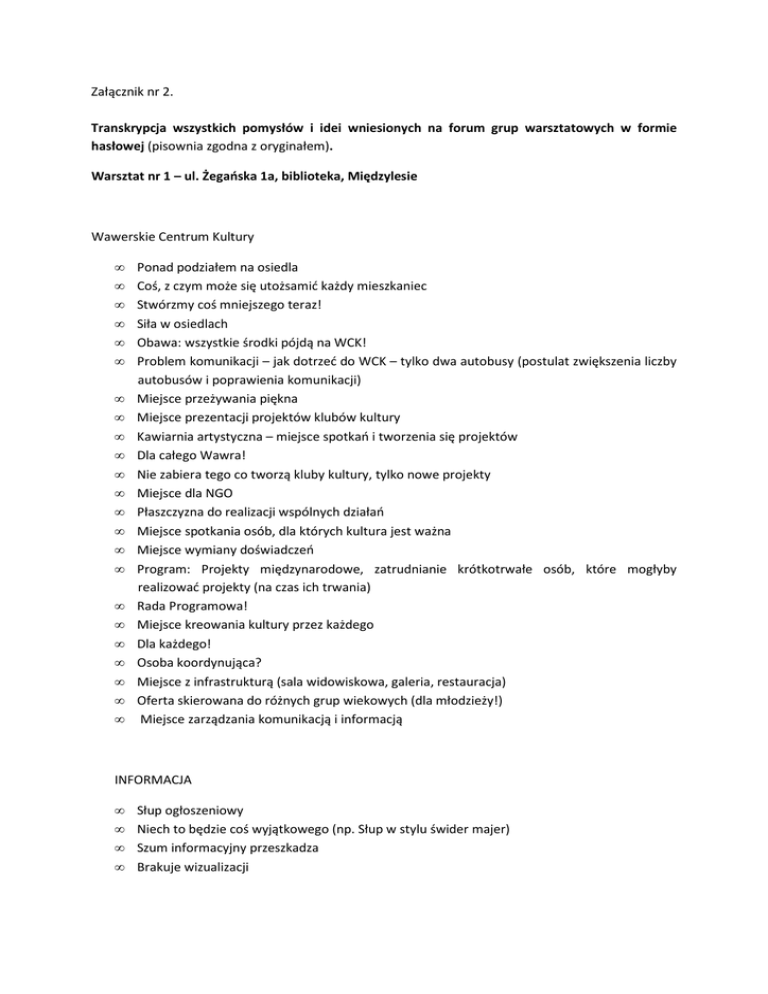 Załącznik nr 2. Transkrypcja wszystkich pomysłów i idei wniesionych na forum grup warsztatowych w formie hasłowej (pisownia zgodna z oryginałem). Warsztat nr 1 – ul. Żegańska 1a, biblioteka, Międzylesie Wawerskie Centrum Kultury • • • • • • • • • • • • • • • • • • • • • • • Ponad podziałem na osiedla Coś, z czym może się utożsamić każdy mieszkaniec Stwórzmy coś mniejszego teraz! Siła w osiedlach Obawa: wszystkie środki pójdą na WCK! Problem komunikacji – jak dotrzeć do WCK – tylko dwa autobusy (postulat zwiększenia liczby autobusów i poprawienia komunikacji) Miejsce przeżywania piękna Miejsce prezentacji projektów klubów kultury Kawiarnia artystyczna – miejsce spotkań i tworzenia się projektów Dla całego Wawra! Nie zabiera tego co tworzą kluby kultury, tylko nowe projekty Miejsce dla NGO Płaszczyzna do realizacji wspólnych działań Miejsce spotkania osób, dla których kultura jest ważna Miejsce wymiany doświadczeń Program: Projekty międzynarodowe, zatrudnianie krótkotrwałe osób, które mogłyby realizować projekty (na czas ich trwania) Rada Programowa! Miejsce kreowania kultury przez każdego Dla każdego! Osoba koordynująca? Miejsce z infrastrukturą (sala widowiskowa, galeria, restauracja) Oferta skierowana do różnych grup wiekowych (dla młodzieży!) Miejsce zarządzania komunikacją i informacją INFORMACJA • • • • Słup ogłoszeniowy Niech to będzie coś wyjątkowego (np. Słup w stylu świder majer) Szum informacyjny przeszkadza Brakuje wizualizacji • • • • • • • • • • • • • • • • • • • • • • • • • • • • • • • Uatrakcyjnienie i scentralizowanie przepływu informacji (żeby nie było tak, że osiedle coś organizują i tylko osiedle o tym wie) Postulat o przejrzystości przekazu internetowego Słupy się nie sprawdzają Wypracowanie znaku firmowego (logo wydarzeń kulturalnych dzielnicy) – ułatwia informację Bezpośrednie zaproszenie Orientacja wertykalna plakatów plus na poziomie oczu Pomysł, żeby najbardziej atrakcyjne plakaty gromadzić ( i wystawiać!) Stacje kolejowe, benzynowe – jako dobre miejsca rozpowszechniania informacji Co? Gdzie? Kiedy? – informator kulturalny Wawra Informacja w komunikacji miejskiej Pomysł żeby istniał wzór plakatu Informacja szeptana Facebook, Twitter – profile na portalach społecznościowych – Kulturalny Wawer Dotarcie do młodzieży Mailing Większa ilość plakatów na stacjach zaśmiecałaby teren wokół stacji Inne miejsca (np. sklepy) Centralne miejsce – centrum informacji Centrum Zdrowia Dziecka – jako miejsce informacji dla osób przyjezdnych Systematyczne informacja Kampania informacyjna Odpowiednia forma i czas (nie po wydarzeniu) Kompletna, rzetelna informacja Skuteczne i konkretne docieranie Aktualizowana na bieżąco strona www Newsletter – raz na tydzień, miesiąc Parafie jako miejsce przekazywania informacji o dużym zasięgu Dobosz Wawerski! SMS-Y – istnieje baza numerów w Urzędzie Dzielnicy Dzielnicowe Bilbordy Radiowęzeł na Stacjach PKP (głośniki - już istniejąca infrastruktura) AKTYWIZACJA • • • • • • • • • Stworzyć poczucie wspólnoty Współuczestniczenie w kulturze Działania integracyjne (np. przez internet) Stworzenie możliwości zaistnienia, uczestniczenia społecznościom lokalnym Imieniny ulicy, wyprzedaże garażowe Wypracowanie misji Aktywizacja przez specjalizację Lepsza oferta kulturalna – bardziej włączająca mieszkańców Aktywizacja ? • • • • • • • • • • • • • • • • • • • • • • Możliwość współpracy z NGO z innych dzielnic i terenów Sygnał, że coś jest nie dla wszystkich – może skłonić do udziału Kształtowanie patriotyzmu lokalnego (np. poprzez koszulki z napisami: „Wawer to stolica, reszta to okolica”, „Wawer żąda dostępu do morza”) Promocja: strona www. „Wawer potrafi” Wawer jako puzel, jako część Warszawy, a nie sypialnia! Rozpoznanie potrzeb społeczności lokalnych Wypracowanie „marki” koncertów Falenickich, czy wieczorów poezji Wykorzystanie lokalnych zasobów Liderzy lokalni Pozwolić ludziom zaistnieć Warsztaty, integracja środowiska Wpajanie wartości Kultury poprzez edukację (Projekty, rola NGO) Badania socjologiczne: dlaczego ludzie siedzą w domach? Diagnoza środowiska Aktywizacja związana z informacją (tego i tego dnia jest…) Koordynator pozyskujący pieniądze (kwestie prawne) Znane osoby, które promowałyby wydarzenia Dobra oferta Aktywizacja społeczności lokalnych Odczarowanie przekonań co do oferty Zachęcenie do działania, do współpracy – dawanie/branie Istnieją bierni odbiorcy WSPÓŁPRACA ORGANIZACJI POZARZĄDOWYCH, KLUBÓW KULTURY I URZĘDU DZIELNICY • • • • • • • • • • • • • Informacja plus aktywizacja plus $(PLN) = współpraca Więcej dotacji dla NGO Mniejsza roszczeniowość NGO Urząd jako baza kontaktów Urząd szuka rozwiązań, a nie problemów Kluby Kultury – udostępniają dla NGO np. salę Nie tworzyć nowych, wspierać istniejące (nie rozpraszać energii)! Uproszczona procedura współpracy Komisja Dialogu Społecznego - internet Podtrzymanie dobrej współpracy z Urzędem Tworzenie sieci (np. wśród Klubów Kultury) Współpraca ze szkołami Edukacja kulturalna w szkole (jako konkurencja dla klubów kultury – tak jest czasami postrzegana) WYRÓŻNIK WAWRA W OBSZARZE KULTURY • Osiedle poetów • Świder Majer • • • • • • • • • • • • • • • • • • • • • • • • • • • • Kolej, linia Otwocka Letnisko Mazowiecki Park Krajobrazowy Uniwersytet Trzeciego Wieku Muzeum literatury na Trawiastej Walory turystyczne – połącznie kultury i turystyczne Wawer żąda dostępu do Wisły (rezerwat przyrody, przystań, most?) Tradycje szkutnicze, żeglarskie Zabytkowe perony Żydzi Fal
