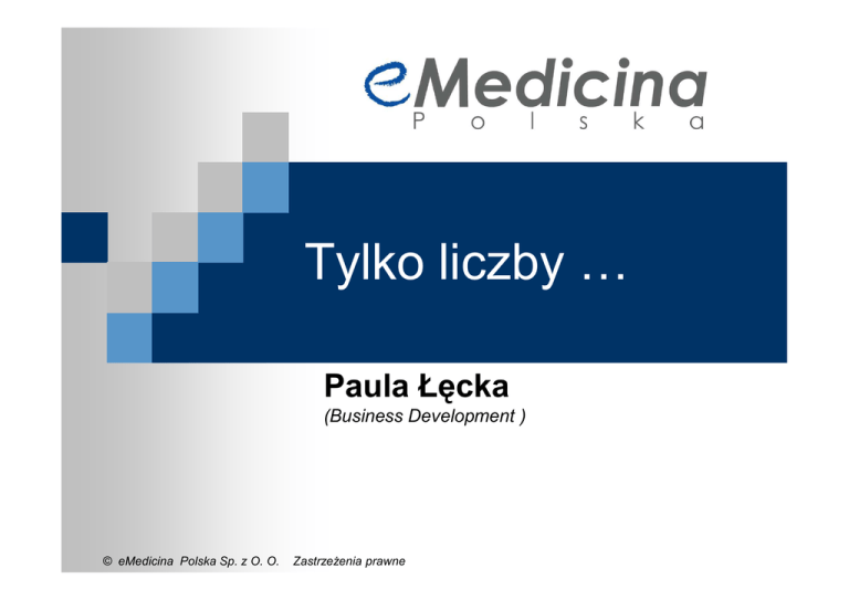 Tylko liczby … Paula Łęcka (Business Development ) © eMedicina Polska Sp. z O. O. Zastrzeżenia prawne 1. Sieć pacjentom i lekarzom 2. Potencjał i trendy 3. Rewolucja internetowa Każdy pacjent (gdy chce) ma dostęp do sieci I do każdego pacjenta (gdy chce) sieć ma dostęp Zasada telemedyczna nr 3: O swoim zdrowiu - myśl sieciowo zapomnij o pojedynczym lekarzu Pacjenci weryfikują zalecenia swoich lekarzy, terapię i diagnozę, oceniają lekarzy, zmieniają, weryfikują ich wiedzę i opinie o nich - swobodnie i bez żadnych skrupułów. Lekarze o tym wiedzą. To nowa jakość. W praktyce: indywidualizacja Pacjent może być naprawdę traktowany indywidualnie. Terapia i metoda diagnostyczna może być naprawdę spersonalizowana. Pacjent może sobie wybrać dowolnego lekarza, w dowolnym miejscu, czasie, nawet - kraju. Prof. R. Piotrowicz: „Rehabilitacja kardiologiczna. Osiem zasad głównych: Zasada 6: Indywidualizacja” 1. Sieć pacjentom i lekarzom 2. Potencjał i trendy 3. 3 000 000 dni rehabilitacji kardiologicznej (Polska/rocznie) 160 000 pacjentów wymaga rehabilitacji (*) po incydencie kardiologicznym, 8-10% uczestniczy/podlega rehabilitacji zatem potencjał rynku to 130 000 pacjentów po min. 24 dni telerehabilitacji (w domu) (*) „Aktualny stan dostępności do rehabilitacji kardiologicznej w Polsce „ Zbigniew Eysymontt, Michał Gałaszek- 2013 800 000 badań EKG „nieoczywistych” - wymagających dodatkowej konsultacji (Polska/rocznie) 20% wszystkich zarejestrowanych (ok. 4 000 000) (*) badań EKG w stanie spoczynku (w Polsce jest ok. 1800 lekarzy-kardiologów) (*) Raport GUS „Zdrowie i ochrona zdrowia w 2010 r.” Rocznik Stat. GUS – 2012, IKARD 4 000 000 dni monitorowania EKG (Polska/rocznie) (*) 1 000 000 pacjentów kardiologicznych (w tym - 500 000 leczonych na szpitalnych oddziałach kardiologicznych) (*) min. 30 % (ok. 300 000) pacjentów wymagających monitorowania przez zalecane minimum 14 dni (*) Rocznik Stat. GUS – 2012, IKARD 438 000 000 dni monitorowania pacjentów teleCare (Polska/rocznie) 1 200 000 pacjentów pozostaje w domach (*) i wszyscy oni wymagają monitorowania (365 dni w roku) (*) Rocznik Stat. GUS – 2012 2 000 000 badań KTG (Polska- rocznie) 400 000 żywych urodzeń (*) 100% kobiet chce mieć badanie od 38 tygodnia (zalecane jest w każdym przypadku ciąży po terminie) 5 minimalna liczba badań (*) Rocznik Stat. GUS – 2012 To tylko fragment zastosowań w kardiologii i w położnictwie, a inne specjalizacje i dziedziny medyczne? Pediatria Onkologia Kardioonkologia Ortopedia …. Ten potencjał trzeba wykorzystać - dla dobra pacjentów - dla zmniejszenia kosztów leczenia - dla dobra nauki - dla rozwoju biznesu Liczba mobilnych (na telefon) aplikacji medycznych rośnie szybciej niż wszystkich razem MobiHealthNews Apps Report/Washington Post,ioraz Future Source Cons. , www.emarketer.com $2 500 000 000 $736 000 000 Companies & Markets Dane z rynku medycznych (styczeń 2013, tylko rynek USA ) - aplikacji mobilnych (na telefon) liczba dostępnych aplikacji typu Patient Care and Resources: 3300, liczba wszystkich download’ów ponad 6 milionów - liczba dostępnych aplikacji typu Emergency Procedures and Assistance: 2000, liczba wszystkich download’ów ponad 7 milionów - liczba dostępnych aplikacji typu Medical Procedures: 500, liczba wszystkich download’ów Priori Segment Name Patient Care and Resources Emergency Procedures and Assistance Self Diagnosis and Treatment Drug Information Doctor Resources Natural Medicine Human Anatomy Meditation Assistants Plastic and Cosmetic Surgery Diabetes Diseases and Epidemics Medical Procedures Hypnosis Pharmacies Brain Wave Generators Tooth Care and Dentistry Alcohol Meters Cancer Number of Apps 3 278 2 096 1 856 635 1 155 755 425 494 405 326 1 096 514 312 221 137 664 201 185 Number of Estimated Downloads (This Number of Estimated Month) Downloads (Total) 319 412 6 243 007 219 817 7 110 689 176 352 6 712 736 137 137 4 508 334 114 314 3 136 366 103 408 1 131 856 92 412 3 111 161 74 832 2 331 163 38 107 1 409 779 35 456 830 578 34 397 663 889 31 072 1 441 541 26 413 621 267 24 898 519 029 22 185 1 239 059 14 709 223 233 13 960 937 097 11 402 113 807 Priori Data GmbH, www.prioridata.de ponad 1.4 miliona W Polsce: powtarzamy ten trend Świat oferuje coraz więcej technologii: Implant: bada krew i wysyła wyniki (Urządzenia Kenz) (Ecole Polytechnique Federale de Lausanne) Monitorowanie akcji serca i transmisja danych do Centrum (CardioDefender, an FDA-approved, smartphone-based ECG from Everist Genomics) (Patch prof. Łobodzinskiego USA) 1. Sieć pacjentom i lekarzom 2. Potencjał i trendy 3. Personalizowane i zindywidualizowane produkty: 1. teleKardioRehabilitacja: rehabilitacja kardiologiczna – II etap rehabilitacji hybrydowej (w warunkach domowych) 2. teleKardioMonitorowanie: eventHolter i personalizowane monitorowanie akcji serca 3. teleKardioTokoGrafia: domowe badanie kobiet od 38 tygodnia ciąży 4. … Szczegóły: www.emedicina.pl Misja: poprawić świat poprzez tworzenie prostych i skutecznych klinicznie narzędzi, do domowej i mobilnej opieki zdrowotnej www.emedicina.pl © eMedicina Polska Sp. z O. O. Zastrzeżenia prawne