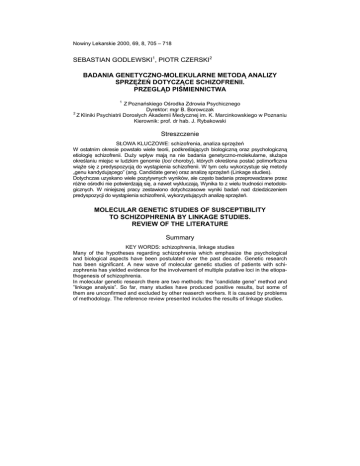 Nowiny Lekarskie 2000, 69, 8, 705 – 718 SEBASTIAN GODLEWSKI1, PIOTR CZERSKI2 BADANIA GENETYCZNO-MOLEKULARNE METODĄ ANALIZY SPRZĘŻEŃ DOTYCZĄCE SCHIZOFRENII. PRZEGLĄD PIŚMIENNICTWA 1 Z Poznańskiego Ośrodka Zdrowia Psychicznego Dyrektor: mgr B. Borowczak 2 Z Kliniki Psychiatrii Dorosłych Akademii Medycznej im. K. Marcinkowskiego w Poznaniu Kierownik: prof. dr hab. J. Rybakowski Streszczenie SŁOWA KLUCZOWE: schizofrenia, analiza sprzężeń W ostatnim okresie powstało wiele teorii, podkreślających biologiczną oraz psychologiczną etiologię schizofrenii. Duży wpływ mają na nie badania genetyczno-molekularne, służące określaniu miejsc w ludzkim genomie (loci choroby), których określona postać polimorficzna wiąże się z predyspozycją do wystąpienia schizofrenii. W tym celu wykorzystuje się metody „genu kandydującego” (ang. Candidate gene) oraz analizę sprzężeń (Linkage studies). Dotychczas uzyskano wiele pozytywnych wyników, ale często badania przeprowadzane przez różne ośrodki nie potwierdzają się, a nawet wykluczają. Wynika to z wielu trudności metodologicznych. W niniejszej pracy zestawiono dotychczasowe wyniki badań nad dziedziczeniem predyspozycji do wystąpienia schizofrenii, wykorzystujących analizę sprzężeń. MOLECULAR GENETIC STUDIES OF SUSCEPTIBILITY TO SCHIZOPHRENIA BY LINKAGE STUDIES. REVIEW OF THE LITERATURE Summary KEY WORDS: schizophrenia, linkage studies Many of the hypotheses regarding schizophrenia which emphasize the psychological and biological aspects have been postulated over the past decade. Genetic research has been significant. A new wave of molecular genetic studies of patients with schizophrenia has yielded evidence for the involvement of multiple putative loci in the etiopathogenesis of schizophrenia. In molecular genetic research there are two methods: the ”candidate gene” method and ”linkage analysis”. So far, many studies have produced positive results, but some of them are unconfirmed and excluded by other reaserch workers. It is caused by problems of methodology. The reference review presented includes the results of linkage studies. 706 S. Godlewski, P. Czerski Wstęp W ostatnim okresie powstało wiele teorii podkreślających biologiczną oraz psychologiczną etiologię schizofrenii. Próbą syntezy różnych koncepcji jest teoria „podatności i stresu” opisana przez Nuechterlein i Dawson w 1984 roku [22, 41]. Zakłada ona, że takie czynniki predestynujące jak: uszkodzenia ośrodkowego układu nerwowego, obciążenie rodzinne oraz deficyty w rozwoju neuropsychologicznym mają znaczenie w rozwoju osobowości pacjenta. W sytuacji subiektywnie odczuwanego stresu, zaburzenia rozwoju osobowości mają istotny związek z wystąpieniem objawów schizofrenicznych. W niniejszej pracy przedstawiono badania dotyczące znaczenia czynników genetycznych w patogenezie schizofrenii. Pierwsze próby badań rodzinnych w schizofrenii podjęto już w latach dwudziestych obecnego stulecia (Luxenberger, Rudin) [52]. Analizowano częstość występowania schizofrenii u krewnych pierwszego stopnia, bliźniąt jedno- i dwujajowych oraz u dzieci adoptowanych. Obecnie uznaje się, że częstość występowania schizofrenii u dziecka osoby chorej wynosi 12%. Gdy oboje rodzice chorują na schizofrenię, częstość zachorowań dzieci rośnie do 40%. W przypadku bliźniąt jednojajowych prawdopodobieństwo wystąpienia omawianego schorzenia u obu bliźniąt wynosi 47%, analizując zaś przypadki zachorowania u bliźniąt dwujajowych uzyskano wynik 12% [22]. Częstość występowania schizofrenii u osób pochodzących z rodzin obciążonych chorobą, adoptowanych do rodzin zdrowych – wynosi średnio 14,4% (23,5% w przypadku chorego krewnego I stopnia oraz 9,9% w przypadku chorego krewnego II stopnia) [33]. Powyższe wyniki uzasadniają badania genetyczne w określaniu predyspozycji do schizofrenii, ale również podkreślają wpływ czynników środowiskowych na występowanie schizofrenii. Współczesne badania genetyczno-molekularne mają na celu określenie miejsca w ludzkim genomie (loci choroby), którego określona postać polimorficzna wiąże się z predyspozycją do wystąpienia schizofrenii. Lokalizowanie owych loci może odbywać się poprzez przeszukiwanie całego genomu i identyfikowanie zmienionych polimorficznych sekwencji DNA u pacjentów ze schizofrenią. Drugą metodą jest badanie „genu kandydującego” (ang. candidate gene), a więc szukanie zależności (asocjacji) pomiędzy występowaniem choroby a różnymi allelami genów kodujących białka wskazywane jako istotne w hipotezach dotyczących powstawania schizofrenii. Badania genetyczno-molekularne metodą analizy sprzężeń dotyczące schizofrenii ... 707 METODY BADAŃ GENETYCZNYCH Metoda „genu kandydującego” (ang. candidate gene) Wyniki badań farmakologicznych i biochemicznych wskazują na istotne znaczenie zaburzeń w zakresie funkcjonowania układów neuroprzekaźnikowych: dopaminergicznego, serotoninowego, noradrenergicznego, a także kwasu gamma-aminomasłowego (GABA), neuropeptydów u osób chorujących na schizofrenię. Stąd podjęto badania dotyczące związków między występowaniem schizofrenii a polimorfizmami genów kodujących receptory, transportery neuroprzekaźników, enzymy wpływające na ich metabolizm. Badania te dotyczą więc genów kodujących receptory dopaminowe: D2, D3, D4 serotoninowe (szczególnie receptor 5HT2A) a także gen kodujący transporter dopaminy, gen kodujący enzym katecholo-O-metylotransferazę [19]. W niniejszej pracy wyniki badań asocjacyjnych zostały pominięte. Analiza sprzężeń (ang. linkage studies) Początkowo w badaniach genetycznych używano klasycznych markerów (czyli określonych cech fenotypowych, których dziedziczenie można łatwo badać), takich jak grupy krwi, antygeny zgodności tkankowej (HLA). W latach osiemdziesiątych, w badaniach genetycznych zaczęto używać marker