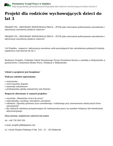 Powiatowy Urząd Pracy w Sokółce http://pupsokolka.pl/wydarzenie/222/projekt-dla-rodzicow-wychowujacych-dzieci-do-lat-3 Projekt dla rodziców wychowujących dzieci do lat 3 PROJEKT PN. „PROGRAMY RÓWNOWAGA PRACA – ŻYCIE jako instrument podtrzymania zatrudnienia i aktywizacji zawodowej młodych rodziców” PROJEKT PN. „PROGRAMY RÓWNOWAGA PRACA – ŻYCIE jako instrument podtrzymania zatrudnienia i aktywizacji zawodowej młodych rodziców” Cel Projektu: wsparcie i aktywizacja zawodowa osób pozostających bez zatrudnienia pełniących funkcje opiekuńcze nad dziećmi do lat 3. Realizator Projektu: Podlaskie Odział Narodowego Forum Doradztwa Kariery z siedzibą w Białymstoku w partnerstwie z Instytutem Rynku Pracy i Edukacji w Białymstoku Udział w projekcie jest bezpłatny! Podczas szkoleń zapewniamy: ● ● ● ● wyżywienie, zwrot kosztów dojazdu materiały szkoleniowe profesjonalną opiekę animatorów nad dziećmi Wsparcie oferowane w ramach projektu: ● ● ● ● warsztaty „Mama/tata wraca do pracy” indywidualny coaching i doradztwo zawodowe szkolenia „Sposoby godzenia życia zawodowego i rodzinnego przy zastosowaniu elastycznych form zatrudnienia” dla chętnych szkolenia przygotowujące do wykonywania pracy na zasadzie telepracy lub świadczenia aktywizacyjnego Masz pytania, wątpliwości zadzwoń lub napisz tel. +48 730 300 328 e-mail: [email protected] ul. I Armii Wojska Polskiego 9 lok. 216, 15 – 102 Białystok Sporz.: Zuzanna Akimowicz - doradca zawodowy