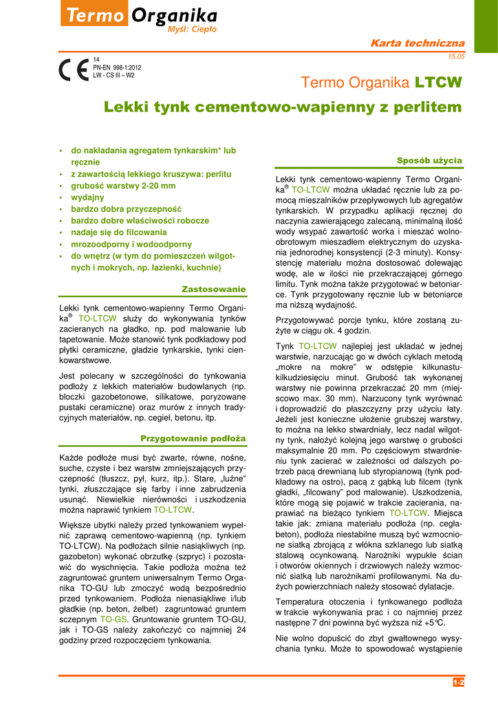 Karta techniczna 15.05 14 PN-EN 998-1:2012 LW - CS III – W2 Termo Organika LTCW Lekki tynk cementowo-wapienny z perlitem • • • • • • • • • do nakładania agregatem tynkarskim* lub ręcznie z zawartością lekkiego kruszywa: perlitu grubość warstwy 2-20 mm wydajny bardzo dobra przyczepność bardzo dobre właściwości robocze nadaje się do filcowania mrozoodporny i wodoodporny do wnętrz (w tym do pomieszczeń wilgotnych i mokrych, np. łazienki, kuchnie) Zastosowanie Lekki tynk cementowo-wapienny Termo Organi® ka TO-LTCW służy do wykonywania tynków zacieranych na gładko, np. pod malowanie lub tapetowanie. Może stanowić tynk podkładowy pod płytki ceramiczne, gładzie tynkarskie, tynki cienkowarstwowe. Jest polecany w szczególności do tynkowania podłoży z lekkich materiałów budowlanych (np. bloczki gazobetonowe, silikatowe, poryzowane pustaki ceramiczne) oraz murów z innych tradycyjnych materiałów, np. cegieł, betonu, itp. Przygotowanie podłoża Każde podłoże musi być zwarte, równe, nośne, suche, czyste i bez warstw zmniejszających przyczepność (tłuszcz, pył, kurz, itp.). Stare, „luźne” tynki, złuszczające się farby i inne zabrudzenia usunąć. Niewielkie nierówności i uszkodzenia można naprawić tynkiem TO-LTCW. Większe ubytki należy przed tynkowaniem wypełnić zaprawą cementowo-wapienną (np. tynkiem TO-LTCW). Na podłożach silnie nasiąkliwych (np. gazobeton) wykonać obrzutkę (szpryc) i pozostawić do wyschnięcia. Takie podłoża można też zagruntować gruntem uniwersalnym Termo Organika TO-GU lub zmoczyć wodą bezpośrednio przed tynkowaniem. Podłoża nienasiąkliwe i/lub gładkie (np. beton, żelbet) zagruntować gruntem sczepnym TO-GS. Gruntowanie gruntem TO-GU, jak i TO-GS należy zakończyć co najmniej 24 godziny przed rozpoczęciem tynkowania. Sposób użycia Lekki tynk cementowo-wapienny Termo Organi® ka TO-LTCW można układać ręcznie lub za pomocą mieszalników przepływowych lub agregatów tynkarskich. W przypadku aplikacji ręcznej do naczynia zawierającego zalecaną, minimalną ilość wody wsypać zawartość worka i mieszać wolnoobrotowym mieszadłem elektrycznym do uzyskania jednorodnej konsystencji (2-3 minuty). Konsystencję materiału można dostosować dolewając wodę, ale w ilości nie przekraczającej górnego limitu. Tynk można także przygotować w betoniarce. Tynk przygotowany ręcznie lub w betoniarce ma niższą wydajność. Przygotowywać porcje tynku, które zostaną zużyte w ciągu ok. 4 godzin. Tynk TO-LTCW najlepiej jest układać w jednej warstwie, narzucając go w dwóch cyklach metodą „mokre na mokre” w odstępie kilkunastukilkudziesięciu minut. Grubość tak wykonanej warstwy nie powinna przekraczać 20 mm (miejscowo max. 30 mm). Narzucony tynk wyrównać i doprowadzić do płaszczyzny przy użyciu łaty. Jeżeli jest konieczne ułożenie grubszej warstwy, to można na lekko stwardniały, lecz nadal wilgotny tynk, nałożyć kolejną jego warstwę o grubości maksymalnie 20 mm. Po częściowym stwardnieniu tynk zacierać w zależności od dalszych potrzeb pacą drewnianą lub styropianową (tynk podkładowy na ostro), pacą z gąbką lub filcem (tynk gładki, „filcowany” pod malowanie). Uszkodzenia, które mogą się pojawić w trakcie zacierania, naprawiać na bieżąco tynkiem TO-LTCW. Miejsca takie jak: zmiana materiału podłoża (np. cegłabeton), podłoża niestabilne muszą być wzmocnione siatką zbrojącą z włókna szklanego lub siatką stalową ocynkowaną. Narożniki wypukłe ścian i otworów okiennych i drzwiowych należy wzmocnić siatką lub narożnikami profilowanymi. Na dużych powierzchniach należy stosować dylatacje. Temperatura otoczenia i tynkowanego podłoża w trakcie wykonywania prac i co najmniej przez następne 7 dni powinna być wyższa niż +5°C. Nie wolno dopuścić do zbyt gwałtownego wysychania tynku. Może to spowodować wystąpienie 1-2 Karta techniczna 15.05 spękań na jego powierzchni. W upalne dni lub przy silnym ogrzewaniu tynk skrapiać wodą. Nie używać zardzewiałych lub brudnych narzędzi. Świeże zabrudzenia tynkiem myć wodą. Tynk po stwardnieniu można usunąć tylko mechanicznie. Tynku nie wolno mieszać z cementem, wapnem, piaskiem, innymi klejami, zaprawami i dodatkami chemicznymi. Nie należy dodawać więcej wody od podanego zakresu. Bezpieczeństwo użytkowania Wyrób zawiera cement i po wymieszaniu z wodą daje odczyn alkaliczny. Nie wdychać pyłów i unikać ochlapania zaprawą. W przypadku kontaktu wyrobu z oczami lub skórą należy przemyć je dużą ilością wody i zasięgnąć porady lekarza, skórę umyć wodą i mydłem. Przechowywać w miejscu niedostępnym dla dzieci. W trakcie wykonywania prac nosić odzież ochronną i okulary ochronne. Uwaga Oprócz przedstawionych powyżej zaleceń należy kierować się zasadami sztuki budowlanej i BHP. Producent gwarantuje jakość wyrobu, lecz nie ma żadnego wpływu na sposób, miejsce i warunki jego magazynowania i zastosowania. Prace budowlane powinny być przeprowadzone przez fachowo przygotowanych wykonawców. • Trwałość (odporność na zamrażanieodmrażanie): - ubytek masy: < 3% - spadek wytrzymałości na zginanie: < 5% - spadek wytrzymałości na ściskanie: < 5% • Wydajność: ok. 24-28 litrów zaprawy z worka 30 kg, tj ok. 800-930 litrów z 1 tony (W przypadku przygotowywania ręcznego lub w betoniarce i przy temperaturze poniżej +100C wydajność może być mniejsza) • Grubość warstwy: 2-20 mm (maks. 2 warstwy) • Orientacyjne zużycie: 2 ok. 11-14 kg na 1m tynku przy grubości 10 mm • Czas użycia zaprawy: do 4 godz. • Temperatura stosowania i podłoża: +5°C ÷ +30°C • Opakowania: Opak. Worki 30,0 kg Paleta Kod EAN 1260 kg 5901592194175 (42 szt. x 30 kg) • Przechowywanie: 12 miesięcy od daty produkcji w oryginalnych, zamkniętych workach, składowanych na paletach w suchych warunkach. * Producent nie gwara
