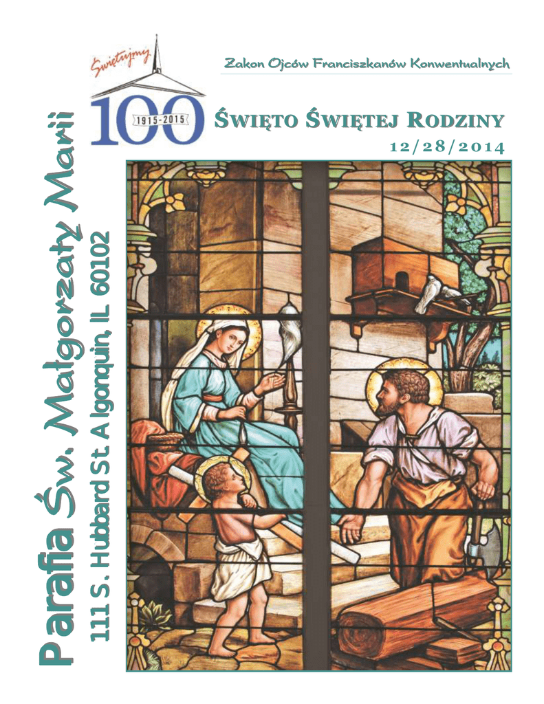 Ś WIĘTO Ś WIĘTEJ R ODZINY 12/28/2014 111 S. Hubbard St. Algonquin, lL 60102 Parafia Św. Małgorzaty Marii Zakon Ojców Franciszkanów Konwentualnych OD PROBOSZCZA Mieli również złożyć w ofierze parę synogarlic albo dwa młode gołębie, zgodnie z przepisem Prawa Pańskiego (Łk 2, 24). Drodzy Przyjaciele! W swoim komentarzu do Ewangelii Św. Łukasza W Barclay tak wyjaśnia prawo, które Maryja i Józef chcieli wypełnić w świątyni: “Po urodzeniu dziecka płci męskiej niewiasta była nieczysta przez czterdzieści dni, jeżeli zaś urodziła dziewczynkę – okres nieczystości trwał osiemdziesiąt dni. W okresie tym mogła przebywać w domu i wypełniać swoje codzienne obowiązki, nie mogła natomiast wejść do świątyni lub brać udziału w jakichkolwiek obrzędach religijnych (3 Mojż. 12). Po upływie tego okresu musiała złożyć w świątyni jagnię na ofiarę całopalną i młodego gołąbka na ofiarę za grzech. Była to dosyć kosztowna ofiara i dlatego prawo powiadało (3 Mojż. 12, 8), że zamiast jagnięcia mogła przynieść drugiego gołąbka. Ofiara dwóch gołąbków zamiast jagnięcia i gołąbka była nazywana ofiarą ubogich. Tak więc Maria złożyła ofiarę jako biedna. I znowu widzimy, że Jezus narodził się w zwyczajnej rodzinie, w domu bez wygód, gdzie każdy grosz liczono bardzo dokładnie, gdzie wiedziano o trudnościach zdobywania środków na życie, gdzie często zaglądał niedostatek. Gdy z obawą patrzymy na piętrzące się trudności materialne, powinniśmy pamiętać o tym, że Jezus wiedział, co znaczy trudność wiązania końca z końcem”. Dzisiejsza Ewangelia mówi nam także, że rodzice Jezusa przynieśli niemowlę do świątyni, aby je przedstawić Bogu. Przez ten akt ofiarowują dziecko Bogu i zawierzają Mu życie swojego Syna. Również w naszych rodzinach powinniśmy jak najczęściej zawierzać życie naszych dzieci Bogu. Nie możemy przeżyć za nich życia, ale możemy ich życie oddać Bogu zawsze. Jedna z więźniarek stalinowskiego łagru opisuje chrzest dzieci, które rodziły się w warunkach obozowych. „W obozowej chlewni, w warunkach, które jaskrawo odbiegają od normalnej estetycznej oprawy naszego otwarcia na sacrum, autorka wspomnień odmawiała przy niemowlęciu modlitwę: Niech twoje zmysły będą czyste, twój rozum – jasny. Niech twoja droga prowadzi ku dobru, a twoje czyny służą prawdzie. I niech się stanie Twoja wola, Panie. Amen. Gdy po odmówieniu Ojcze nasz i wyznaniu wiary polewała główkę niemowlęcia wodą, recytując formułę chrztu, miała niezłomne odczucie, że to nie ja czynię to, lecz moc, która jest wyższa ode mnie i która mną kieruje” (J. Życiński, Medytacje sokratejskie, Lublin 1991, s. 124). Niezależnie od naszej sytuacji nie możemy dać dzieciom nic lepszego, jak oddać je Bożej opiece. Wiedzieli o tym Maryja i Józef, ale rozumiała to także więźniarka stalinowskiego obozu. Pokój i Dobro, Fr. Piotr Sarnicki, OFM, Conv. Słowa Ewangelii wg św. Łukasza 2,22-40 Gdy upłynęły dni Ich oczyszczenia według Prawa Mojżeszowego, Rodzice przynieśli Jezusa do Jerozolimy, aby Go przedstawić Panu. Tak bowiem jest napisane w Prawie Pańskim: „Każde pierworodne dziecko płci męskiej będzie poświęcone Panu”. Mieli również złożyć w ofierze parę synogarlic albo dwa młode gołębie, zgodnie z przepisem Prawa Pańskiego. A żył w Jerozolimie człowiek, imieniem Symeon. Był to człowiek prawy i pobożny, wyczekiwał pociechy Izraela, a Duch Święty spoczywał na nim. Jemu Duch Święty objawił, że nie ujrzy śmierci, aż zobaczy Mesjasza Pańskiego. Za natchnieniem więc Ducha przyszedł do świątyni. A gdy Rodzice wnosili Dzieciątko Jezus, aby postąpić z Nim według zwyczaju Prawa, on wziął Je w objęcia, błogosławił Boga i mówił: „Teraz, o Władco, pozwól odejść słudze Twemu w pokoju, według Twojego słowa. Bo moje oczy ujrzały Twoje zbawienie, któreś przygotował wobec wszystkich narodów: światło na oświecenie pogan i chwałę ludu Twego, Izraela”. A Jego ojciec i Matka dziwili się temu, co o Nim mówiono. Symeon zaś błogosławił Ich i rzekł do Maryi, Matki Jego: „Oto Ten przeznaczony jest na upadek i na powstanie wielu w Izraelu i na znak, któremu sprzeciwiać się będą. A Twoją duszę miecz przeniknie, aby na jaw wyszły zamysły serc wielu. Była tam również prorokini Anna, córka Fanuela z pokolenia Asera, bardzo podeszła w latach. Od swego panieństwa siedem lat żyła z mężem i pozostała wdową. Liczyła już osiemdziesiąty czwarty rok życia. Nie rozstawała się ze świątynią, służąc Bogu w postach i modlitwach dniem i nocą. Przyszedłszy w tej właśnie chwili, sławiła Boga i mówiła o Nim wszystkim, którzy oczekiwali wyzwolenia Jerozolimy. A gdy wypełnili wszystko według Prawa Pańskiego, wrócili do Galilei, do swego miasta Nazaret. Dziecię zaś rosło i nabierało mocy, napełniając się mądrością, a łaska Boża spoczywała na Nim. CZYTANIE Z KSIĘGI SYRACYDESA 3,2-6.12-14 Pan uczcił ojca przez dzieci, a prawa matki nad synami utwierdził. Kto czci ojca, zyskuje odpuszczenie grzechów, a kto szanuje matkę, jakby skarby gromadził. Kto czci ojca, radość mieć będzie z dzieci, a w czasie modlitwy swej będzie wysłuchany. Kto szanuje ojca, długo żyć będzie, a kto posłuszny jest Panu, da wytchnienie swej matce. Synu, wspomagaj swego ojca w starości, nie zasmucaj go w jego życiu. A jeśliby nawet rozum stracił, miej wyrozumiałość, nie pogardzaj nim, choć jesteś w pełni sił. Miłosierdzie względem ojca nie pójdzie w zapomnienie, w miejsce grzechów zamieszka u ciebie. CZYTANIE Z LISTU ŚW. PAWŁA APOSTOŁA DO KOLOSAN 3,12-21 SZCZĘŚLIWEGO NOWEGO ROKU ! W imieniu całej naszej Franciszkańskiej Wspólnoty składam Wam płynące z serca życzenia Noworoczne. Niech Bóg Was błogosławi i strzeże, niech zwróci ku Wam swoje oblicze i niech Was obdar