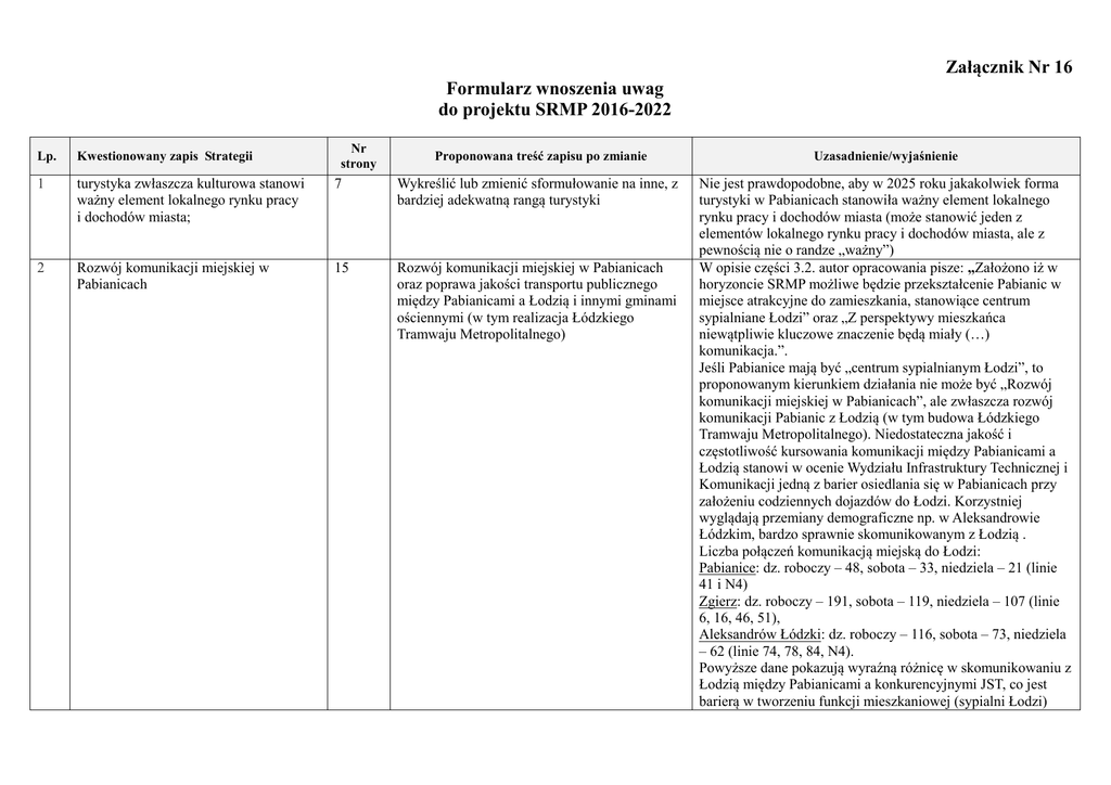 Załącznik Nr 16 Formularz wnoszenia uwag do projektu SRMP 2016-2022 Lp. Kwestionowany zapis Strategii 1 turystyka zwłaszcza kulturowa stanowi ważny element lokalnego rynku pracy i dochodów miasta; 2 Rozwój komunikacji miejskiej w Pabianicach Nr strony Proponowana treść zapisu po zmianie Uzasadnienie/wyjaśnienie 7 Wykreślić lub zmienić sformułowanie na inne, z bardziej adekwatną rangą turystyki 15 Rozwój komunikacji miejskiej w Pabianicach oraz poprawa jakości transportu publicznego między Pabianicami a Łodzią i innymi gminami ościennymi (w tym realizacja Łódzkiego Tramwaju Metropolitalnego) Nie jest prawdopodobne, aby w 2025 roku jakakolwiek forma turystyki w Pabianicach stanowiła ważny element lokalnego rynku pracy i dochodów miasta (może stanowić jeden z elementów lokalnego rynku pracy i dochodów miasta, ale z pewnością nie o randze „ważny”) W opisie części 3.2. autor opracowania pisze: „Założono iż w horyzoncie SRMP możliwe będzie przekształcenie Pabianic w miejsce atrakcyjne do zamieszkania, stanowiące centrum sypialniane Łodzi” oraz „Z perspektywy mieszkańca niewątpliwie kluczowe znaczenie będą miały (…) komunikacja.”. Jeśli Pabianice mają być „centrum sypialnianym Łodzi”, to proponowanym kierunkiem działania nie może być „Rozwój komunikacji miejskiej w Pabianicach”, ale zwłaszcza rozwój komunikacji Pabianic z Łodzią (w tym budowa Łódzkiego Tramwaju Metropolitalnego). Niedostateczna jakość i częstotliwość kursowania komunikacji między Pabianicami a Łodzią stanowi w ocenie Wydziału Infrastruktury Technicznej i Komunikacji jedną z barier osiedlania się w Pabianicach przy założeniu codziennych dojazdów do Łodzi. Korzystniej wyglądają przemiany demograficzne np. w Aleksandrowie Łódzkim, bardzo sprawnie skomunikowanym z Łodzią . Liczba połączeń komunikacją miejską do Łodzi: Pabianice: dz. roboczy – 48, sobota – 33, niedziela – 21 (linie 41 i N4) Zgierz: dz. roboczy – 191, sobota – 119, niedziela – 107 (linie 6, 16, 46, 51), Aleksandrów Łódzki: dz. roboczy – 116, sobota – 73, niedziela – 62 (linie 74, 78, 84, N4). Powyższe dane pokazują wyraźną różnicę w skomunikowaniu z Łodzią między Pabianicami a konkurencyjnymi JST, co jest barierą w tworzeniu funkcji mieszkaniowej (sypialni Łodzi) 3 Miasto Pabianice Urząd Miejski w Pabianicach 13 - 20 Urząd Miejski w Pabianicach W polu Podmiot odpowiedzialny powinien pozostać jednoznaczny jeden zapis, w ocenie Wydz. ITK powinien być to: Urząd Miejski w Pabianicach 4 Zapewnienie wysokiej jakości warunków do życia i pracy poprzez podniesienie jakości infrastruktury i usług publicznych. Poprawa bezpieczeństwa publicznego w ruchu drogowym. 22 dopisać: Poprawa jakości powietrza. Poprawa jakości środowiska miejskiego. Zakupione autobusy niskoemisyjne, połączone z wycofaniem najstarszych autobusów z floty MZK, ograniczą emisję zanieczyszczeń transportowych. 5 Zapewnienie wysokiej jakości warunków do życia i pracy poprzez podniesienie jakości infrastruktury i usług publicznych. 25 dopisać: Poprawa bezpieczeństwa publicznego w ruchu drogowym. Poprawa jakości powietrza. Poprawa jakości środowiska miejskiego. 6 Gmina miejska Pabianice graniczy z następującymi gminami: – od zachodu z gminą Dobroń; – od północy z gminą Lutomiersk oraz Konstantynów Łódzki; – od południa z gminą Dłutów; – od wschodu z gminą Ksawerów oraz Wodzierady. 40 Gmina miejska Pabianice graniczy z następującymi gminami: – od zachodu z gminą Dobroń; – od północy i od południa z gminą Pabianice; – od wschodu z gminą Ksawerów oraz Rzgów. Modernizacja linii tramwajowej przyczyni się do wzrostu jej atrakcyjności i pozyskania nowych pasażerów, którzy częściowo zrezygnują z komunikacji indywidualnej (samochody osobowe), co przyczyni się do poprawy jakości powietrza. Zmiana organizacji ruchu w ciągu ulic Warszawskiej, Stary Rynek i Zamkowej poprawi bezpieczeństwo publiczne w ruchu drogowym (dobudowane perony przystankowe wyspowe, wydzielone pasy ruchu, w tym odrębnie dla komunikacji miejskiej). Błędny opis gmin sąsiadujących. 7 Gminę miejską Pabianice cechują 42 dogodna lokalizacja, bowiem przez miasto biegnie droga krajowa nr 14, która łączy Łódź z Wrocławiem. Ponadto na wschód od Pabianic biegnie trasa szybkiego ruchu, która z kolei łączy Łódź z Katowicami (droga tranzytowa na Warszawę i Gdańsk). Niedaleko miasta powstaje droga ekspresowa S14, zwana Zachodnią Obwodnicą Łodzi. W sierpniu 2015 r. trasa ta została wpisana na Miasto Pabianice cechuje dogodna lokalizacja, bowiem położone jest w łódzkim ringu drogowym, ograniczonym od południa drogą ekspresową S-8 (Łódź – Wrocław), od zachodu drogą S-14 (wybudowany fragment od S-8 do Pabianic, docelowo do autostrady A-2 jako Zachodnia Obwodnica Łodzi), od północy autostradą A-2 (Świecko – Warszawa), od wschodu autostradą A1 (Gdańsk – Łódź, docelowo dalej na południe). Przez Pabianice przebiega droga krajowa nr 71 (Stryków – Nieprecyzyjne dane. Droga krajowa nr 14 nie przebiega przez Pabianice. Brak wzmianki o bezpośrednim sąsiedztwie S-8 oraz bliskości autostrad A-1 i A-2. Droga ekspresowa S-14 we fragmencie jest już zbudowana. podstawową listę rządowego programu budowy dróg do roku 2023, natomiast w październiku bieżącego roku Urząd Wojewódzki w Łodzi wydał zezwolenie na realizację tej inwestycji dla pierwszego odcinka, od Węzła Lublinek do Węzła Teofilów. Trasa S14 w przyszłości połączy autostradę A2 z drogą ekspresową S8. Kolejnym atutem jest położenie miasta Pabianice przy jednym z ważniejszych szlaków kolejowych. Linia z możliwością rozładunku towarów umożliwia dotarcie do wielu miast w całej Polsce 8 Rzgów). 42 9 rzeki Pabianka i Dobrzynka, będące dopływami Neru 43 10 Tab. 20 – główni pracodawcy 49 1 2 Przez Pabianice pr