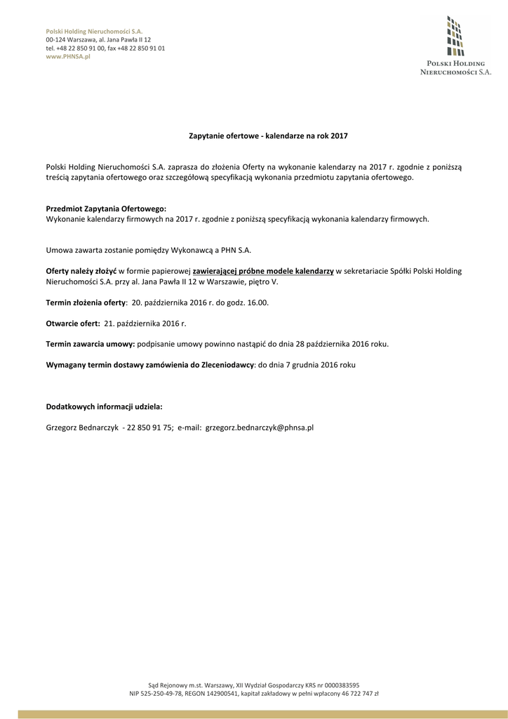 Polski Holding Nieruchomości S.A. 00-124 Warszawa, al. Jana Pawła II 12 tel. +48 22 850 91 00, fax +48 22 850 91 01 www.PHNSA.pl Zapytanie ofertowe - kalendarze na rok 2017 Polski Holding Nieruchomości S.A. zaprasza do złożenia Oferty na wykonanie kalendarzy na 2017 r. zgodnie z poniższą treścią zapytania ofertowego oraz szczegółową specyfikacją wykonania przedmiotu zapytania ofertowego. Przedmiot Zapytania Ofertowego: Wykonanie kalendarzy firmowych na 2017 r. zgodnie z poniższą specyfikacją wykonania kalendarzy firmowych. Umowa zawarta zostanie pomiędzy Wykonawcą a PHN S.A. Oferty należy złożyć w formie papierowej zawierającej próbne modele kalendarzy w sekretariacie Spółki Polski Holding Nieruchomości S.A. przy al. Jana Pawła II 12 w Warszawie, piętro V. Termin złożenia oferty: 20. października 2016 r. do godz. 16.00. Otwarcie ofert: 21. października 2016 r. Termin zawarcia umowy: podpisanie umowy powinno nastąpić do dnia 28 października 2016 roku. Wymagany termin dostawy zamówienia do Zleceniodawcy: do dnia 7 grudnia 2016 roku Dodatkowych informacji udziela: Grzegorz Bednarczyk - 22 850 91 75; e-mail: [email protected] Sąd Rejonowy m.st. Warszawy, XII Wydział Gospodarczy KRS nr 0000383595 NIP 525-250-49-78, REGON 142900541, kapitał zakładowy w pełni wpłacony 46 722 747 zł Specyfikacja wykonania kalendarzy firmowych dla PHN S.A. na rok 2017 Uwaga ogólna: projekty graficzne kalendarzy zostaną opracowane przez PHN na podstawie wytycznych technicznych przedstawionych przez Wykonawcę. 1. Kalendarze książkowe: ilość 250 sztuk Format: około 200 x 270 OPRAWA miękka skóropodobna, kolor oprawy do ustalenia, wewnątrz papier chamois Układ kalendarium: 2 strony – 7 dni Kalendarium w jęz.: PL, Ang., Niem., Ros., Francuski Logotyp PHN S.A. oraz rok na wierzchniej okładce Dodatkowo ok. 50 sztuk z pośród tych kalendarzy musi zawierać w dolnej prawej części okładki grawer imię i nazwisko – podamy dokładne dane w trakcie realizacji zamówienia Wstążka z nadrukiem adresu www.phnsa.pl 4 strony reklamowe wewnątrz kalendarza w pełnym kolorze Druk offsetowy wys. jakości 2. Kalendarze ścienne: ilość 350 sztuk Kalendarze jednodzielne lub trójdzielne Wymiar całkowity około 60-80cm wysokość i 30-40cm szerokość Główka usztywniana Plecki karton co najmniej 300g, druk CMYK Okienko przesuwne zamontowane na kalendarz Kalendarze zapakowane w oddzielne koperty 3. Kalendarze biurkowe: ilość 100 sztuk Nadruk reklamowy w pełnym kolorze (loga + tekst) po obu stronach kalendarza Okładka wierzchnia kalendarza (pierwsza strona przed kalendariami) nadruk reklamowy w pełnym kolorze Nazwa bieżącego miesiąca przy rozkładówce w każdym tygodniu Dostawa: Wykonawca dokona dostawy kalendarzy pod 2 wskazane adresy: Polski Holding Nieruchomości S.A. al. Jana Pawła II 12, 00-124 Warszawa Ilości: Książkowe 220 sztuk Ścienne 250 sztuk Biurkowe 100 sztuk Dalmor S.A. ul. Hryniewieckiego 10, 81-340 Gdynia Ilości: Książkowe 30 sztuk Ścienne 100 sztuk Oferty na wykonanie kalendarzy powinny zawierać: • Zestawienie cenowe dla proponowanych kalendarzy obejmujące oznakowania i wkładki reklamowe do kalendarzy zgodnie ze specyfikacją • Zestawienie cenowe dla wszelkich ewentualnych dodatkowych kosztów w tym dotyczące dostawy kalendarzy pod wskazane adresy przez Zleceniodawcę (patrz punkt Dostawa) • próbne modele kalendarzy zgodnie z przesłanymi wymiarami i przykładami kalendarzy Sąd Rejonowy m.st. Warszawy, XII Wydział Gospodarczy KRS nr 000038595 NIP 525-250-49-78, REGON 142900541, kapitał zakładowy w pełni wpłacony 46 482 044 zł Oferta 1. Zamawiający nie dopuszcza składania ofert częściowych. 2. Koszty związane z przygotowaniem i złożeniem oferty ponosi Oferent (możliwość późniejszego odbioru nadesłanych próbek kalendarzy) 3. Wymagane jest, aby Oferta była sporządzona na piśmie, w języku polskim trwałym i czytelnym pismem. Oferty w wersji papierowej prosimy dostarczyć w zamkniętych kopertach wraz załącznikami z dopiskiem: „Postępowanie na wybór oferenta na wykonanie kalendarzy firmowych dla PHN S.A. w Warszawie” na poniższy adres: Polski Holding Nieruchomości S.A. przy al. Jana Pawła II 12 w Warszawie (kancelaria, V. piętro). Zamawiający zastrzega sobie prawo do odrzucenia ofert, które wpłyną po terminie wskazanym powyżej, bez ich rozpatrzenia. Płatność Płatność przelewem w terminie 21 dni od daty złożenia faktury przez Wykonawcę Zamawiającemu po podpisaniu protokołu odbioru wszystkich zamówionych kalendarzy. Prawo Właściwe Oferta podlega prawu Rzeczypospolitej Polskiej, a językiem właściwym do prowadzenia wszelkiej związanej z nią korespondencji jest język polski. Dodatkowych informacji udziela: Grzegorz Bednarczyk - 22 850 91 75; e-mail: [email protected] Sąd Rejonowy m.st. Warszawy, XII Wydział Gospodarczy KRS nr 000038595 NIP 525-250-49-78, REGON 142900541, kapitał zakładowy w pełni wpłacony 46 482 044 zł