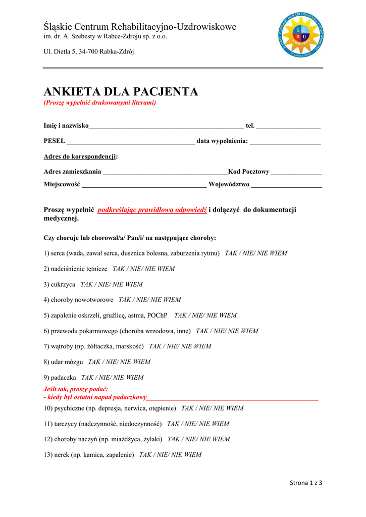 ankieta dla pacjenta - Śląskie Centrum Rehabilitacyjno Uzdrowiskowe
