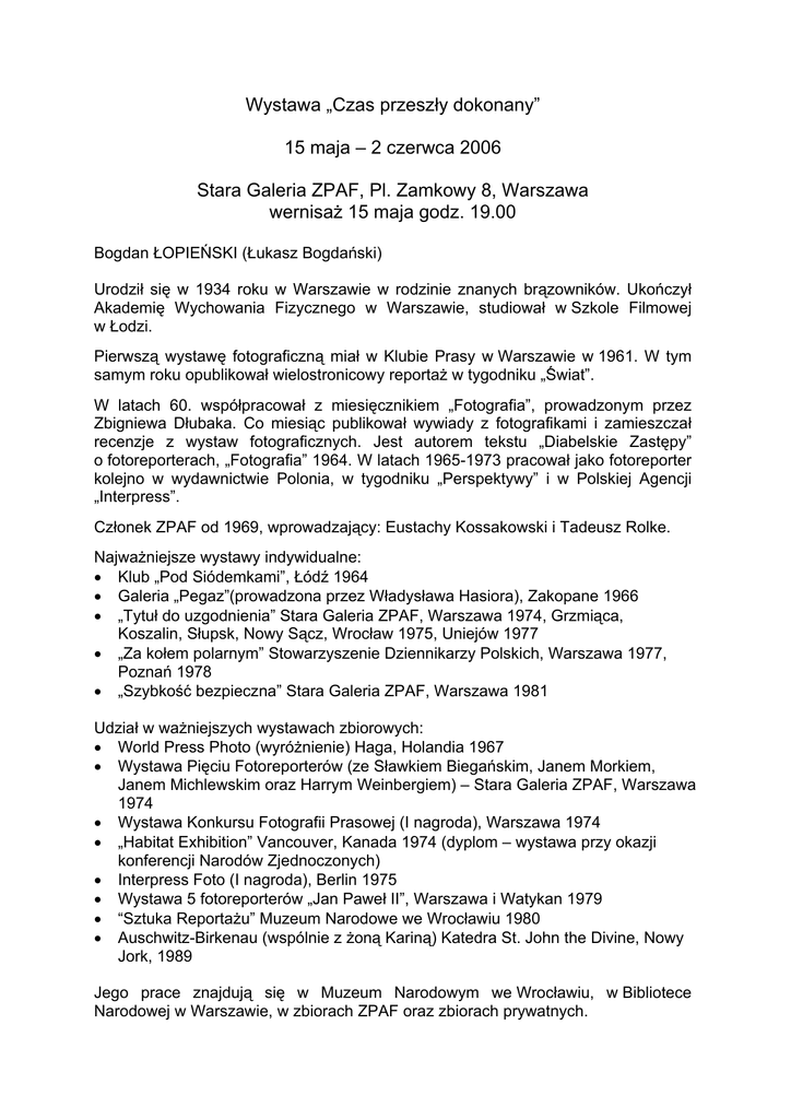 Wystawa „Czas przeszły dokonany” 15 maja – 2 czerwca 2006 Stara Galeria ZPAF, Pl. Zamkowy 8, Warszawa wernisaż 15 maja godz. 19.00 Bogdan ŁOPIEŃSKI (Łukasz Bogdański) Urodził się w 1934 roku w Warszawie w rodzinie znanych brązowników. Ukończył Akademię Wychowania Fizycznego w Warszawie, studiował w Szkole Filmowej w Łodzi. Pierwszą wystawę fotograficzną miał w Klubie Prasy w Warszawie w 1961. W tym samym roku opublikował wielostronicowy reportaż w tygodniku „Świat”. W latach 60. współpracował z miesięcznikiem „Fotografia”, prowadzonym przez Zbigniewa Dłubaka. Co miesiąc publikował wywiady z fotografikami i zamieszczał recenzje z wystaw fotograficznych. Jest autorem tekstu „Diabelskie Zastępy” o fotoreporterach, „Fotografia” 1964. W latach 1965-1973 pracował jako fotoreporter kolejno w wydawnictwie Polonia, w tygodniku „Perspektywy” i w Polskiej Agencji „Interpress”. Członek ZPAF od 1969, wprowadzający: Eustachy Kossakowski i Tadeusz Rolke. Najważniejsze wystawy indywidualne: • Klub „Pod Siódemkami”, Łódź 1964 • Galeria „Pegaz”(prowadzona przez Władysława Hasiora), Zakopane 1966 • „Tytuł do uzgodnienia” Stara Galeria ZPAF, Warszawa 1974, Grzmiąca, Koszalin, Słupsk, Nowy Sącz, Wrocław 1975, Uniejów 1977 • „Za kołem polarnym” Stowarzyszenie Dziennikarzy Polskich, Warszawa 1977, Poznań 1978 • „Szybkość bezpieczna” Stara Galeria ZPAF, Warszawa 1981 Udział w ważniejszych wystawach zbiorowych: • World Press Photo (wyróżnienie) Haga, Holandia 1967 • Wystawa Pięciu Fotoreporterów (ze Sławkiem Biegańskim, Janem Morkiem, Janem Michlewskim oraz Harrym Weinbergiem) – Stara Galeria ZPAF, Warszawa 1974 • Wystawa Konkursu Fotografii Prasowej (I nagroda), Warszawa 1974 • „Habitat Exhibition” Vancouver, Kanada 1974 (dyplom – wystawa przy okazji konferencji Narodów Zjednoczonych) • Interpress Foto (I nagroda), Berlin 1975 • Wystawa 5 fotoreporterów „Jan Paweł II”, Warszawa i Watykan 1979 • “Sztuka Reportażu” Muzeum Narodowe we Wrocławiu 1980 • Auschwitz-Birkenau (wspólnie z żoną Kariną) Katedra St. John the Divine, Nowy Jork, 1989 Jego prace znajdują się w Muzeum Narodowym we Wrocławiu, w Bibliotece Narodowej w Warszawie, w zbiorach ZPAF oraz zbiorach prywatnych. 2 Wystawa „Czas przeszły dokonany” przypada na 50-lecie działalności fotoreportera. Najwcześniejsze zdjęcia na wystawie pochodzą z 1957 r. Bogdan Łopieński jest obserwatorem życia codziennego. Jego zdjęcia niosą głęboką wiedzę socjologiczną o czasach, często w znakomitej formie plastycznej. Mimo iż jest fotoreporterem, nie pokazuje fotoreportaży, lecz pojedyncze zdjęcia. Mówiąc językiem środowiska – jest „kolekcjonerem klatek”. Wystawa to opowieść (81 zdjęć) o życiu codziennym w PRL. Obejmuje zakres czasowy od wczesnego Gomułki do późnego Gierka. 27 prac na wystawie to zdjęcia znanych postaci z życia artystycznego, politycznego i sportowego. Warto tu opowiedzieć historię jednego zdjęcia. „Przyspieszajmy obywatele” – Edward Gierek i Piotr Jaroszewicz patrzą na zegarki – to ikona PRL-u. Zdjęcie dostało I nagrodę na konkursie fotografii prasowej. Jednak nie można było go opublikować, gdyż cenzura nie zgadzała się na takie „niepoważne” ujęcie przywódców. Redaktorzy nie wiedzieli, co robić, gdyż wyniki konkursu już ogłoszono w prasie. Zwrócono się do sekretarzy Gierka. Ci nie odważyli się sami zadecydować i ostatecznie sam Edward Gierek orzekł, że zdjęcie może być opublikowane. I lawina ruszyła. Zdjęcie opublikowano około 200 razy. Za same wierszówki z tych publikacji można było kupić marzenie Polaków – fiata 126p. Zdjęcie w wielu egzemplarzach i w wielkich formatach niesione było w pochodzie 1-majowym. Wśród sekretarzy wojewódzkich powstała moda na pozowanie do fotografii ze spoglądaniem na zegarek. Ale publiczność jest przekorna, nadano spontanicznie temu zdjęciu tytuł „Na nas już czas”. Wtedy cenzura znów zabroniła publikowania zdjęcia. Gdy nadeszły czasy Solidarności, wydrukowano plakat – przedarte zdjęcie Gierka i Jaroszewicza. O tych perypetiach telewizja zrobiła film, datę emisji wyznaczono na 13 grudnia 1981 r. Ale wtedy już w telewizji leciał WRON. Oglądający fotografie z tamtych lat często mówią „ależ wtedy były tematy!”. Dziś też są takie tematy, ale ich nie widać, tak jak nie było ich widać kiedyś. Fotograf musi umieć je zobaczyć, umieć wiedzieć więcej niż inni. Wszystkie powiększenia są uzyskane metodą tradycyjną. Techniki komputerowe nie były stosowane. Prace z wystawy są na sprzedaż.
