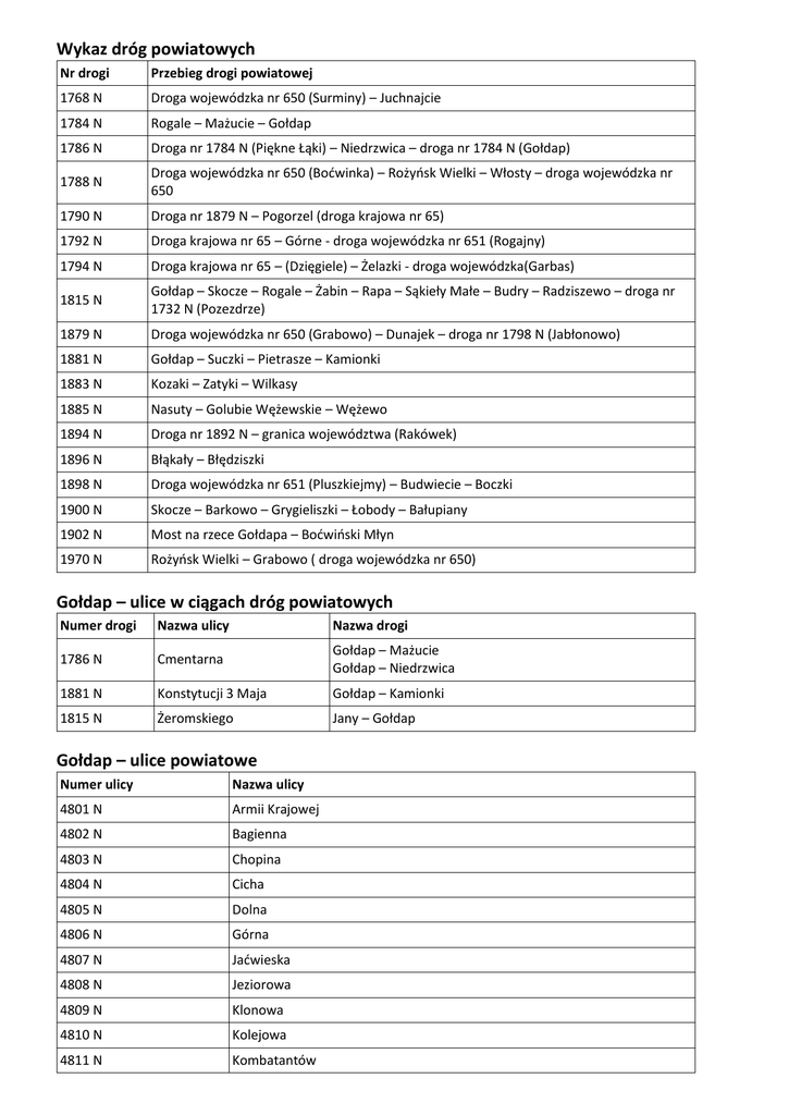 Wykaz dróg powiatowych Nr drogi Przebieg drogi powiatowej 1768 N Droga wojewódzka nr 650 (Surminy) – Juchnajcie 1784 N Rogale – Mażucie – Gołdap 1786 N Droga nr 1784 N (Piękne Łąki) – Niedrzwica – droga nr 1784 N (Gołdap) 1788 N Droga wojewódzka nr 650 (Boćwinka) – Rożyńsk Wielki – Włosty – droga wojewódzka nr 650 1790 N Droga nr 1879 N – Pogorzel (droga krajowa nr 65) 1792 N Droga krajowa nr 65 – Górne - droga wojewódzka nr 651 (Rogajny) 1794 N Droga krajowa nr 65 – (Dzięgiele) – Żelazki - droga wojewódzka(Garbas) 1815 N Gołdap – Skocze – Rogale – Żabin – Rapa – Sąkieły Małe – Budry – Radziszewo – droga nr 1732 N (Pozezdrze) 1879 N Droga wojewódzka nr 650 (Grabowo) – Dunajek – droga nr 1798 N (Jabłonowo) 1881 N Gołdap – Suczki – Pietrasze – Kamionki 1883 N Kozaki – Zatyki – Wilkasy 1885 N Nasuty – Golubie Wężewskie – Wężewo 1894 N Droga nr 1892 N – granica województwa (Rakówek) 1896 N Błąkały – Błędziszki 1898 N Droga wojewódzka nr 651 (Pluszkiejmy) – Budwiecie – Boczki 1900 N Skocze – Barkowo – Grygieliszki – Łobody – Bałupiany 1902 N Most na rzece Gołdapa – Boćwiński Młyn 1970 N Rożyńsk Wielki – Grabowo ( droga wojewódzka nr 650) Gołdap – ulice w ciągach dróg powiatowych Numer drogi Nazwa ulicy Nazwa drogi 1786 N Cmentarna Gołdap – Mażucie Gołdap – Niedrzwica 1881 N Konstytucji 3 Maja Gołdap – Kamionki 1815 N Żeromskiego Jany – Gołdap Gołdap – ulice powiatowe Numer ulicy Nazwa ulicy 4801 N Armii Krajowej 4802 N Bagienna 4803 N Chopina 4804 N Cicha 4805 N Dolna 4806 N Górna 4807 N Jaćwieska 4808 N Jeziorowa 4809 N Klonowa 4810 N Kolejowa 4811 N Kombatantów Numer ulicy Nazwa ulicy 4812 N Kościuszki 4813 N Krótka 4814 N Krzywa 4815 N Leśna 4816 N Lipowa 4817 N 11-go Listopada 4818 N Łączna 4819 N Łokietka 4820 N 1-go Maja 4821 N Malarska 4822 N Mała 4823 N Matejki 4824 N Mazurska 4825 N Mereckiego 4826 N Mickiewicza 4827 N Nadbrzeżna 4828 N Okrzei 4829 N Osiedle I 4830 N Pagórkowa 4831 N Partyzantów 4832 N Plac Zwycięstwa 4833 N Plater 4834 N Podgórna 4835 N Popiełuszki 4836 N Przytorowa 4837 N Reymonta 4838 N Słoneczna 4840 N Sportowa 4841 N Szkolna 4842 N Sikorskiego 4843 N Świerkowa 4844 N Tatyzy 4845 N Ustronie 4846 N Warsztatowa 4847 N Wąska 4848 N Wczasowa 4849 N Wiosenna 4850 N Wileńska 4851 N Wolności 4852 N Wysoka Numer ulicy Nazwa ulicy 4853 N Zatorowa 4854 N Zielona 4855 N Źródlana Wykaz ulic wojewódzkich Na odcinkach dróg wojewódzkich nr 650 Gołdap-Węgorzewo oraz nr 651 Gołdap-Żytkiejmy w granicach miasta znajdują się następujące ulice: Wojska Polskiego, Paderewskiego, Suwalska Wyjazd dróg krajowych Gołdap-Kowale Oleckie (65) Wykaz dróg wojewódzkich Gołdap-Żytkiejmy (651) Gołdap-Węgorzewo (650)