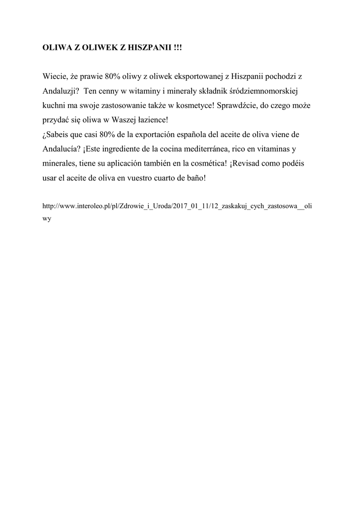 OLIWA Z OLIWEK Z HISZPANII !!! Wiecie, że prawie 80% oliwy z oliwek eksportowanej z Hiszpanii pochodzi z Andaluzji? Ten cenny w witaminy i minerały składnik śródziemnomorskiej kuchni ma swoje zastosowanie także w kosmetyce! Sprawdźcie, do czego może przydać się oliwa w Waszej łazience! ¿Sabeis que casi 80% de la exportación española del aceite de oliva viene de Andalucía? ¡Este ingrediente de la cocina mediterránea, rico en vitaminas y minerales, tiene su aplicación también en la cosmética! ¡Revisad como podéis usar el aceite de oliva en vuestro cuarto de baño! http://www.interoleo.pl/pl/Zdrowie_i_Uroda/2017_01_11/12_zaskakuj_cych_zastosowa__oli wy