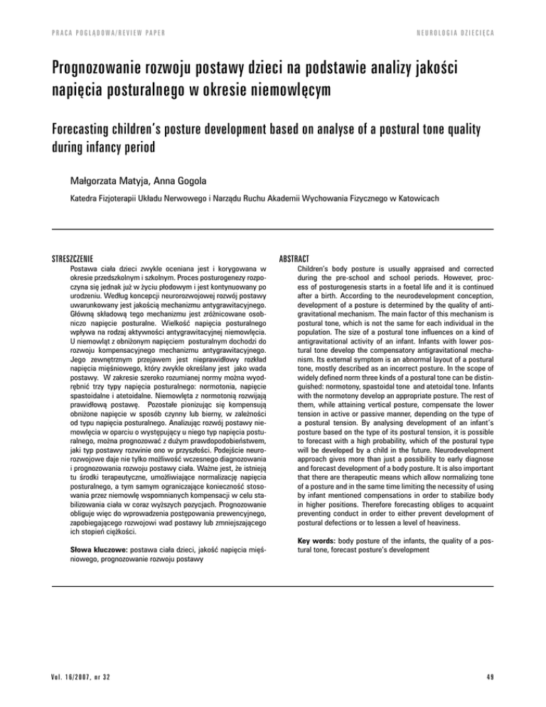 p raca p ogl ą dowa / review p a p er N E U rologia dziecięca Prognozowanie rozwoju postawy dzieci na podstawie analizy jakości napięcia posturalnego w okresie niemowlęcym Forecasting children’s posture development based on analyse of a postural tone quality during infancy period Małgorzata Matyja, Anna Gogola Katedra Fizjoterapii Układu Nerwowego i Narządu Ruchu Akademii Wychowania Fizycznego w Katowicach Streszczenie Postawa ciała dzieci zwykle oceniana jest i korygowana w okresie przedszkolnym i szkolnym. Proces posturogenezy rozpoczyna się jednak już w życiu płodowym i jest kontynuowany po urodzeniu. Według koncepcji neurorozwojowej rozwój postawy uwarunkowany jest jakością mechanizmu antygrawitacyjnego. Główną składową tego mechanizmu jest zróżnicowane osobniczo napięcie posturalne. Wielkość napięcia posturalnego wpływa na rodzaj aktywności antygrawitacyjnej niemowlęcia. U niemowląt z obniżonym napięciem posturalnym dochodzi do rozwoju kompensacyjnego mechanizmu antygrawitacyjnego. Jego zewnętrznym przejawem jest nieprawidłowy rozkład napięcia mięśniowego, który zwykle określany jest jako wada postawy. W zakresie szeroko rozumianej normy można wyodrębnić trzy typy napięcia posturalnego: normotonia, napięcie spastoidalne i atetoidalne. Niemowlęta z normotonią rozwijają prawidłową postawę. Pozostałe pionizując się kompensują obniżone napięcie w sposób czynny lub bierny, w zależności od typu napięcia posturalnego. Analizując rozwój postawy niemowlęcia w oparciu o występujący u niego typ napięcia posturalnego, można prognozować z dużym prawdopodobieństwem, jaki typ postawy rozwinie ono w przyszłości. Podejście neurorozwojowe daje nie tylko możliwość wczesnego diagnozowania i prognozowania rozwoju postawy ciała. Ważne jest, że istnieją tu środki terapeutyczne, umożliwiające normalizację napięcia posturalnego, a tym samym ograniczające konieczność stosowania przez niemowlę wspomnianych kompensacji w celu stabilizowania ciała w coraz wyższych pozycjach. Prognozowanie obliguje więc do wprowadzenia postępowania prewencyjnego, zapobiegającego rozwojowi wad postawy lub zmniejszającego ich stopień ciężkości. Słowa kluczowe: postawa ciała dzieci, jakość napięcia mięśniowego, prognozowanie rozwoju postawy Vol . 1 6 /20 0 7 , n r 32 abstract Children’s body posture is usually appraised and corrected during the pre-school and school periods. However, process of posturogenesis starts in a foetal life and it is continued after a birth. According to the neurodevelopment conception, development of a posture is determined by the quality of antigravitational mechanism. The main factor of this mechanism is postural tone, which is not the same for each individual in the population. The size of a postural tone influences on a kind of antigravitational activity of an infant. Infants with lower postural tone develop the compensatory antigravitational mechanism. Its external symptom is an abnormal layout of a postural tone, mostly described as an incorrect posture. In the scope of widely defined norm three kinds of a postural tone can be distinguished: normotony, spastoidal tone and atetoidal tone. Infants with the normotony develop an appropriate posture. The rest of them, while attaining vertical posture, compensate the lower tension in active or passive manner, depending on the type of a postural tension. By analysing development of an infant’s posture based on the type of its postural tension, it is possible to forecast with a high probability, which of the postural type will be developed by a child in the future. Neurodevelopment approach gives more than just a possibility to early diagnose and forecast development of a body posture. It is also important that there are therapeutic means which allow normalizing tone of a posture and in the same time limiting the necessity of using by infant mentioned compensations in order to stabilize body in higher positions. Therefore forecasting obliges to acquaint preventing conduct in order to either prevent development of postural defections or to lessen a level of heaviness. Key words: body posture of the infants, the quality of a postural tone, forecast posture’s development 49 p raca p ogl ą dowa / review p a p er M. Matyja, A. Gogola Postawa ciała zwykle jest oceniana i korygowana dopiero w okresie przedszkolnym i szkolnym. Część autorów reprezentujących koncepcję neurorozwojową podkreśla istnienie ścisłego związku między wadami postawy stwierdzanymi w okresie przedszkolnym i szkolnym a zaburzeniami neurorozwojowymi w pierwszym roku życia [1–3]. Celem pracy jest uzasadnienie konieczności wprowadzenia oceny i korekcji postawy już w okresie niemowlęcym. Istnieje wiele definicji postawy ciała. Większość autorów podkreśla, że postawa jest to indywidualne ukształtowanie ciała i położenie poszczególnych odcinków tułowia oraz kończyn dolnych w pozycji stojącej [4–8]. Nie wszyscy autorzy, w swych definicjach podają, że postawa to głównie sposób trzymania się w pozycji stojącej, ale zwykle z prezentowanych rozważań wynika, iż oceniana jest właśnie w tej pozycji [9–11]. Sposób definiowania postawy ciała sprawia, że w okresie niemowlęcym, ze względu na brak możliwości samodzielnego przyjęcia przez niemowlę pozycji stojącej – nie posługujemy się określeniem ocena postawy ciała. Używane są tu określenia takie, jak ocena wzorców posturalnych i motorycznych [12, 13] czy wzorców ułożenia [14]. Występujące nieprawidłowości określane są jako zaburzenia ruchowe pochodzenia ośrodkowego [15], zaburzenia centralnej koordynacji nerwowej [1, 16] lub nieprawidłowe wzorce ułożenia [14] i nie sugerują jeszcze wad postawy. Nazewnictwo to jest właściwe, ale w szerszym rozumieniu przytoczone określenia dotyczą postawy ciała. Nawet w przypadku, gdy z obserwowanych zaburzeń rozwinie się 