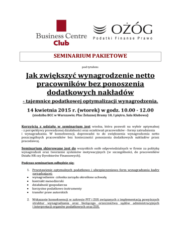 SEMINARIUM PAKIETOWE pod tytułem: Jak zwiększyć wynagrodzenie netto pracowników bez ponoszenia dodatkowych nakładów - tajemnice podatkowej optymalizacji wynagrodzenia. 14 kwietnia 2015 r. (wtorek) w godz. 10.00 - 12.00 (siedziba BCC w Warszawie; Plac Żelaznej Bramy 10, I piętro, Sala Klubowa) Korzyścią z udziału w seminarium jest wiedza, która pozwoli na wybór optymalnej - z perspektywy prowadzonej działalności oraz oczekiwań pracowników - formy zatrudnienia i wynagradzania. W konsekwencji, doprowadzi to do zwiększenia wynagrodzenia netto poszczególnych pracowników bez konieczności ponoszenia dodatkowych nakładów przez pracodawcę. Seminarium skierowane jest do wszystkich osób odpowiedzialnych w firmie za politykę wynagrodzeń oraz tworzenie systemów motywacyjnych (w szczególności, do pracowników Działu HR czy Dyrektorów Finansowych). Podczas seminarium odbędzie się: 1. Przestawienie optymalnych podatkowo i ubezpieczeniowo form wynagradzania kadry zarządzającej: wynagrodzenie członka zarządu określone uchwałą kontrakt menedżerski działalność gospodarcza korzystne podatkowo instrumenty transfer praw autorskich 2. Wskazanie konsekwencji w zakresie PIT i ZUS związanych z implementacją powyższych struktur wynagradzania oraz bieżącego orzecznictwa sądów administracyjnych i interpretacji organów podatkowych oraz ZUS. Seminarium poprowadzi: Joanna Stolarek Doradca podatkowy z 10-letnim doświadczeniem. Jest członkiem Zespołu Podatku PIT. Doświadczenie zawodowe zdobywała m.in. w firmie z tzw. „Wielkiej Czwórki”. Specjalizuje się w obszarze podatku PIT oraz w zakresie ubezpieczeń społecznych. Prowadziła liczne projekty doradcze na rzecz podmiotów działających w różnych sektorach gospodarki, w szczególności z branży produkcyjnej z branży finansowej (banki, firmy leasingowe, ubezpieczyciele), motoryzacyjnej, farmaceutycznej, obrotu nieruchomościami i innych. Jej doświadczenie zawodowe obejmuje m.in. udział w kilkudziesięciu przeglądach podatkowych dla klientów krajowych i międzynarodowych, doradztwo związane z oddelegowaniami pracowników do pracy w Polsce jak i za granicą, pomoc w zakresie optymalizacji wynagrodzeń wyższej kadry menedżerskiej (w tym planów motywacyjnych opartych na akcjach/udziałach, opcjach czy akcjach wirtualnych) oraz wdrażanie struktur wynagrodzeń opartych na transferze praw autorskich i praw własności przemysłowej. Jest autorką wielu artykułów w prasie fachowej oraz prelegentem na konferencjach i szkoleniach dotyczących PIT Dodatkowe informacje dotyczące seminarium: Podczas seminarium rozdane zostaną materiały dotyczące omawianego tematu. Uczestnicy otrzymają certyfikat uczestnictwa w seminarium BCC (certyfikat otrzymają osoby, które potwierdzą swój udział w seminarium). Przewidziano czas na zadanie pytań i dyskusję, a także indywidualne rozmowy z prelegentami. Seminarium pakietowe BCC organizowane jest tylko dla członków/firm BCC. W seminarium mogą wziąć udział osoby wydelegowane z firmy członkowskiej. Seminarium pakietowe BCC jest bezpłatne - organizowane jest w ramach pakietu usług i nie wiąże się z żadnymi dodatkowymi kosztami. Prosimy o przesyłanie potwierdzeń pod adresem: [email protected] Business Centre Club istnieje od 1991 roku. Jest największą w kraju organizacją indywidualnych pracodawców. Zrzesza blisko 2000 przedsiębiorców zatrudniających 600 tysięcy pracowników. Wśród członków BCC znajdują się największe międzynarodowe korporacje, instytucje finansowe, ubezpieczeniowe, firmy telekomunikacyjne, najwięksi polscy producenci, uczelnie wyższe, koncerny wydawnicze itd. Członkami Klubu są także prawnicy, dziennikarze, naukowcy, wydawcy, lekarze, wojskowi i studenci. BCC koncentruje się na działaniach lobbingowych, których celem jest rozwój polskiej gospodarki, zwiększenie liczby miejsc pracy i pomoc przedsiębiorcom. Członkowie BCC reprezentują 249 miast. Koordynatorem wszystkich działań BCC jest prezes Marek Goliszewski. Więcej: www.bcc.org.pl, Kontakty dla prasy: http://www.bcc.org.pl/kontakty_prasowe_bcc.php Kancelaria Ożóg i Wspólnicy jest podmiotem działającym na rynku usług doradztwa podatkowego od 2003 roku. Jesteśmy kancelarią, która regularnie zajmuje czołowe pozycje w rankingach Firm Doradztwa Podatkowego w Polsce. Profesjonalizm, partnerstwo, zaangażowanie oraz innowacyjność są głównymi wartościami, którymi kieruje się w codziennej współpracy z klientami. Wieloletnia praktyka, kompetencja, zorientowanie na potrzeby klienta oraz międzynarodowe doświadczenie pozwalają na dostarczanie produktów i rozwiązań najwyższej jakości, mających faktyczne zastosowanie u naszych klientów. Kancelaria świadczy usługi w zakresie: podatków bezpośrednich i pośrednich – CIT, PIT, VAT, akcyza, optymalizacji podatkowej oraz międzynarodowego i krajowego planowania podatkowego, cen transferowych, kompleksowej reprezentacji podatników przed organami podatkowymi, celnymi i organami kontroli skarbowej Więcej: www.ozog.pl