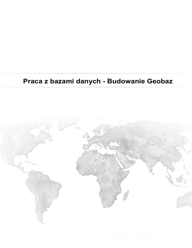 Praca z bazami danych - Budowanie Geobaz 1 Copyright © 2008-2012 Esri All rights reserved. Course version 2.1. Version release date July 2010. Wersja polska Esri Polska v.1. 02 2011 The information contained in this document is the exclusive property of Esri. This work is protected under United States copyright law and other international copyright treaties and conventions. No part of this work may be reproduced or transmitted in any form or by any means, electronic or mechanical, including photocopying and recording, or by any information storage or retrieval system, except as expressly permitted in writing by Esri. All requests should be sent to Attention: Contracts and Legal Services Manager, Esri, 380 New York Street, Redlands, CA 92373-8100 USA. EXPORT NOTICE: Use of these Materials is subject to U.S. export control laws and regulations including the U.S. Department of Commerce Export Administration Regulations (EAR). Diversion of these Materials contrary to U.S. law is prohibited. The information contained in this document is subject to change without notice. U. S. GOVERNMENT RESTRICTED/LIMITED RIGHTS Any software, documentation, and/or data delivered hereunder is subject to the terms of the License Agreement. The commercial license rights in the License Agreement strictly govern Licensee's use, reproduction, or disclosure of the software, data, and documentation. In no event shall the U.S. Government acquire greater than RESTRICTED/LIMITED RIGHTS. At a minimum, use, duplication, or disclosure by the U.S. Government is subject to restrictions as set forth in FAR §52.227-14 Alternates I, II, and III (DEC 2007); FAR §52.227-19(b) (DEC 2007) and/or FAR §12.211/12.212 (Commercial Technical Data/Computer Software); and DFARS §252.227-7015 (NOV 1995) (Technical Data) and/or DFARS §227.7202 (Computer Software), as applicable. Contractor/Manufacturer is Esri, 380 New York Street, Redlands, CA 92373-8100, USA. @esri.com, 3D Analyst, ACORN, Address Coder, ADF, AML, ArcAtlas, ArcCAD, ArcCatalog, ArcCOGO, ArcData, ArcDoc, ArcEdit, ArcEditor, ArcEurope, ArcExplorer, ArcExpress, ArcGIS, ArcGlobe, ArcGrid, ArcIMS, ARC/INFO, ArcInfo, ArcInfo Librarian, ArcLessons, ArcLocation, ArcLogistics, ArcMap, ArcNetwork, ArcNews, ArcObjects, ArcOpen, ArcPad, ArcPlot, ArcPress, ArcReader, ArcScan, ArcScene, ArcSchool, ArcScripts, ArcSDE, ArcSdl, ArcSketch, ArcStorm, ArcSurvey, ArcTIN, ArcToolbox, ArcTools, ArcUSA, ArcUser, ArcView, ArcVoyager, ArcWatch, ArcWeb, ArcWorld, ArcXML, Atlas GIS, AtlasWare, Avenue, BAO, Business Analyst, Business Analyst Online, BusinessMAP, CommunityInfo, Database Integrator, DBI Kit, EDN, Esri, Esri—Team GIS, Esri—The GIS Company, Esri—The GIS People, Esri—The GIS Software Leader, FormEdit, GeoCollector, Geographic Design System, Geography Matters, Geography Network, GIS by Esri, GIS Day, GIS for Everyone, GISData Server, JTX, MapIt, Maplex, MapObjects, MapStudio, ModelBuilder, MOLE, MPS—Atlas, PLTS, Rent-a-Tech, SDE, SML, Sourcebook·America, Spatial Database Engine, StreetMap, Tapestry, the ARC/INFO logo, the ArcGIS logo, the ArcGIS Explorer logo, the ArcPad logo, the Esri globe logo, the Esri Press logo, the GIS Day logo, the MapIt logo, The Geographic Advantage, The Geographic Approach, The World's Leading Desktop GIS, Water Writes, www.esri.com, www.geographynetwork.com, www.gis.com, www.gisday.com, and Your Personal Geographic Information System are trademarks, registered trademarks, or service marks of Esri in the United States, the European Community, or certain other jurisdictions. Other companies and products mentioned herein may be trademarks or registered trademarks of their respective trademark owners. Spis treści 1 CO TO JEST GEOBAZA ................................................................................................................................... 3 Kluczowe pojęcia ............................................................................................................................................................ 4 Najważniejsze powody stosowania geobaz ................................................................................................................... 5 Elementy geobazy .......................................................................................................................................................... 6 ĆWICZENIE 1: PRACA Z ELEMENTAMI GEOBAZY .................................................................................................................. 8 Etap 1: Eksploracja struktury geobazy .....................................................................................................................................8 Etap 2: Zapoznanie z elementami geobazy ............................................................................................................................11 Etap 3: Eksploracja klas obiektów w aplikacji ArcMap ..........................................................................................................14 Etap 4: Eksploracja topologii .................................................................................................................................................18 Etap 5: Eksploracja sieci geometrycznej ................................................................................................................................20 PODSUMOWANIE.......................................................................................................................................................23 Odpowiedzi do pytań z lekcji 1 ...............................................................................................................................................24 2 TYPY GEOBAZ ..............................................................................................................................................27 Kluczowe pojęcia ......................................................................................