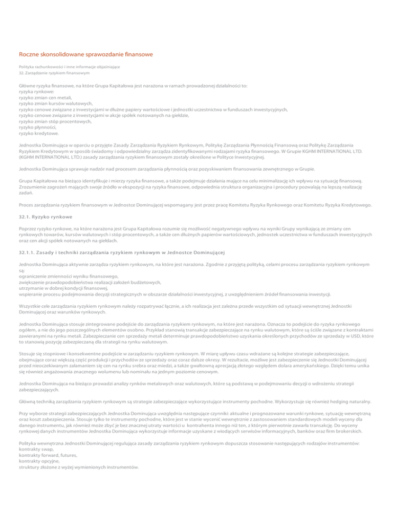 Roczne skonsolidowane sprawozdanie finansowe Polityka rachunkowości i inne informacje objaśniające 32. Zarządzanie ryzykiem finansowym Główne ryzyka finansowe, na które Grupa Kapitałowa jest narażona w ramach prowadzonej działalności to: ryzyka rynkowe: ryzyko zmian cen metali, ryzyko zmian kursów walutowych, ryzyko cenowe związane z inwestycjami w dłużne papiery wartościowe i jednostki uczestnictwa w funduszach inwestycyjnych, ryzyko cenowe związane z inwestycjami w akcje spółek notowanych na giełdzie, ryzyko zmian stóp procentowych, ryzyko płynności, ryzyko kredytowe. Jednostka Dominująca w oparciu o przyjęte Zasady Zarządzania Ryzykiem Rynkowym, Politykę Zarządzania Płynnością Finansową oraz Politykę Zarządzania Ryzykiem Kredytowym w sposób świadomy i odpowiedzialny zarządza zidentyfikowanymi rodzajami ryzyka finansowego. W Grupie KGHM INTERNATIONAL LTD. (KGHM INTERNATIONAL LTD.) zasady zarządzania ryzykiem finansowym zostały określone w Polityce Inwestycyjnej. Jednostka Dominująca sprawuje nadzór nad procesem zarządzania płynnością oraz pozyskiwaniem finansowania zewnętrznego w Grupie. Grupa Kapitałowa na bieżąco identyfikuje i mierzy ryzyka finansowe, a także podejmuje działania mające na celu minimalizację ich wpływu na sytuację finansową. Zrozumienie zagrożeń mających swoje źródło w ekspozycji na ryzyka finansowe, odpowiednia struktura organizacyjna i procedury pozwalają na lepszą realizację zadań. Proces zarządzania ryzykiem finansowym w Jednostce Dominującej wspomagany jest przez pracę Komitetu Ryzyka Rynkowego oraz Komitetu Ryzyka Kredytowego. 32.1. R y zy k o r y nk owe Poprzez ryzyko rynkowe, na które narażona jest Grupa Kapitałowa rozumie się możliwość negatywnego wpływu na wyniki Grupy wynikającą ze zmiany cen rynkowych towarów, kursów walutowych i stóp procentowych, a także cen dłużnych papierów wartościowych, jednostek uczestnictwa w funduszach inwestycyjnych oraz cen akcji spółek notowanych na giełdach. 32.1.1. Zas ady i t echnik i zar ządzania r y zy k iem r y nk owy m w Jednos t ce Dominuj ącej Jednostka Dominująca aktywnie zarządza ryzykiem rynkowym, na które jest narażona. Zgodnie z przyjętą polityką, celami procesu zarządzania ryzykiem rynkowym są: ograniczenie zmienności wyniku finansowego, zwiększenie prawdopodobieństwa realizacji założeń budżetowych, utrzymanie w dobrej kondycji finansowej, wspieranie procesu podejmowania decyzji strategicznych w obszarze działalności inwestycyjnej, z uwzględnieniem źródeł finansowania inwestycji. Wszystkie cele zarządzania ryzykiem rynkowym należy rozpatrywać łącznie, a ich realizacja jest zależna przede wszystkim od sytuacji wewnętrznej Jednostki Dominującej oraz warunków rynkowych. Jednostka Dominująca stosuje zintegrowane podejście do zarządzania ryzykiem rynkowym, na które jest narażona. Oznacza to podejście do ryzyka rynkowego ogółem, a nie do jego poszczególnych elementów osobno. Przykład stanowią transakcje zabezpieczające na rynku walutowym, które są ściśle związane z kontraktami zawieranymi na rynku metali. Zabezpieczanie cen sprzedaży metali determinuje prawdopodobieństwo uzyskania określonych przychodów ze sprzedaży w USD, które to stanowią pozycję zabezpieczaną dla strategii na rynku walutowym. Stosuje się stopniowe i konsekwentne podejście w zarządzaniu ryzykiem rynkowym. W miarę upływu czasu wdrażane są kolejne strategie zabezpieczające, obejmujące coraz większą część produkcji i przychodów ze sprzedaży oraz coraz dalsze okresy. W rezultacie, możliwe jest zabezpieczenie się Jednostki Dominującej przed nieoczekiwanym załamaniem się cen na rynku srebra oraz miedzi, a także gwałtowną aprecjacją złotego względem dolara amerykańskiego. Dzięki temu unika się również angażowania znacznego wolumenu lub nominału na jednym poziomie cenowym. Jednostka Dominująca na bieżąco prowadzi analizy rynków metalowych oraz walutowych, które są podstawą w podejmowaniu decyzji o wdrożeniu strategii zabezpieczających. Główną techniką zarządzania ryzykiem rynkowym są strategie zabezpieczające wykorzystujące instrumenty pochodne. Wykorzystuje się również hedging naturalny. Przy wyborze strategii zabezpieczających Jednostka Dominująca uwzględnia następujące czynniki: aktualne i prognozowane warunki rynkowe, sytuację wewnętrzną oraz koszt zabezpieczenia. Stosuje tylko te instrumenty pochodne, które jest w stanie wycenić wewnętrznie z zastosowaniem standardowych modeli wyceny dla danego instrumentu, jak również może zbyć je bez znacznej utraty wartości u kontrahenta innego niż ten, z którym pierwotnie zawarła transakcję. Do wyceny rynkowej danych instrumentów Jednostka Dominująca wykorzystuje informacje uzyskane z wiodących serwisów informacyjnych, banków oraz firm brokerskich. Polityka wewnętrzna Jednostki Dominującej regulująca zasady zarządzania ryzykiem rynkowym dopuszcza stosowanie następujących rodzajów instrumentów: kontrakty swap, kontrakty forward, futures, kontrakty opcyjne, struktury złożone z wyżej wymienionych instrumentów.