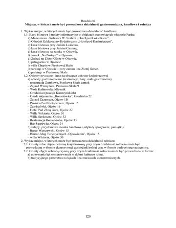 Rozdział 6 Miejsca, w których może być prowadzona działalność gastronomiczna, handlowa i rolnicza 1. Wykaz miejsc, w których może być prowadzona działalność handlowa: 1.1. Kasy biletowe i punkty informacyjne w obiektach stanowiących własność Parku: a) Muzeum im. Profesora W. Szafera „Hotel pod Łokietkiem”, b) Ośrodek Edukacyjno-Dydaktyczny „Hotel pod Kazimierzem”, c) kasa biletowa przy Jaskini Łokietka, d) kasa biletowa przy Jaskini Ciemnej, e) kasa biletowa na zamku w Ojcowie, f) domek „Na Postoju” w Ojcowie, g) Zajazd na Złotej Górze w Ojcowie, h) pstrągarnia w Ojcowie i) willa Chopin w Pieskowej Skale j) parkingi w Ojcowie – przy zamku i na Złotej Górze, k) parkingi w Pieskowej Skale 1.2. Obiekty prywatne i inne na obszarze ochrony krajobrazowej a) obiekty gastronomiczne (restauracje, bary, mała gastronomia), – restauracja Zamkowa, Pieskowa Skała zamek – Zajazd Wernyhora, Pieskowa Skała 9 – Wola Kalinowska Młynnik – Grodzisko (posesja Katarzyńskich) – Osada młynarska „Boroniówka”, Grodzisko 22 – Zajazd Zazamcze, Ojcow 1B – Piwnica Pod Nietoperzem, Ojców 15 – Zawiszówki, Ojców 16 – Hotel Pod Złotą Górą, Ojców 22 – Willa Wiktoria, Ojców 30 – Willa Serdeczna, Ojców 32 – Restauracja Bocianówka, Ojców 33 – Bar Sąspówka, Ojców 34 b) sklepy, przydomowe stoiska handlowe (artykuły spożywcze, pamiątki). – Bazar Warszawski, Ojców 15 – Biuro Usług Turystycznych „Ojcowianin”, Ojców 15 – willa Wiktoria, Ojców 30 2. Wykaz miejsc, w których może być prowadzona działalność rolnicza: 2.1. Grunty rolne objęte ochroną krajobrazową, przy czym działalność rolnicza może być prowadzona w formie ekstensywnej gospodarki rolnej oraz w formie tradycyjnego pasterstwa; 2.2. Grunty objęte ochroną czynną, przy czym działalność rolnicza może być prowadzona w formie: a) utrzymania łąk ekstensywnych w dobrej kulturze rolnej, b) tradycyjnego pasterstwa na łąkach i na murawach kserotermicznych. 120