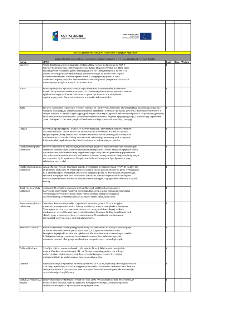 Publiczna Szkoła Podstawowa im. Jana Pawła II w Zarębach Kościelnych Nazwa Gąsienice Zajęcia dla dzieci ze specjalnymi trudnościami w czytaniu i pisaniu, w tym także zagrożonych ryzykiem dysleksji OPISY Pomoc dydaktyczna, która otrzymała certyfikat „Klasy Marzeń” pod patronatem MEN.4 kolorowe bambusowe specjalnie wyprofilowane łyżki o długości przynajmniej 21cm. Łyżki posiadają otwór oraz cienką gumkę ułatwiającą nałożenie i utrzymanie kulki na łyżce. 36 kulek w czterech podstawowych kolorach ponumerowanych od 1 do 9, oraz 4 wąskie materiałowe woreczki zakończone pierścieniem a z drugiej strony gumką. Całość zapakowana w poręcznej tubie. Produkt do ćwiczeń nauki pisania, przeprowadzenia zadań matematycznych zajęć ruchowych i utrwalenia liczb. Ilość 1 Wieże Pomoc dydaktyczna wykonana w dużej części z bambusa. Zawiera cienkie, bambusowe listewki służące do utworzenia planszy oraz 25 bambusowych wież różnej wielkości, kolorze z wgłębieniem na górze. Gra ćwiczy i usprawnia pracę rąk, koncentrację, cierpliwość i współpracę w grupie. Zawartość umieszona w wysokiej kolorowej tubie. Rybki Zawartość umieszona w poręcznej wysokiej tubie (31cm) z uchwytem. Wykonana z twardej tektury z zamykaną pokrywką z 1 tworzywa sztucznego, co umożliwi dzieciom szybkie sprzątanie i utrzymanie porządku. Zawiera 27 bambusowych rybek w 3 różnych kolorach o 3 kształtach (okrągłym, podłużnym i trójkątnym),3 podwójne bambusowe pałeczki spięte dwoma gumkami, 3 kolorowe, bambusowe miseczki,3 bawełniane opaski do założenia na głowę z płynną regulacją, 2 kostki do gry z symbolem rybek i ilością od 1-3.Gra ćwiczy szybkość ruchu doskonali jej sprawność manualną i precyzję. Tangalo 2 drewniane pudełka (jasne i ciemne), w których mieści się 7 drewnianych klocków o różnym kształcie i wielkości: Zestaw zawiera 30 sztywnych kart z obrazkami. Każda karta posiada wycięty fragment, który dziecko musi wypełnić klockami z pudełka, według oznaczonej ilości przedstawionej na obrazku. Ćwiczy kierunkowość, orientacje przestrzenną, analizę i syntezę dobieranie właściwych elementów. Całość zamieszczona w kartonowym pudełku. 1 Schattenmemo płytki zadaniowe Zawartość minimum 90 drewnianych, kwadratowych płytek nie mniejszych niż 6 cm z kolorowymi obrazkami, namalowanymi trudnościeralnymi i nietoksycznymi farbami. Motywy na płytkach bliskie otoczeniu dzieci ze środowiska wiejskiego i miejskiego. Każdy obrazek powtórzony pięciokrotnie, jako: kolorowy obrazek dwukrotnie, bez koloru z konturem, czarny motyw na białym tle, biały motyw na czarnym tle. Płytki umożliwiają: klasyfikowanie obrazków wg cech, figur, łączenie w pary, układanie prostych zdań. 1 Schattenmemo plansza Duże, żółte, lakierowane, drewniane pudełko o wymiarach nie mniejszych niż wys. 9, dł. 40, gł.17 cm zadaniowa z 5 głębokimi szufladami. W przedniej części każdej z szuflad poręczna kolorowa gałka, wyznaczająca m.in. ułożenie ciągów rytmicznych. Do zestawu dołączono ponad 30 drewnianych, kwadratowych płytek nie mniejszych niż 6 cm z kolorowymi obrazkami, namalowanymi trudnościeralnymi i nietoksycznymi farbami. Budowanie zdań, tworzenie historyjek, segregowanie, układanie w oparciu o wzory. 1 Kreativmemo wkłady zadaniowe 1 Minimum 220 obrazków umieszczonych na 28 długich szablonach wykonanych z masywnego, elastycznego tworzywa sztucznego. Szablony posiadają numerację pozwalającą rozróżnić grupy obrazków o bardzo różnorodnej tematyce pojęć pozwalające na klasyfikowanie wg stopnia trudności. M.in. pojęcie kredki, klaun, czarne koła. 1 Kreativmemo planasza Drewniane, kwadratowe pudełko o wymiarach nie mniejszych niż 29 cm z okrągłymi zadaniowa otworami i przykrywkami do nich. Otwory umożliwiają umieszczanie płaskich elementów. Plansza pozwala na przeprowadzenie zadań z zakresu płynności wzrokowej, szukania podobieństw i szczegółów oraz zajęć o różnej tematyce. Minimum 12 długich szablonów po 4 z każdej grupy wykonanych z tworzywa sztucznego z 96 obrazkami z podstawowymi pojęciami jak warzywa, owoce nad, pod, stary młody… 1 Abecadło - 150 liter Abecadło drewniane składające się przynajmniej z 25 sześcianów. Na każdej ściance znajduje się literka. Abecadło zawierają znaki polskie jak: ó, ż, ć, ś powtórzone dwukrotnie, Samogłoski i spółgłoski rozróżnione są kolorami. Klocki umieszczone w drewnianym pudełku. A,E,I,O powtórzone przynajmniej siedmiokrotnie co umożliwia układanie wyrazów i budowanie prostych zdań, przeprowadzanie ćw. ortograficznych i zabaw logicznych. 1 Tablica z literkami Podwójna tablica z zestawem literek i cyferek (min. 70 szt.). Składana nie zajmuje dużo miejsca. Wysokość nie mniejsza niż 110 cm. Z jednej strony do pisania kredą, z drugiej markerem i tzw. tablicą magnetyczną do przyczepiania magnetycznych liter. Między tablicami znajduje się miejsce do przechowywania akcesoriów. 1 Teatrzyk Kolorowy teatrzyk o wymiarach nie mniejszy niż 94 x 78 x 22 cm, wykonany z trwałego tworzywa sztucznego o podwójnych ściankach wypełniony w środku powietrzem, lekki umożliwia dzieciom łatwe przenoszenie. Z tyłu teatrzyku para ruchomych drzwiczek stanowi podpórkę konstrukcji a zarazem imitujące kasę biletową 1 Kurtyna, oświetlenie, 2 Zestaw akcesoriów do teatrzyku: oświetlenie typu LED z wyłącznikiem zasilane 3 bateriami AAA – pacynki niezałączone w zestawie, ruchoma czerwona dwuczęściowa kurtyna, 2 welurowe pacynki: chłopiec i dziewczynka o wysokości nie mniejszej niż 20 cm. 1 Cena Wartość PUZZELATOR mozaika pojedyncza PUZZELATOR mozaika podwójna PUZZELATOR - karty zadaniowe PUZZELATOR elementy do działań Tęczowe liny z zapięciem Pomoc dydaktyczna składająca się 12 gumowych ciemnych obustronnie antypoślizgowych, kwadratowych płytek o wymiarze boku nie mniejszym niż 25 c