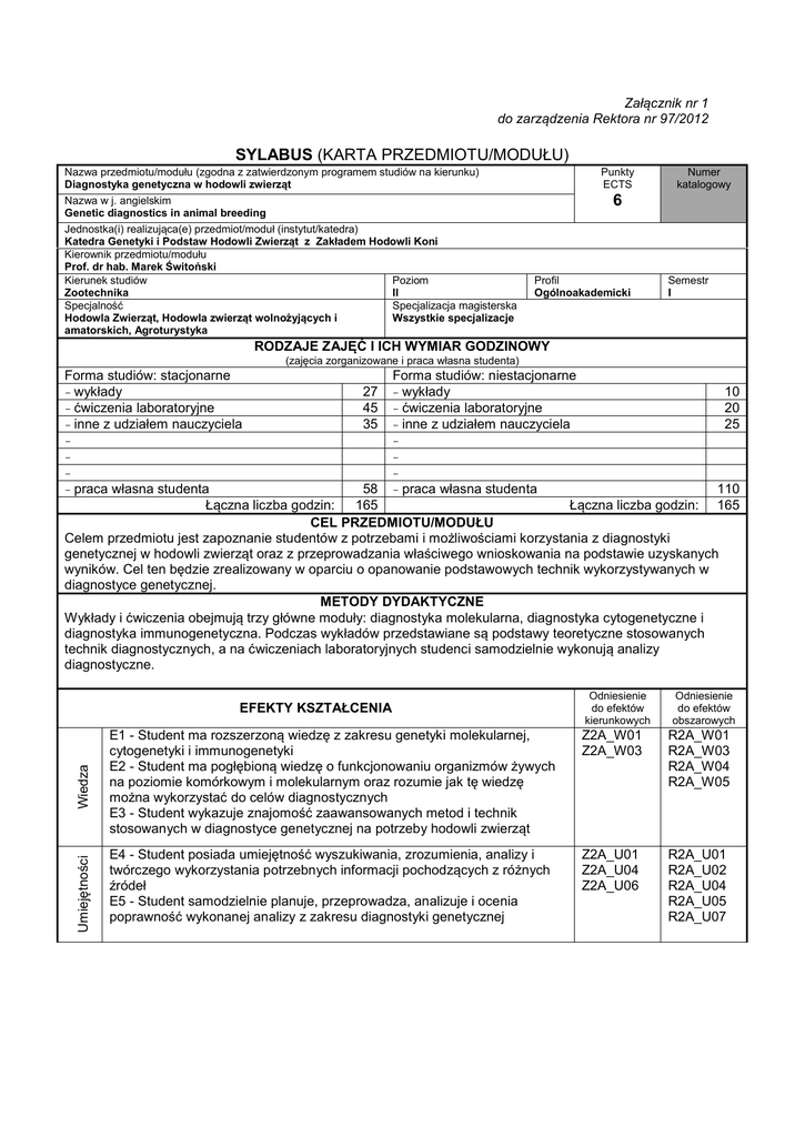 Załącznik nr 1 do zarządzenia Rektora nr 97/2012 SYLABUS (KARTA PRZEDMIOTU/MODUŁU) Nazwa przedmiotu/modułu (zgodna z zatwierdzonym programem studiów na kierunku) Diagnostyka genetyczna w hodowli zwierząt Punkty ECTS Numer katalogowy 6 Nazwa w j. angielskim Genetic diagnostics in animal breeding Jednostka(i) realizująca(e) przedmiot/moduł (instytut/katedra) Katedra Genetyki i Podstaw Hodowli Zwierząt z Zakładem Hodowli Koni Kierownik przedmiotu/modułu Prof. dr hab. Marek Świtoński Kierunek studiów Poziom Zootechnika II Specjalność Specjalizacja magisterska Hodowla Zwierząt, Hodowla zwierząt wolnożyjących i Wszystkie specjalizacje amatorskich, Agroturystyka Profil Ogólnoakademicki Semestr I RODZAJE ZAJĘĆ I ICH WYMIAR GODZINOWY (zajęcia zorganizowane i praca własna studenta) Forma studiów: stacjonarne wykłady ćwiczenia laboratoryjne inne z udziałem nauczyciela Forma studiów: niestacjonarne 27 45 35 praca wykłady ćwiczenia laboratoryjne inne z udziałem nauczyciela praca własna studenta 10 20 25 własna studenta 58 110 Łączna liczba godzin: 165 Łączna liczba godzin: 165 CEL PRZEDMIOTU/MODUŁU Celem przedmiotu jest zapoznanie studentów z potrzebami i możliwościami korzystania z diagnostyki genetycznej w hodowli zwierząt oraz z przeprowadzania właściwego wnioskowania na podstawie uzyskanych wyników. Cel ten będzie zrealizowany w oparciu o opanowanie podstawowych technik wykorzystywanych w diagnostyce genetycznej. METODY DYDAKTYCZNE Wykłady i ćwiczenia obejmują trzy główne moduły: diagnostyka molekularna, diagnostyka cytogenetyczne i diagnostyka immunogenetyczna. Podczas wykładów przedstawiane są podstawy teoretyczne stosowanych technik diagnostycznych, a na ćwiczeniach laboratoryjnych studenci samodzielnie wykonują analizy diagnostyczne. Umiejętności Wiedza EFEKTY KSZTAŁCENIA E1 - Student ma rozszerzoną wiedzę z zakresu genetyki molekularnej, cytogenetyki i immunogenetyki E2 - Student ma pogłębioną wiedzę o funkcjonowaniu organizmów żywych na poziomie komórkowym i molekularnym oraz rozumie jak tę wiedzę można wykorzystać do celów diagnostycznych E3 - Student wykazuje znajomość zaawansowanych metod i technik stosowanych w diagnostyce genetycznej na potrzeby hodowli zwierząt . E4 - Student posiada umiejętność wyszukiwania, zrozumienia, analizy i twórczego wykorzystania potrzebnych informacji pochodzących z różnych źródeł E5 - Student samodzielnie planuje, przeprowadza, analizuje i ocenia poprawność wykonanej analizy z zakresu diagnostyki genetycznej Odniesienie do efektów kierunkowych Odniesienie do efektów obszarowych Z2A_W01 Z2A_W03 R2A_W01 R2A_W03 R2A_W04 R2A_W05 Z2A_U01 Z2A_U04 Z2A_U06 R2A_U01 R2A_U02 R2A_U04 R2A_U05 R2A_U07 Kompetencje społeczne E6 - Student potrafi współdziałać i pracować w grupie, przyjmując w niej różne role, podczas przeprowadzania analiz diagnostycznych E7 - Student potrafi określić priorytety służące realizacji określonego przez siebie lub innych zadania o charakterze diagnostycznym E8 - Student posiada znajomość działań zmierzających do ograniczenia ryzyka i przewidywania skutków działalności związanych z wiarygodnością i czułością zastosowanych technik diagnostycznych Metody weryfikacji efektów kształcenia Z2A_K03 Z2A_K04 Z2A_K05 R2A_K02 R2A_K03 R2A_K04 Numery efektów E4, E5, E6 Sprawdziany pisemne na ćwiczeniach laboratoryjnych E6, E7, E8 Ocena indywidualnej pracy studenta na ćwiczeniach E1, E2, E3, E7, E8 Egzamin TREŚCI KSZTAŁCENIA Wykłady: Cele diagnostyki cytogenetycznej i molekularnej. Metody diagnostyczne stosowane w badaniach cytogenetycznych (m.in.: uzyskiwanie preparatów cytogenetycznych, barwienia prążkowe chromosomów, fluorescencyjna hybrydyzacja in situ). Charakterystyka zestawu chromosomowego podstawowych gatunków zwierząt (wzorce kariotypów, chromosomy płci). Diagnostyka aneuploidii i mutacji strukturalnych. Najczęściej diagnozowane nieprawidłowości chromosomowe u zwierząt domowych. Metody diagnostyczne stosowane w badanaich molekularnych (PCR, elektroforeza DNA, test RFLP, sekwencjonowanie). Wykrywanie mutacji genowych odpowiedzialnych za rozwój chorób dziedzicznych oraz wpływających na zmienność cech ilościowych. Wykorzystanie mikromacierzy SNP do oceny wartości hodowlanej i poszukiwania mutacji o dużym efekcie działania. Wstęp do immunogenetyki zwierząt. Naturalne i odpornościowe przeciwciała antyerytrocytarne u zwierząt (aglutynacyjne i hemolityczne). Niedokrwistość hemolityczna noworodków zwierząt. Główny kompleks zgodności tkankowej (MHC). Choroby immunologiczne o podłożu genetycznym. Problemy ksenotransplantacji. Nadwrażliwość, alergie i choroby autoimmunologiczne. Ćwiczenia: Zapoznanie się z zasadami obsługi mikroskopów biologicznych. Objaśnienie podstawowych metod służących do uzyskiwania preparatów chromosomowych. Poznanie technik służących do barwienia prążkowego chromosomów. Obserwacja mikroskopowa preparatów cytogenetycznych pochodzących od zwierząt obarczonych mutacjami chromosomowymi. Poznanie technik molekularnych takich jak: izolacja DNA, PCR, test RFFLP. Ustalenie pochodzenie zwierząt przy wykorzystaniu markerów mikrosatelitarnych. Przeciwciała naturalne i odpornościowe w surowicach koni. Absorpcje przeciwciał z surowic po immunizacjach i reimmunizacjach. Testy serologiczne grup krwi. Elektroforetyczne rozdziały białek surowicy krwi. Formy i kryteria zaliczenia przedmiotu/modułu Sprawdziany z ćwiczeń, trzy kolokwia testowe – ponad 50% ogólnej liczby punktów. Procentowy udział w końcowej ocenie 20% 80% Egzamin – test jednokrotnego wyboru – ponad 50% ogólnej liczby punktów. WYKAZ LITERATURY Literatura podstawowa 1. Słomski R. (2008). Analiza DNA – teoria i praktyka. Wydawnictwo Uniwersytetu Przyrodniczego w Poznaniu. 2. Świtoński M., Słota E., Jaszczak K. (2006). Diagnostyka cytogenetyczna zwierząt domowych. Wydawnictwo Akade