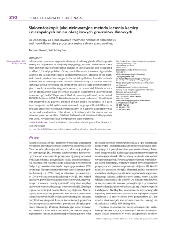 370 PRACE ORYGINALNE / ORIGINALS Sialoendoskopia jako nieinwazyjna metoda leczenia kamicy LbQLH]DSDOQ\FK]PLDQREU]ÚNRZ\FKJUXF]RïöZĂOLQRZ\FK 6LDOHQGRVFRS\DVDbQRQLQYDVLYHWUHDWPHQWPHWKRGRIVLDOROLWKLDVLV DQGQRQLQĠDPPDWRU\SURFHVVHVFDXVLQJVDOLYDU\JODQGVZHOOLQJ 7RPDV].RSHü:LWROG6]\IWHU 2WRODU\QJRO3RO SUMMARY ,QĠDPPDWRU\DQGQRQQHRSODVWLFGLVHDVHVRIVDOLYDU\JODQGVDIIHFWDSSUR[LPDWHO\RISDWLHQWVLQHYHU\GD\ODU\QJRORJ\SUDFWLFH6LDOROLWKLDVLVLVWKH PRVWFRPPRQFDXVHRIREVWUXFWLYHGLVHDVHVLQVDOLYDU\JODQGVDQGLVVXSSRVHG WRDIIHFWRISRSXODWLRQ2WKHUQRQLQĠDPPDWRU\UHDVRQVRIJODQGXODU VZHOOLQJDUHVLDORGRFKLWLVDFXWHGXFWDOLQĠDPPDWLRQVWHQRVLVRIWKHGXFW DQGFKURQLFREVWUXFWLYHFKDQJHVLQWKHGXFWDOHSLWKHOLXPIRXQGLQSDWLHQWV ZLWKFKURQLFUHFXUUHQWMXYHQLOHSDURWLWLV6LDOHQGRVFRS\LVDPLQLPDOLQYDVLYH WHFKQLTXHDLPLQJWRYLVXDOL]HWKHOXPHQRIWKHVDOLYDU\GXFWVDQGWKHLUSDWKRORJLHV,WFRXOGEHXVHGIRUGLDJQRVWLFUHDVRQVLQFDVHRIVLDOROLWKLDVLVH[WUDFWLRQRIVWRQHVDQGLQFDVHRIVWHQRVLVGLODWDWLRQLVSHUIRUPHGLQWHUYHQWLRQDO VLDOHQGRVFRS\,Q(17'HSDUWPHQW0HGLFDO8QLYHUVLW\LQ3R]QDñLQWKHSHULRG ;,,EHWZHHQ,9VLDOHQGRVFRSLHVZHUHSHUIRUPHG6LDOROLWKLDVLV ZDVREVHUYHGLQSDWLHQWVVWHQRVLVRIPDLQGXFWLQSDWLHQWV,QFDVH DQ\FKDQJHVLQGXFWDOV\VWHPZHUHREVHUYHG,QJURXSZLWKVLDOROLWKLDVLVLQ FDVHVVWRQHVZHUHUHPRYHGHQGRVFRSLFDOO\LQSDWLHQWVSDSLOORWRP\ZDV SHUIRUPHGWRH[WUDFWLRQRIWKHVWRQH,QSDWLHQWVZLWKELJVWRQHVDQGDQ H[WUHPHSRVWHULRUORFDWLRQELODWHUDOH[WHUQDODQGHQGRVFRSLFDODSSURDFK ZDVXVHG$Q\SRVWRSHUDWLYHFRPSOLFDWLRQVZHUHREVHUYHG ŅE\3ROVNLH7RZDU]\VWZR2WRU\QRODU\QJRORJöZ ļ&KLUXUJöZ*ïRZ\L6]\L 2WU]\PDQR/Received: =DDNFHSWRZDQRGRGUXNX/Accepted: .OLQLND2WRODU\QJRORJLLL2QNRORJLL /DU\QJRORJLF]QHM80 LP.DUROD0DUFLQNRZVNLHJRZ3R]QDQLX .LHURZQLNSURIGUKDEPHG:6]\IWHU :NïDGSUDF\DXWRUöZ$XWKRUVFRQWULEXWLRQ ZJNROHMQRĂFL .RQIOLNWLQWHUHVX&RQIOLFWVRILQWHUHVW $XWRU]\SUDF\QLH]JïDV]DMÈNRQIOLNWXLQWHUHVöZ $GUHVGRNRUHVSRQGHQFML/ $GGUHVVIRUFRUUHVSRQGHQFH LPLÚLQD]ZLVNR7RPDV].RSHÊ DGUHVSRF]WRZ\ .OLQLND2WRODU\QJRORJLL80Z3R]QDQLX XO3U]\E\V]HZVNLHJR 3R]QDñ WHO ID[ +DVïD LQGHNVRZH NDPLFD ĂOLQLDQHN QLH]DSDOQH REU]ÚNL JUXF]RïöZ ĂOLQRZ\FK sialoendoskopia .H\ZRUGVVLDOROLWKLDVLVQRQLQĠDPPDWRU\VZHOOLQJRIVDOLYDU\JODQGVVLDOHQGRVFRS\ :VWÚS Pacjenci z zapalnymi i nienowotworowymi zmianami w obrębie dużych gruczołów ślinowych stanowią około 5% chorych zgłaszających się w codziennej praktyce do laryngologa [8]. Pomimo zastosowania nowoczesnych metod obrazowania, przyczyna tej grupy schorzeń w dużym odsetku przypadków nadal pozostaje niejasna. Kamica jest najczęstszym zapalnym schorzeniem dużych gruczołów ślinowych i występuje u około 1,2% populacji. Najczęściej manifestuje się w śliniance podżuchwowej – w 87%, dalej w śliniance przyusznej – w 10% i w śliniance podjęzykowej w 3% [6, 16]. Wśród przyczyn powiększenia gruczołów ślinowych, niezwiązanych z kamicą, należy wymienić ostry stan zapalny przewodu wyprowadzającego (sialodochitis) [6]. Etiologia tego schorzenia jest do chwili obecnej niejasna. Nawracający stan zapalny przewodu wiąże się z powstawaniem śluzowych bądź włóknikowych strątów (mucous and fibrinoid plaques), które w konsekwencji prowadzą do zaczopowania przewodu i powstania obrzęku gruczołu ślinowego. Zmiany obstrukcyjne obserwowane są również u chorych z przewlekłym nawracającym zapaleniem ślinianki przyusznej występującym u ludzi młodych (iuvenile chronic parotitis), jak i po jodoterapii, radioterapii i schorzeniach autoimmunologicznych przebiegających z powiększeniem gruczołów ślinowych (zespół Sjoegrena) [9]. Kolejną grupą zmian powodujących nawracające obrzęki ślinianek są zwężenia przewodów wyprowadzających. Powstają w następstwie przewlekłego stanu zapalnego, jednak w ponad 50% przypadków przyczyna ich powstania pozostaje niejasna [6]. Wśród rzadkich przyczyn obrzęku ślinianek należy wymienić ciała obce dostające się do światła przewodu wyprowadzającego takie jak źdźbła trawy i siana, włosy, a także włókna szczoteczki do zębów. Do badań obrazowych w rozpoznawaniu zmian patologicznych przewodów ślinowych najczęściej wykorzystuje się ultrasonografię i sialografię. Według Iro, zastosowanie ultrasonografii wysokiej rozdzielczości pozwala na wykrycie złogów wielkości 1–2 mm w około 90% przypadków [3]. Do rzadko stosowanych metod obrazowania z uwagi na duże koszty należy MR sialografia. Pomimo zastosowania metod obrazowania, ustalenie przyczyn wyżej wymienionych zmian patologicznych nadal pozostaje w wielu przypadkach trudne. 2 WROD U \QJRORJLD3ROVNDWRP QU OLV WRSDGJU XG]LHñ PRACE ORYGINALNE / ORIGINALS Tę lukę diagnostyczną uzupełnia sialoendoskopia. Sialonedoskopia jest minimalnie inwazyjną techniką umożliwiająca uwidocznienie przewodów wyprowadzających ślinianki przyusznej i podżuchwowej. Może pełnić rolę diagnostyczną i w tym względzie stanowi alternatywę dla klasycznych badań radiologicznych obrazujących przewody wyprowadzające, jak np. sialografia. Jako metoda lecznicza, z kolei, jest stosowana z powodzeniem w leczeniu kamicy i zwężeń przewodów wyprowadzających. W tym wypadku w sposób istotny ogranicza wskazania do klasycznych zabiegów chirurgicznych stosowanych w kamicy ślinianek, jak usunięcie ślinianki podżuchwowej i przyusznej [1–3, 5, 6, 9, 14]. Po raz pierwszy giętkie endoskopy w diagnostyce schorzeń ślinianek zostały zastosowane w 1990 r. przez Koenigsbergera [7] i następnie przez Katza w 1991 r. [4]. Te endoskopy nie powodowały urazu ścian przewodu z uwagi na małe rozmiary, jednak zdolność rozdzielcza obrazu była niewystarczająca z powodu złej jakości optyki i braku kanału irygacyjnego w wielu typach sialoendoskopów. Sztywne endoskopy z kolei zapewniały lepszą jakość obrazu, ich zastosowanie wiązało się jednak z większym urazem ścian przewodu wyprowadzającego. W chwili obecnej powszechne zastosowanie znajdują endoskopy półsztywne (giętkie o wzmocnionej konstrukcji ścian umożliwiające nieznaczne wyginanie 