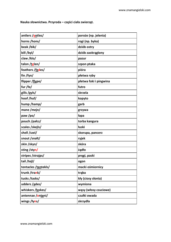 www.znamangielski.com Nauka słownictwa. Przyroda – części ciała zwierząt. antlers /entles/ poroże (np. jelenia) horns /hons/ rogi (np. byka) beak /bik/ dziób ostry bill /byl/ dziób zaokrąglony claw /klo/ pazur talon /telen/ szpon ptaka feathers /fedes/ pióra fin /fyn/ płetwa ryby flipper /flype/ płetwa foki i pingwina fur /fe/ futro gills /gyls/ skrzela hoof /huf/ kopyto hump /hamp/ garb mane /mejn/ grzywa paw /po/ łapa pouch /pałcz/ torba kangura scales /skejls/ łuski shell /szel/ skorupa, pancerz snout /snałt/ ryjek skin /skyn/ skóra sting /styn/ żądło stripes /strajps/ pręgi, paski tail /tejl/ ogon tentacles /tentekls/ macki ośmiornicy trunk /trank/ trąba tusks /tasks/ kły (ciosy słonia) udders /ades/ wymiona whiskers /łyskes/ wąsy (włosy czuciowe) antennae /enteni/ czułki owada wings /łyns/ skrzydła www.znamangielski.com