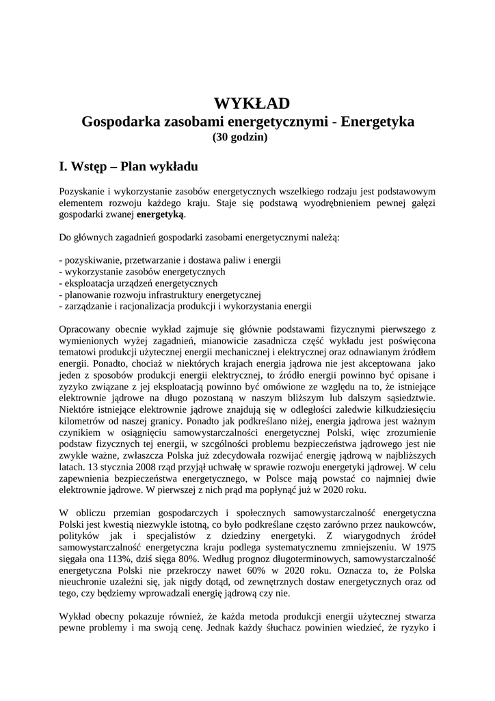 WYKŁAD Gospodarka zasobami energetycznymi - Energetyka (30 godzin) I. Wstęp – Plan wykładu Pozyskanie i wykorzystanie zasobów energetycznych wszelkiego rodzaju jest podstawowym elementem rozwoju każdego kraju. Staje się podstawą wyodrębnieniem pewnej gałęzi gospodarki zwanej energetyką. Do głównych zagadnień gospodarki zasobami energetycznymi należą: - pozyskiwanie, przetwarzanie i dostawa paliw i energii - wykorzystanie zasobów energetycznych - eksploatacja urządzeń energetycznych - planowanie rozwoju infrastruktury energetycznej - zarządzanie i racjonalizacja produkcji i wykorzystania energii Opracowany obecnie wykład zajmuje się głównie podstawami fizycznymi pierwszego z wymienionych wyżej zagadnień, mianowicie zasadnicza część wykładu jest poświęcona tematowi produkcji użytecznej energii mechanicznej i elektrycznej oraz odnawianym żródłem energii. Ponadto, chociaż w niektórych krajach energia jądrowa nie jest akceptowana jako jeden z sposobów produkcji energii elektrycznej, to źródło energii powinno być opisane i zyzyko związane z jej eksploatacją powinno być omówione ze względu na to, że istniejące elektrownie jądrowe na długo pozostaną w naszym bliższym lub dalszym sąsiedztwie. Niektóre istniejące elektrownie jądrowe znajdują się w odległości zaledwie kilkudziesięciu kilometrów od naszej granicy. Ponadto jak podkreślano niżej, energia jądrowa jest ważnym czynikiem w osiągnięciu samowystarczalności energetycznej Polski, więc zrozumienie podstaw fizycznych tej energii, w szcgólności problemu bezpieczeństwa jądrowego jest nie zwykle ważne, zwłaszcza Polska już zdecydowała rozwijać energię jądrową w najbliższych latach. 13 stycznia 2008 rząd przyjął uchwałę w sprawie rozwoju energetyki jądrowej. W celu zapewnienia bezpieczeństwa energetycznego, w Polsce mają powstać co najmniej dwie elektrownie jądrowe. W pierwszej z nich prąd ma popłynąć już w 2020 roku. W obliczu przemian gospodarczych i społecznych samowystarczalność energetyczna Polski jest kwestią niezwykle istotną, co było podkreślane często zarówno przez naukowców, polityków jak i specjalistów z dziedziny energetyki. Z wiarygodnych źródeł samowystarczalność energetyczna kraju podlega systematycznemu zmniejszeniu. W 1975 sięgała ona 113%, dziś sięga 80%. Według prognoz długoterminowych, samowystarczalność energetyczna Polski nie przekroczy nawet 60% w 2020 roku. Oznacza to, że Polska nieuchronie uzależni się, jak nigdy dotąd, od zewnętrznych dostaw energetycznych oraz od tego, czy będziemy wprowadzali energię jądrową czy nie. Wykład obecny pokazuje również, że każda metoda produkcji energii użytecznej stwarza pewne problemy i ma swoją cenę. Jednak każdy śłuchacz powinien wiedzieć, że ryzyko i strategia to nieodłączone cechy wyborów, jakich musi dokonywać społeczeństwo w każdej dziedzinie gospodarczej, nie tylko w dziedzinie energetyki. 10 listopada 2009 roku Rada Ministrów przyjęła przygotowany w Ministerstwie Gospodarki dokument Polityka energetyczna Polski do 2030 roku. Dokument zawiera długoterminową strategię rozwoju sektora energetycznego, prognozę zapotrzebowania na paliwa i energię oraz program działań wykonawczych do 2030 roku. Strategia odpowiada na najważniejsze wyzwania stojące przed polską energetyką w perspektywie krótko- i długoterminowej. Jednym z największych wyzwań, przed którymi stoi każdy kraj rozwijający gospodarczo, zwłaszcza w przypadku Polski, która stara się dostosować do normy rozwoju Unii Europejskiej, jest pogodzenie wzrostu gospodarczego z ochroną Środowiska. W lisropadzie ubiegłego roku Ministerstwo Gospodarki opracował kolejny ważny dokument pt. Strategia „Bezpieczeństwa Energetyczne i Środowisko” (BEiŚ). Każdego dnia gospodarka do sprawnego funkcjonowania potrzebuje ogromnych ilości energii, która w instalacjach energetycznych produkowana jest z paliw kopalnych, wody, słońca,a więc z zasobów środowiska. Wydobycie kopalin, korzystanie z wód, zanieczyszczenie powietrza, przeciwdziałanie zmianom klimatu i adaptacja do tych zmian są podstawowymi zagadnieniami tej strategii. BEiŚ jest pewnym pomostem pomiędzy Środowiskiem i Energetyką stanowiąc jednocześnie impuls do bardziej efektywnego i racjonalnego prowadzenia polityki w obu tych obszarach. Wyżej wymienione dokumenty będą omawiane skrótowo we wstępie do wykładu (1 godz.) Polska gospodarka należy do najbardziej energochłonnych w Europie. Obecnie w Polsce 95% energii pochodzi z węgla. Te zasoby energetyczne szacowane są na 29,5 mld ton węgla kamiennego oraz 11,6 mld ton węgla brunatnego. Jak widać, mimo iż największe w Europie, nie wystarczą na więcej niż 30 lat (biorąc pod uwagę obecne tempo rozwoju i energochłonność gospodarki). Elektrociepłownia wykorzystująca węgiel spowodowała i spowoduje zanieczyszczenie środowiska na ogromną skalę. Ogólnie mówiąc, środowisko zostanie zanieczyszczone gdy każde źródło energii zostaje zamienione na energię mechaniczną lub elektryczną. Ten problem będzie poruszony w dalszej części wykładu (3 godziny), gdzie jako przykład przedstawiono problem zanieczyszczenia atmosfery i zasotosowanie fizyki w postaci nowych urządzeń jak lidary w analizie tego zanieczyszczenia. Głównym żródłem energii nadal są paliwa kopalne. Aby dobrze zrozumieć podstawy procesów wykorzystania tego źródła energii, trzeba opanować dobrze termodynamikę, która opisuje zmianę ciepła na energię i na odwrót. Podstawowe zasady tej gałęzi fizyki i różne sposoby wymiany ciepła będą omówione w dalszej części wykładu (6 godzin). W dokumencie resort gospodarki stworzył również podstawy do przygotowania programu polskiej energetyki jądrowej. Wskazane zostały działania, jakie należy podjąć w najbliższych latach, aby możliwie szybko uruchomić w Polsce pierwsze instalac