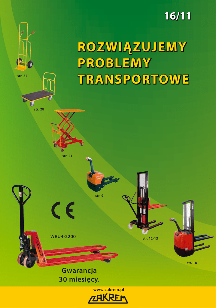 16/11 ROZWIĄZUJEMY PROBLEMY TRANSPORTOWE str. 37 str. 28 str. 21 str. 9 WRU4-2200 str. 12-13 str. 18 Gwarancja 30 miesięcy. www.zakrem.pl Szanowni Klienci SPIS TREŚCI: Przedstawiamy Państwu aktualny katalog naszych wyrobów oraz towarów firm z nami współpracujących. Jesteśmy producentem polskim, wyroby są wytwarzane w naszym zakładzie w Grajewie. Prowadzimy sprzedaż na terenie całego kraju, jak również bezpośrednio z naszego zakładu w Grajewie. Realizujemy zamówienia na wyroby nietypowe , według indywidualnych potrzeb. Świadczymy usługi w zakresie: prac ślusarskich, spawalniczych, malowania proszkowego oraz remontów wózków naszej produkcji. 1. WÓZKI DO PALET INFORMACJE HANDLOWE 2. URZĄDZENIA WARSZTATOWE Jesteśmy dostępni do Państwa dyspozycji od poniedziałku do piątku w godzinach: od 7.00 do 15.00 pod numerami: tel. 86 272 34 39 86 273 90 43 86 273 90 47 Na naszej stronie internetowej www.zakrem.pl znajdziecie Państwo informacje o naszej firmie i produkowanych przez nas wyrobach. Zapytania dotyczące wyrobów, a także ich zamawianie można bezpośrednio realizować na naszej stronie internetowej www.zakrem.pl Zamówienia można również składać poprzez: fax, e-mail, telefon, formularz - (str. 59) fax 86 272 48 39 e-mail: [email protected] DEKLARACJA ZGODNOŚCI Wyroby są wykonane zgodnie z wymogami: –– europejskiej Dyrektywy Maszynowej Nr 2006/42/WE oraz zgodnie z przepisami polskimi: –– Rozporządzenie Ministra Gospodarki z dn. 21 października 2008 r. w sprawie zasadniczych wymagań dla maszyn - Dz.U. nr 199 z 7 listopada 2008 r. poz. 1228 SERWIS Do zakupionych towarów zapewniamy 100% części zamiennych. Sieć serwisowa pozwala bardzo szybko reagować na Państwa potrzeby Wózki unoszące Wózki unoszące, do bel Wózki unoszące z wagą Wózki unoszące elektryczne Wózki podnośnikowe nożycowe Wózki podnośnikowe masztowe Wózki podnośnikowe masztowe z podnoszeniem elektrohydraulicznym Wózki podnośnikowe masztowe prowadzone Podesty przeładunkowe hydrauliczne Żurawiki warsztatowe Wózki podnośnikowe stołowe Wózki narzędziowe Wózki i szafki warsztatowe Stoły warsztatowe Zestawy transportowe 4-5 6 7-8 9 10 11-15 16-17 18 19 20 21 22 23 24 25-26 3. WÓZKI PLATFORMOWE Do uniwersalnych zastosowań Specjalne Półkowe Osiatkowane 27-28 28 29-30 31 4. WÓZKI KONTENEROWE 32-33 5. NADSTAWKI I PALETY 34 6. WÓZKI TACZKOWE Uniwersalne Składane Do butli gazowych Do beczek 35 36 37 38 7. WAGI Wagi podłogowe Waga hakowa 39-40 40 8. KOŁA I ZESTAWY KOŁOWE Do uniwersalnych zastosowań Przemysłowe Pneumatyczne Do wózków paletowych 41 41 41 42 9. ELEMENTY WYPOSAŻENIA WEWNĘTRZNEGO Pojemniki magazynowe Zestawy pojemników magazynowych na listwach naściennych Zestawy naścienne Regały pojemnikowe Szafy ubraniowe i bhp Szafy biurowe Szafy kartotekowe Szafy na mapy Kontenery biurowo-warsztatowe 43 43 44 44 46 47 47 48 48 10. ELEMENTY ZAGOSPODAROWANIA ZEWNĘTRZNEGO Barierki odgradzające Stojaki do rowerów 49 49 11. DRABINY Producent zastrzega sobie prawo zmian konstrukcyjnych i asortymentowych w katalogu. 2 50-54 3 1 WÓZKI DO PALET WÓZKI DO PALET WÓZKI UNOSZĄCE WRU4-2200 WRU4-3001 ACS20H* kwasoodporny i nierdzewny Udźwig 2200 kg Udźwig 3000 kg Wózki do pracy w halach fabrycznych, magazynach, sklepach, centrach handlowych. • konstrukcja wykonana ze stali wyższej jakości –18G2A • wyrób lakierowany proszkowo z dodatkowym zabezpieczniem przed korozją poprzez fosforanowanie 1 • wszystkie części wózka włącznie z zespołem pompującym, konstrukcją wózka, łożyskami, elementami złącznymi wykonane są ze stali kwasoodpornej • rama ze stali kwasoodpornej gat. INOX 316 • przeznaczony jest do używania w zakładach przetwórstwa spożywczego, w tym w masarniach, mleczarniach, zakładach drobiarskich i rybnych oraz w wszystkich miejscach, gdzie używa się agresywnych kwasów i roztworów solnych • wózek wyposażony jest w zawór przeciążeniowy • koła i podwójne rolki wykonane z poliamidu 6 ACS20H Symbol Udźwig, kg 2000 Długość wideł L - …, mm 1150 Długość całkowita, mm 1535 Masa, kg 78 NIESTANDARDOWE WERSJE WÓZKÓW Wersja alternatywna – chwyt dyszla wykonany z tworzywa sztucznego Udźwig, kg Długość wideł, mm Długość całkowita, mm Szerokość widła, mm Rozstaw wideł, mm Wysokość minimalna wideł, mm Wysokość maksymalna wideł, mm Średnica kół sterujących, mm pojedynczych Wymiary rolek, mm podwójnych Promień skrętu, mm Masa, kg 800 2200 1000 1150 1150 1350 1500 800 3000 1000 1150 1150 1350 1500 160 520 (686) 160 520 85 85 200 200 Ø 200 Ø 80x92 Ø 80x72 900 1100 1300 64(70) 67(73) 70(76) Ø 200 – Ø 80x72 1100 77 900 71 1300 82 Inne długości wideł niż w tabeli, np.: 1500, 1600, 1800,2000,2200,2500 UWAGA! Wymiary w nawiasach dotyczą wersji o rozstawie wideł 686. Z powłoką cynkową Gwarancja 30 miesięcy. Gwarantujemy w 100 % części serwisowe. 4 Inne szerokości wideł niż w tabeli, od 400 do 1100 • wózek jest stabilny w pracy dzięki zespolonym: łącznikom kół, wahaczom i dźwigniom • w połączeniach obrotowych zastosowano wymienne łożyska ślizgowe samosmarujące – łącznie 18 sztuk w wózku • agregat hydrauliczny łatwy do demontażu • bezstopniowa regulacja prędkości opuszczania poprzez specjalnie skonstruowany zawór Rodzaje stosowanych kół POLIAMIDOWE Z BIEŻNIKIEM POLIURETANOWYM Z BIEŻNIKIEM GUMOWYM Do gładkiego podłoża, bardzo mały opór jazdy, bezśladowe. W wysokim stopniu odporne na chemikalia. Bardzo duża odporność na ścieranie i przecinanie, ciche w czasie jazdy, bezśladowe, zwiększają bezserwisowy czas pracy wózka. Idealne do delikatnych posadzek, ciche w czasie jazdy, tłumią uderzenia i wstrząsy. Zalecane do mniejszych obciążeń. 2.Rolki pojedyncze i działanie rolki najazdowej 3.Działanie rolki wahacza – przejazdowej Elementy zespołu kół tylnych 1.Rolki podwójne * produkt importowany 5 1 WÓZKI DO PAL