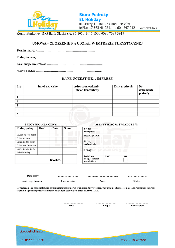 Biuro Podróży EL Holiday ul. Ustrzycka 101 , 35-504 Rzeszów tel/fax 17 863 41 22 kom. 604 247 912 www.elholiday.pl Konto Bankowe: ING Bank Śląski SA: 85 1050 1445 1000 0090 7697 3917 UMOWA – ZŁOSZENIE NA UDZIAŁ W IMPREZIE TURYSTYCZNEJ Termin imprezy…………………………………………………………. Rodzaj imprezy:………………………………………………………… Kraj/miejscowość/trasa ………………………………………………… Nazwa obiektu………………………………………………………….. DANE UCZESTNIKA IMPREZY L.p Imię i nazwisko Adres zamieszkania Telefon kontaktowy Data urodzenia Nr dokumentu podróży 1. 2. 3. 4. 5. SPECYFIKACJA CENY: Rodzaj pokoju Ilość Cena SPECYFIKACJA ŚWIADCZEŃ: Suma Os.dor. na łóż. norm Środek transportu Rodzaj pokoju Dziec..na dost. Rodzaj wyżywienia Dziec. na łóż. norm Dziec bez śwadczeń Osoba dor. na dost. Uwagi Zniżki/dopłaty Dodatkowe ubezp..od chorób przewlekłych RAZEM Dane osoby zawierającej umowę TAK NIE ………………………. ………………………………….. …………………… Imię i nazwisko Adres Telefon Oświadczam , że zapoznałem się z warunkami uczestnictwa w imprezie turystycznej , warunkami ubezpieczenia oraz programem imprezy. Wyrażam zgodę na przetwarzanie moich danych osobowych przez EL HOLIDAY. ……………………… Data ……………………… Podpis ……………………….. Pieczęć biura [email protected] NIP: 867-161-49-34 REGON:180637048