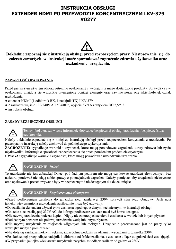 INSTRUKCJA OBSŁUGI EXTENDER HDMI PO PRZEWODZIE KONCENTRYCZNYM LKV-379 #0277 Dokładnie zapoznaj się z instrukcją obsługi przed rozpoczęciem pracy. Niestosowanie się do zaleceń zawartych w instrukcji może spowodować zagrożenie zdrowia użytkownika oraz uszkodzenie urządzenia. ZAWARTOŚĆ OPAKOWANIA Przed pierwszym użyciem otwórz ostrożnie opakowanie i wyciągnij z niego dostarczone produkty. Sprawdź czy w opakowaniu znajdują się wszystkie wymienione poniżej elementy oraz czy nie noszą one jakichkolwiek oznak uszkodzenia: ● extender HDMI (1 odbiornik RX, 1 nadajnik TX) LKV-379 ● 2 zasilacze wejście 100-240V AC 50/60Hz, wyjście 5V/1A z wtykiem DC 2,5/5,5 ● instrukcja obsługi ZASADY BEZPIECZNEJ OBSŁUGI Ten symbol oznacza ważne informacje dotyczące bezpiecznej obsługi urządzenia i bezpieczeństwa użytkownika. Należy dokładnie zapoznać się z niniejszą instrukcją obsługi przed rozpoczęciem korzystania z urządzenia. Po przeczytaniu instrukcję należy zachować do późniejszego wykorzystania. ZAGROŻENIE: sygnalizuje warunki i czynności, które mogą powodować zagrożenie utraty zdrowia lub życia użytkownika. Informuje o sposobach zabezpieczenia się przed porażeniem prądem elektrycznym. UWAGA: sygnalizuje warunki i czynności, które mogą powodować uszkodzenie urządzenia. ZAGROŻENIE! Dzieci To urządzenie nie jest zabawką! Dzieci pod żadnym pozorem nie mogą użytkować urządzeń elektrycznych bez nadzoru, ponieważ nie zdają sobie sprawy z potencjalnych zagrożeń. Należy pamiętać, aby urządzenia elektryczne oraz opakowania przechowywane były w bezpiecznym i niedostępnym dla dzieci miejscu. ZAGROŻENIE! Bezpieczeństwo elektryczne ●Przed podłączeniem zasilacza do gniazdka sieci zasilającej 230V sprawdź stan jego obudowy. Jeśli nosi jakiekolwiek znamiona uszkodzenia zasilacz nie może być używany. ●Do zasilania ekstendera używaj tylko zasilacza zgodnego z danymi technicznymi w instrukcji obsługi. ●Gniazdo sieci zasilającej 230V AC, do którego podłączasz zasilacz musi być łatwo dostępne. ●Nie używaj urządzenia podczas kąpieli. Nigdy nie zanurzaj ekstendera i zasilacza w wodzie lub innych płynach. ●Pod żadnym pozorem nie polewaj urządzenia wodą lub innym płynem. ●Nie używaj urządzenia w miejscach wilgotnych lub mokrych. Urządzenie przeznaczone jest do pracy tylko wewnątrz suchych pomieszczeń. ●Nie dotykaj zasilacza mokrymi rękami, szczególnie podczas wsadzania i wyciągania z gniazdka 230V. ●Po skończonej pracy odłącz nadajnik i odbiornik od źródeł zasilania, a zasilacze odłącz od gniazd sieci zasilającej. ●W przypadku jakiejkolwiek awarii urządzenia natychmiast odłącz zasilacz od gniazdka 230V. ZAGROŻENIE! Bezpieczeństwo osobiste ●Nie używaj urządzenia w środowisku wybuchowym (gazy, opary). ●Nie pozostawiaj urządzenia bez nadzoru. UWAGA! ●Chroń urządzenie przed ekstremalnymi temperaturami, bezpośrednim światłem słonecznym, silnymi wibracjami oraz wysoką wilgotnością. ●Wszelkie naprawy może wykonywać tylko wykwalifikowany personel. ●Niedopuszczalne są jakiekolwiek modyfikacje urządzenia. DANE TECHNICZNE Dopuszczalne rozdzielczości HDMI: Przewód połączeniowy: Maksymalny zasięg transmisji Ilość dostępnych kanałów Zakres częstotliwości: Typ złącza koncentrycznego: Kodowanie video: Kodowanie audio: Zasilanie: Pobór mocy: Zasilacz (2 sztuki): 480p/576p/720p /1080p 480i/576i/720i /1080i przewód koncentryczny RG6 lub wyższej klasy 500m 99 100 ~ 1000MHz F H.264 MPEG2 5V DC nadajnik maksymalnie 3,5W, odbiornik maksymalnie 3W wejście 100~240V 50/60Hz 0,15A wyjście 5V DC / 1A OBSŁUGA UWAGA! Należy bezwzględnie przestrzegać kolejności wszystkich podłączeń opisanych w instrukcji obsługi. Podłączenie ekstendera podczas pracy urządzeń HDMI może spowodować trwałe uszkodzenie urządzenia. 1. Wyłącz zasilanie urządzeń HDMI (telewizora, odtwarzacza DVD, tunera satelitarnego, itp.). 2. Wejście nadajnika (TX) i odbiornika (RX) sygnału oznaczone odpowiednio RF TX i RF RX połącz przewodem koncentrycznym RG6, RG7, RG11 itp. zakończonym wtykami typu F. Pamiętaj, że im lepsza jakość użytego przewodu koncentrycznego tym większy zasięg transmisji sygnału HDMI. Zaleca się używanie tylko przewodów koncentrycznych z przewodnikiem w 100% miedzianym. 3. Wejście HDMI INPUT nadajnika TX połącz jak najkrótszym przewodem HDMI ze źródłem sygnału. 4. Wyjście HDMI OUTPUT odbiornika RX połącz jak najkrótszym przewodem HDMI z telewizorem. 5. Włącz zasilanie urządzeń HDMI. 6. Podłącz wtyk DC pierwszego zasilacza do gniazda DC 5V w odbiorniku, a wtyk DC drugiego zasilacza do gniazda DC 5V w nadajniku. 7. Podłącz zasilacze do gniazd sieci zasilającej 230V AC. 8. Przyciskami znajdującymi się po obu stronach wyświetlacza LED ustaw ten sam kanał transmisji w odbiorniku RX oraz nadajniku TX. 9. W przypadku braku sygnału HDMI w telewizorze sprawdź wszystkie połączenia, ewentualnie wciśnij przycisk RESET. Uwaga! Pamiętaj, że maksymalny zasięg transmisji zależy od typu oraz jakości użytego przewodu koncentrycznego. Również częstotliwość sygnału RF ma wpływ na osiągane parametry transmisji – im niższa częstotliwość (czyli niższy ustawiony kanał) tym mniejsze tłumienie sygnału, a co za tym idzie większy maksymalny zasięg transmisji. Możliwe typy połączeń: – jeden nadajnik i jeden odbiornik: – jeden nadajnik i kilka odbiorników: – kilka nadajników i kilka odbiorników: PRAWIDŁOWE USUWANIE PRODUKTU Oznaczenie umieszczone na produkcie lub w odnoszących się do niego tekstach wskazuje, że produktu po upływie okresu użytkowania nie należy usuwać z innymi odpadami pochodzącymi z gospodarstw domowych. Aby uniknąć szkodliwego wpływu na środowisko naturalne i zdrowie ludzi wskutek niekontrolowanego usuwania odpadów, prosimy o oddzielenie produktu od innego typu odpadów ora