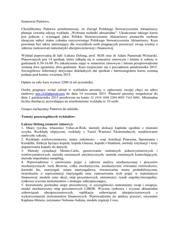 Szanowni Państwo, Chcielibyśmy Państwa poinformować, że Zarząd Polskiego Stowarzyszenia Aktuariuszy planuje czwartą edycję wykładu „Wybrane techniki aktuarialne”. Ukończenie takiego kursu jest jednym z wymagań jakie Polskie Stowarzyszenie Aktuariuszy postawiło osobom chcącym nabyć status członka rzeczywistego Polskiego Stowarzyszenia Aktuariuszy. Kurs powinien być także interesujący dla wszystkich osób pragnących poszerzyć swoją wiedzę z zakresu zastosowań matematyki ubezpieczeniowej i finansowej. Wykład poprowadzą dr hab. Łukasz Delong, prof. SGH oraz dr Adam Pasternak-Winiarski. Planowanych jest 14 spotkań, które odbędą się w semestrze zimowym i letnim w soboty w godzinach 8.30-16.00. Po zakończeniu zajęć w semestrze zimowym i letnim przeprowadzone zostaną dwa egzaminy dwu-godzinne. Kurs rozpocznie się z początkiem października 2015. Szczegółowe informacji dotyczące dokładnych dat spotkań i harmonogramu kursu zostaną podane pod koniec września 2015. Opłata za cały kurs wynosi 2200 zł od uczestnika. Osoby pragnące wziąć udział w wykładzie prosimy o zgłaszanie swojej chęci na adres mailowy [email protected] do dnia 14 września 2015. Płatność prosimy uregulować do dnia 1 października 2015 przelewem na konto 32 1910 1048 2204 0092 7163 0001. Minimalna liczba słuchaczy pozwalająca na uruchomienie wykładu to 10 osób. Gorąco zachęcamy Państwa do udziału. Tematy poszczególnych wykładów: Łukasz Delong (semestr zimowy): 1. Miary ryzyka, własności Value-at-Risk, metody alokacji kapitału zgodnie z miarami ryzyka. Rozkłady eliptyczne, rozkłady z Teorii Wartości Ekstremalnych, modelowanie nadwyżki szkody, 2. Rozkłady wielowymiarowe, miary zależności – wsp. korelacji Pearsona, Spearmana i Kendalla, funkcja łącząca kopuła, kopuła Gaussa, kopuła t-Studenta, metody estymacji i testy dopasowania kopuły do danych, 3. Metody symulacji Monte-Carlo, generowanie zmiennych jednowymiarowych i wielowymiarowych, metoda zmiennych antytetycznych, metoda zmiennych kontrolujących, metoda importance sampling, 4. Wprowadzenie i omówienie pojęć z zakresu analizy stochastycznej i procesów stochastycznych: ruch Browna, całka stochastyczna, stochastyczne równania różniczkowe, formuła Ito, martyngał, miara martyngałowa, równoważna miara probabilistyczna, twierdzenie o reprezentacji martyngału oraz zastosowania tych pojęć w matematyce finansowej: modele ceny akcji, stóp procentowych, zmienności, rynek zupełny/niezupełny, rynkowa wycena instrumentów i strategie zabezpieczające, 5. Instrumenty pochodne stopy procentowej, w szczególności instrumenty swap i swapcje, model stochastyczny stóp procentowych LIBOR. Wycena rynkowa i wycena aktuarialna zobowiązań ubezpieczeniowych, replikacja zobowiązań ubezpieczeniowych z wykorzystaniem instrumentów finansowych. Wprowadzenie do analizy przeżyć, estymator Kaplana-Meiera, estymator Nelsona-Aalena, modele regresji Coxa, 6. Wprowadzenie do analizy szeregów czasowych, własności i metody estymacji szeregów ARMA i GARCH. Modele czynnikowe i analiza głównych składowych. Przegląd metod estymacji (parametrycznych i nieparametrycznych) i testów dopasowania rozkładów do danych, 7. Uogólnione modele liniowe, regresja logistyczna, regresja Poissona, regresja Gamma, metody estymacji i testy dopasowania modeli GLM, uogólnione modele addytywne. Adam Pasternak-Winiarski (semestr letni): 1. Otoczenie regulacyjne firmy ubezpieczeniowej w Polsce i zadania aktuariusza, 2. Rodzaje rezerw techniczno-ubezpieczeniowych. Modele i metodyka stosowane przy ich wyznaczaniu, 3. MCEV - podstawowe komponenty, zasady wyznaczania i analizy towarzyszące (analiza wrażliwości, analiza zmian), 4. Wypłacalność firmy ubezpieczeniowej i zarządzanie ryzykiem w kontekście regulacji Solvency II, 5. Strategie zarządzania aktywami i pasywami (metody ALM), 6. Taryfikacja i analiza zyskowności produktów ubezpieczeniowych, 7. Modele wielostanowe i przykłady ich aktuarialnych zastosowań (systemy emerytalne). Prowadzący: Łukasz Delong: ukończył Szkołę Główną Handlową w Warszawie, obronił doktorat w Instytucie Matematycznym PAN oraz uzyskał stopień doktora habilitowanego w Kolegium Analiz Ekonomicznych SGH. Obecnie pracuje na stanowisku profesora nadzwyczajnego w Instytucie Ekonometrii SGH. Posiada licencję aktuarialną nr 130. Jest autorem licznych publikacji z matematyki ubezpieczeniowej i finansowej w wiodących krajowych i zagranicznych czasopismach naukowych, autorem książki wydanej w serii European Actuarial Academy Springer , dwukrotnym stypendystą Fundacji na Rzecz Nauki Polskiej, stypendystą Ministerstwa Nauki i Szkolnictwa Wyższego w kategorii wybitny młody naukowiec, zdobywcą wielu nagród za pracę naukową, w tym Krzyża Zasługi Prezydenta RP, nagrody Prezesa Rady Ministrów za rozprawę doktorską, nagrody Fundacji PZU oraz nagrody finałowej tygodnika Polityka. W swojej pracy naukowej zajmuje się problemami modelowania stochastycznego w finansach i ubezpieczeniach oraz problemami wyceny i zabezpieczenia zobowiązań. Adam Pasternak-Winiarski: jest absolwentem Wydziału Matematyki i Nauk Informacyjnych Politechniki Warszawskiej. Na uczelni tej w roku 2014 obronił rozprawę doktorską poświęconą tematyce optymalizacji ubezpieczeniowej. Adam pracuje obecnie w dziale usług aktuarialno-ubezpieczeniowych Deloitte w Europie Centralnej jako Menadżer. Posiada licencję aktuarialną o numerze 196. W ramach pracy zawodowej Adam uczestniczył w projektach zarówno z obszaru ubezpieczeń na życie jak i ubezpieczeń majątkowych. Zajmował się m.in. aspektami związanymi z modelowaniem aktuarialnym, implementacjami Solvency II, przygotowywaniem biznesplanów na cele wniosków o licencję na działalność ubezpieczeniową, wyznaczaniem wartości Embedded Value oraz przeglądami rezerw. Posiada bogate doświadczenie dydaktyczne, które zdobył prowadząc