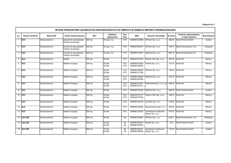 Załącznik Nr 3 WYKAZ PRODUKTÓW LECZNICZYCH DOPUSZCZONYCH DO OBROTU W RAMACH IMPORTU RÓWNOLEGŁEGO Lp. 1 Nazwa handlowa Nazwa INN Postać farmaceutyczna Moc Wielkość opakowania Kat. dost. EAN Importer równoległy Nr pozw. Podmiot odpowiedzialny w kraju eksportu Kraj eksportu ACC Acetylcysteinum granulat do sporządzania roztworu doustnego 200 mg 20 sasz. 3 g OTC 5909991223885 InPharm Sp. z o.o. 282/15 Hexal Pharma GmbH Austria 2 ACC Acetylcysteinum proszek do sporządzania roztworu doustnego 200 mg 20 sasz. 3 g OTC 5909997205472 InPharm Sp. z o.o. 703/11 Bexal Farmacéutica, S.A. Hiszpania 3 ACC Acetylcysteinum proszek do sporządzania roztworu doustnego 200 mg 20 sasz. 3 g OTC 5909997219783 Delfarma Sp. z o.o. 882/12 Bexal Farmacéutica S.A. Hiszpania 4 ACC Acetylcysteinum tabletki 200 mg 20 tabl. OTC 5902023775376 Pretium Farm Sp. z o.o. 354/15 Hexal AG Niemcy 5 ACC Acetylcysteinum tabletki musujące 200 mg 20 tabl. 25 tabl. OTC OTC 5909997075563 5909997208565 Forfarm Sp. z o.o. 121/10 Hexal AG Niemcy 6 ACC Acetylcysteinum tabletki musujące 200 mg 20 tabl. 25 tabl. OTC OTC 5909997208695 5909997211305 InPharm Sp. z o.o. 193/12 Hexal AG Niemcy 7 ACC Acetylcysteinum tabletki musujące 200 mg 20 tabl. 25 tabl. OTC OTC 5909997209265 5909991204990 Delfarma Sp. z o.o. 233/12 Hexal AG Niemcy 8 ACC Acetylcysteinum tabletki musujące 200 mg 20 tabl. 25 tabl. OTC OTC 5909997212531 5909997231617 PharmaVitae Sp. z o.o. sp. k. 448/12 Hexal AG Niemcy 9 ACC Acetylcysteinum tabletki musujące 200 mg 20 tabl. OTC 5909997212340 Delfarma Sp. z o.o. 490/12 Hexal Pharma GmbH Austria 10 ACC Acetylcysteinum tabletki musujące 200 mg 20 tabl. 25 tabl. OTC OTC 5902023770777 5902023770784 Pretium Farm Sp. z o.o. 186/13 Hexal AG Niemcy 11 ACC Acetylcysteinum tabletki musujące 200 mg 20 tabl. OTC 5909997223919 Avrentim Sp. z o.o. 318/13 Hexal AG Niemcy 12 ACC Acetylcysteinum tabletki musujące 200 mg 20 tabl. OTC 5909997232492 Aga Kommerz spol. s.r.o. 205/14 Hexal AG Niemcy 13 ACC Acetylcysteinum tabletki musujące 200 mg 20 tabl. OTC 5909991232375 Laboratorium Galenowe Olsztyn Sp. z o.o. 514/15 Hexal AG Niemcy 14 ACC 600 Acetylcysteinum tabletki musujące 600 mg 20 tabl. Rp 5909997204697 InPharm Sp. z o.o. 634/11 Bexal Farmaceutica, S.A. 15 ACC 600 Acetylcysteinum tabletki musujące 600 mg 10 tabl. 20 tabl. Rp Rp 5909997205601 5909997205618 Recipio Sp. z o.o. 3/12 Hexal Pharma GmbH Austria 16 ACC 600 Acetylcysteinum tabletki musujące 600 mg 10 tabl. 20 tabl. Rp Rp 5909997208541 5909997208558 Laboratorium Galenowe Olsztyn Sp. z o.o. 179/12 Hexal Pharma GmbH Austria Hiszpania Lp. Nazwa handlowa Nazwa INN Postać farmaceutyczna Moc Wielkość opakowania Kat. dost. EAN Importer równoległy Nr pozw. Podmiot odpowiedzialny w kraju eksportu Kraj eksportu 17 ACC Hot Acetylcysteinum granulat do sporządzania roztworu doustnego 200 mg 20 sasz. 3 g OTC 5909997212739 Delfarma Sp. z o.o. 489/12 Hexal Pharma GmbH Austria 18 ACC Max Acetylcysteinum tabletki 200 mg 20 tabl. OTC 5909997206851 Blau Farma Group Sp. z o.o. - S.K.A. 83/12 Hexal AG Niemcy 19 ACC Max Acetylcysteinum tabletki musujące 200 mg 20 tabl. OTC 5909997205977 Blau Farma Group Sp. z o.o. - S.K.A. 21/12 Hexal AG Niemcy 20 ACC mini Acetylcysteinum granulat do sporządzania roztworu doustnego 100 mg 20 sasz. 3 g OTC 5909997069890 InPharm Sp. z o.o. 78/10 Hexal Pharma GmbH Austria 21 ACC mini Acetylcysteinum granulat do sporządzania roztworu doustnego 100 mg 20 sasz. 3 g OTC 5909997209876 Delfarma Sp. z o.o. 408/12 Hexal Pharma GmbH Austria 22 ACC mini Acetylcysteinum proszek do sporządzania roztworu doustnego 100 mg 20 sasz. 3 g OTC 5909997206455 InPharm Sp. z o.o. 54/12 Bexal Farmaceutica, S.A. 23 ACC mini Acetylcysteinum tabletki musujące 100 mg 20 tabl. OTC 5909997069739 InPharm Sp. z o.o. 64/10 Hexal Pharma GmbH Austria 24 ACC mini Acetylcysteinum tabletki musujące 100 mg 20 tabl. OTC 5909997203829 Delfarma Sp. z o.o. 591/11 Hexal Pharma GmbH Austria 25 ACC mini Acetylcysteinum tabletki musujące 100 mg 20 tabl. OTC 5909997210933 Avrentim Sp. z o.o. 334/12 Hexal Pharma GmbH Austria 26 ACC mini Acetylcysteinum tabletki musujące 100 mg 20 tabl. OTC 5909997230627 Forfarm Sp. z o.o. 87/14 Hexal Pharma GmbH Austria 27 ACC optima Acetylcysteinum tabletki musujące 600 mg 10 tabl. OTC 5909990504589 Delfarma Sp. z o.o. 100/08 Hexal Pharma GmbH Austria 28 ACC optima Acetylcysteinum tabletki musujące 600 mg 10 tabl. OTC 5909997075495 InPharm Sp. z o.o. 116/10 Hexal Pharma GmbH Austria 29 ACC optima Acetylcysteinum tabletki musujące 600 mg 10 tabl. OTC 5909997206585 Avrentim Sp. z o.o. 80/12 Hexal Pharma GmbH Austria 30 ACC optima Acetylcysteinum tabletki musujące 600 mg 10 tabl. OTC 5909997221717 Delfarma Sp. z o.o. 78/13 Sandoz B.V. Holandia 31 ACC optima Acetylcysteinum tabletki musujące 600 mg 10 tabl. OTC 5902023771026 Pretium Farm Sp. z o.o. 303/13 Sandoz NV Belgia 32 ACC optima Acetylcysteinum tabletki musujące 600 mg 10 tabl. OTC 5909997227252 Delfarma Sp. z o.o. 451/13 Sandoz NV Belgia 33 ACC optima Acetylcysteinum tabletki musujące 600 mg 10 tabl. OTC 5909991200015 Forfarm Sp. z o.o. 369/14 Sandoz NV Belgia 34 ACC optima Acetylcysteinum tabletki musujące 600 mg 10 tabl. OTC 5909991207618 InPharm Sp. z o.o. 93/15 Sandoz NV Belgia Hiszpania Lp. Nazwa handlowa Nazwa INN Postać farmaceutyczna Moc Wielkość opakowania Kat. dost. EAN Importer równoległy Nr pozw. Podmiot odpowiedzialny w kraju eksportu Kraj eksportu 35 ACC optima Acetylcysteinum tabletki musujące 600 mg 10 tabl. OTC 5909991230029 Laboratorium Galenowe Olsztyn Sp. z o.o. 424/15 Hexal Pharma GmbH Austria 36 Accupro 5 Quinaprilum tabletki powlekane 5 mg 30 tabl. 50 tabl. 100 tabl. Rp Rp Rp 5909990501007 5909990501014 5909990501021 Delfarma Sp. z o.o. 77/06 Pfizer spol. s.r.o. Czechy 37 Accupro 5 Quinaprilum tabletki powlekane 5 mg 30 tabl. 50 tabl. 100 tabl. Rp Rp Rp 5909997201238 5909997201245 5909997201252 Forfarm Sp. z o.o. 414/11 Pfizer spol. s.r.o. Czechy 38 Accupro 5 Quin