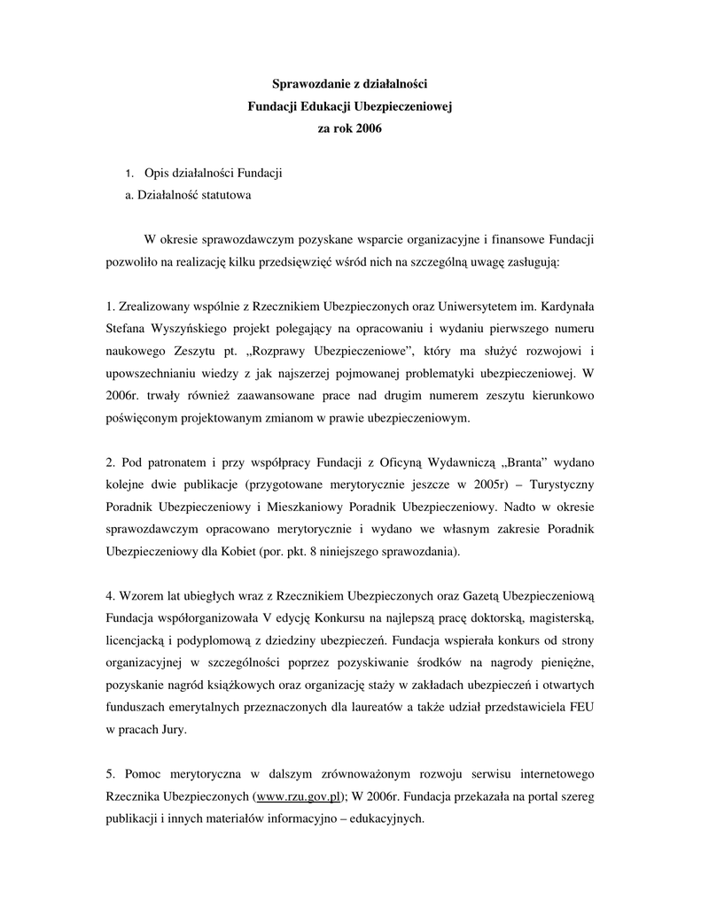 Sprawozdanie z działalności Fundacji Edukacji Ubezpieczeniowej za rok 2006 1. Opis działalności Fundacji a. Działalność statutowa W okresie sprawozdawczym pozyskane wsparcie organizacyjne i finansowe Fundacji pozwoliło na realizację kilku przedsięwzięć wśród nich na szczególną uwagę zasługują: 1. Zrealizowany wspólnie z Rzecznikiem Ubezpieczonych oraz Uniwersytetem im. Kardynała Stefana Wyszyńskiego projekt polegający na opracowaniu i wydaniu pierwszego numeru naukowego Zeszytu pt. „Rozprawy Ubezpieczeniowe”, który ma służyć rozwojowi i upowszechnianiu wiedzy z jak najszerzej pojmowanej problematyki ubezpieczeniowej. W 2006r. trwały również zaawansowane prace nad drugim numerem zeszytu kierunkowo poświęconym projektowanym zmianom w prawie ubezpieczeniowym. 2. Pod patronatem i przy współpracy Fundacji z Oficyną Wydawniczą „Branta” wydano kolejne dwie publikacje (przygotowane merytorycznie jeszcze w 2005r) – Turystyczny Poradnik Ubezpieczeniowy i Mieszkaniowy Poradnik Ubezpieczeniowy. Nadto w okresie sprawozdawczym opracowano merytorycznie i wydano we własnym zakresie Poradnik Ubezpieczeniowy dla Kobiet (por. pkt. 8 niniejszego sprawozdania). 4. Wzorem lat ubiegłych wraz z Rzecznikiem Ubezpieczonych oraz Gazetą Ubezpieczeniową Fundacja współorganizowała V edycję Konkursu na najlepszą pracę doktorską, magisterską, licencjacką i podyplomową z dziedziny ubezpieczeń. Fundacja wspierała konkurs od strony organizacyjnej w szczególności poprzez pozyskiwanie środków na nagrody pieniężne, pozyskanie nagród książkowych oraz organizację staży w zakładach ubezpieczeń i otwartych funduszach emerytalnych przeznaczonych dla laureatów a także udział przedstawiciela FEU w pracach Jury. 5. Pomoc merytoryczna w dalszym zrównoważonym rozwoju serwisu internetowego Rzecznika Ubezpieczonych (www.rzu.gov.pl); W 2006r. Fundacja przekazała na portal szereg publikacji i innych materiałów informacyjno – edukacyjnych. 6. Fundacja we współpracy ze Stowarzyszeniem na Rzecz Bezpieczeństwa Obywateli RP współpracowała merytorycznie w przygotowaniu e-lerningowego projektu „Edukacja ubezpieczeniowa w ramach przedmiotu - Podstawy Przedsiębiorczości”. Fundacja przygotowała merytoryczną zawartość modułu II projektu tj. słownik podstawowych pojęć ubezpieczeniowych, prezentację polskiego rynku ubezpieczeniowego i jego instytucji, charakterystykę wybranych ubezpieczeń gospodarczych działu II - majątkowych. Obecnie projekt znajduje się w fazie informatycznej aplikacji dostarczonych treści. 7. Fundacja w okresie sprawozdawczym przekazała szereg publikacji fachowych do prasy branżowej takiej jak „Monitor Ubezpieczeniowy”, „Gazeta Ubezpieczeniowa”, „Prawo Ubezpieczeń i Reasekuracja”, „Gazeta Prawna”; W ramach tej płaszczyzny działalności Fundacja przekazywała do periodyków branżowych artykuły problemowe, omówienie zmian w prawodawstwie i szereg innych opracowań. M.in. w wyniku tych działań w ostatnich latach Monitor zwiększył niemal trzykrotnie swoją objętość i jest postrzegany jako jeden z czołowych konsumenckich periodyków z zakresu ubezpieczeń i zabezpieczenia społecznego. 8. Realizacja szerokiego projektu edukacyjno - informacyjnego na rzecz polskich kobiet – pt. „Być kobietą ubezpieczoną” wobec ich roli w nowoczesnym europejskim społeczeństwie. W ramach akcji przygotowane i przeprowadzone zostały spotkania z kobietami w różnych regionach Polski gdzie prezentowano problematykę ubezpieczeń mieszkaniowych, torebek i innych specjalistycznych produktów dla kobiet (Warszawa 12 stycznia 2006 r.), zabezpieczenia na przyszłość z wykorzystaniem ubezpieczeń na życie szczególnie z opcją inwestycyjną (Trójmiasto 25 stycznia 2006 r.), ubezpieczeniom odpowiedzialności cywilnej w życiu prywatnym (Kraków 9 luty 2006 r.), ubezpieczeniom na rzecz dzieci – posagowym (Lublin 21 luty 2006 r.) i ubezpieczeniom zdrowotnym (Poznań 2 marca 2006 r.). Dodatkowo wobec zainteresowania akcją zorganizowane zostały dwa dodatkowe spotkania na zaproszenie rzeczników konsumenta w mniejszych ośrodkach - Gołubiu Dobrzyniu i Opatowie. Akcja i poczynione podczas jej realizacji obserwacje wraz z jej wynikami zostały podsumowane podczas Konferencji naukowej zorganizowanej we współpracy z Rzecznikiem w połowie 2006 roku. Ponadto w ramach projektu został zredagowany i wydany Poradnik ubezpieczeniowy „Być kobietą ubezpieczoną” (wrzesień 2006r) zawierający słowniczek pojęć ubezpieczeniowych wyjaśniający charakterystyczne dla ubezpieczeń pojęcia, omawiający kolejno ubezpieczenia majątkowe w tym osobowe i chorobowe oraz ubezpieczenia na życie. 9. W okresie sprawozdawczym kontynuowano współpracę z grupą ING Nationale Nederlanden przy organizacji Dziennikarskiej Akademii Ubezpieczeń, będącej kontynuacją wieloletniej (od 5 lat) szerszej w założeniach akcji edukacyjnych na rzecz podniesienia merytorycznego poziomu wiedzy dziennikarzy zajmujących się problematyką rynków finansowych. Akademia jest wartą podkreślenia formą współpracy mającą na celu dotarcie z wiedzą i popularyzację zagadnień z zakresu zabezpieczenia społecznego i ubezpieczeń gospodarczych szczególnie do dziennikarzy prasy lokalnej. Do tej pory odbyło się osiem tego typu spotkań poświęconych przede wszystkim problematyce ubezpieczeń życiowych, ubezpieczeń turystycznych, zmianom w prawie ubezpieczeniowym, zabezpieczeniu emerytalnemu ze szczególnym uwzględnieniem problematyki OFE oraz funduszom inwestycyjnym, głównie pod kątem budowanie bezpieczeństwa finansowego obywateli. Dwa z nich, które odbyły się w 2006 r. poświęcone zostały problematyce zabezpieczenia emerytalnego w ramach OFE, analizie sytuacji ekonomicznej Polski i prognozom rozwoju do 2010 r., tzw. Strategii Lizbońskiej dla ubezpieczeń, świadomości ubezpieczeniowej Polaków oraz drugie z nich poświę