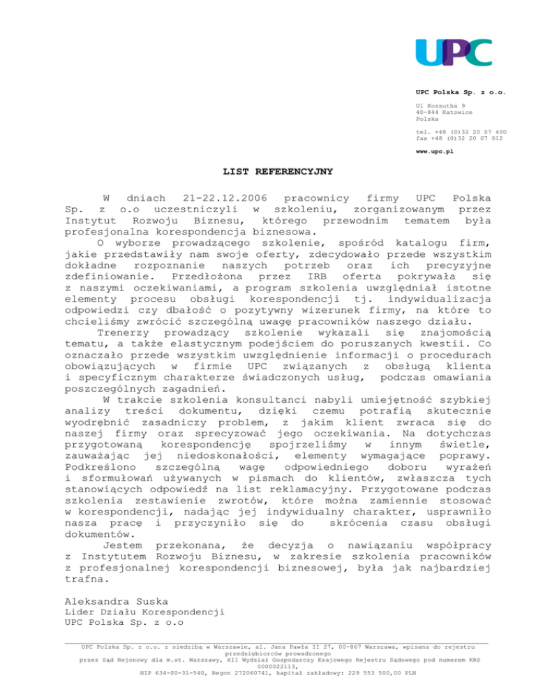 UPC Polska Sp. z o.o. Ul Kossutha 9 40-844 Katowice Polska tel. +48 (0)32 20 07 400 fax +48 (0)32 20 07 012 www.upc.pl LIST REFERENCYJNY W dniach 21-22.12.2006 pracownicy firmy UPC Polska Sp. z o.o uczestniczyli w szkoleniu, zorganizowanym przez Instytut Rozwoju Biznesu, którego przewodnim tematem była profesjonalna korespondencja biznesowa. O wyborze prowadzącego szkolenie, spośród katalogu firm, jakie przedstawiły nam swoje oferty, zdecydowało przede wszystkim dokładne rozpoznanie naszych potrzeb oraz ich precyzyjne zdefiniowanie. Przedłożona przez IRB oferta pokrywała się z naszymi oczekiwaniami, a program szkolenia uwzględniał istotne elementy procesu obsługi korespondencji tj. indywidualizacja odpowiedzi czy dbałość o pozytywny wizerunek firmy, na które to chcieliśmy zwrócić szczególną uwagę pracowników naszego działu. Trenerzy prowadzący szkolenie wykazali się znajomością tematu, a także elastycznym podejściem do poruszanych kwestii. Co oznaczało przede wszystkim uwzględnienie informacji o procedurach obowiązujących w firmie UPC związanych z obsługą klienta i specyficznym charakterze świadczonych usług, podczas omawiania poszczególnych zagadnień. W trakcie szkolenia konsultanci nabyli umiejętność szybkiej analizy treści dokumentu, dzięki czemu potrafią skutecznie wyodrębnić zasadniczy problem, z jakim klient zwraca się do naszej firmy oraz sprecyzować jego oczekiwania. Na dotychczas przygotowaną korespondencję spojrzeliśmy w innym świetle, zauważając jej niedoskonałości, elementy wymagające poprawy. Podkreślono szczególną wagę odpowiedniego doboru wyrażeń i sformułowań używanych w pismach do klientów, zwłaszcza tych stanowiących odpowiedź na list reklamacyjny. Przygotowane podczas szkolenia zestawienie zwrotów, które można zamiennie stosować w korespondencji, nadając jej indywidualny charakter, usprawniło nasza pracę i przyczyniło się do skrócenia czasu obsługi dokumentów. Jestem przekonana, że decyzja o nawiązaniu współpracy z Instytutem Rozwoju Biznesu, w zakresie szkolenia pracowników z profesjonalnej korespondencji biznesowej, była jak najbardziej trafna. Aleksandra Suska Lider Działu Korespondencji UPC Polska Sp. z o.o __________________________________________________________________________________________________ UPC Polska Sp. z o.o. z siedzibą w Warszawie, al. Jana Pawła II 27, 00-867 Warszawa, wpisana do rejestru przedsiębiorców prowadzonego przez Sąd Rejonowy dla m.st. Warszawy, XII Wydział Gospodarczy Krajowego Rejestru Sądowego pod numerem KRS 0000022113, NIP 634-00-31-540, Regon 272060741, kapitał zakładowy: 229 553 500,00 PLN
