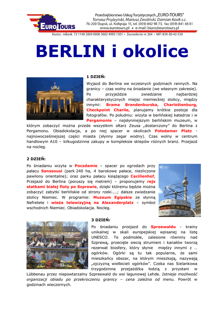 BERLIN i okolice 1 DZIEŃ: Wyjazd do Berlina we wczesnych godzinach rannych. Na granicy – czas wolny na śniadanie (we własnym zakresie). Po przyjeździe zwiedzanie najbardziej charakterystycznych miejsc niemieckiej stolicy, między innymi: Brama Brandenburska, Charlottenburg, Checkpoint Charlie, planujemy krótkie postoje dla fotografów. Po południu: wizyta w berlińskiej katedrze i w Pergamonie – najsłynniejszym berlińskim muzeum, w którym zobaczyć moŜna przede wszystkim ołtarz Zeusa „dostarczony” do Berlina z Pergamonu. Obiadokolacja, a po niej spacer w okolicach Potsdamer Platz najnowocześniejszej części miasta (słynny zegar wodny). Czas wolny w centrum handlowym A10 – kilkugodzinne zakupy w kompleksie sklepów róŜnych branŜ. Przejazd na nocleg. 2 DZIEŃ: Po śniadaniu wizyta w Poczdamie – spacer po ogrodach przy pałacu Sanssousi (park 240 ha, 4 barokowe pałace, niezliczone pawilony orientalne); oraz parku pałacu ksiąŜęcego Cecilienhof, Przejazd do Berlina (poruszy się metrem) – proponujemy rejs statkami białej floty po Szprewie, dzięki któremu będzie moŜna zobaczyć zabytki berlińskie od strony rzeki....; dalsze zwiedzanie stolicy Niemiec. W programie: Muzeum Egipskie ze słynną Nefretete i wieŜa telewizyjną na Alexanderplatz – symbol wschodnich Niemiec. Obiadokolacja. Nocleg. 3 DZIEŃ: Po śniadaniu przejazd do Spreewaldu - krainy unikalnej w skali europejskiej wpisanej na listę UNESCO. Te podmokłe, zalesione równiny nad Szprewą, przecięte siecią strumieni i kanałów tworzą rezerwat biosfery, który słynie między innymi z … ogórków. Ogórki są tu tak popularne, Ŝe sami mieszkańcy obszar, na którym mieszkają, nazywają „ojczyzną wielbicieli ogórków”. Czeka nas Sielankowa trzygodzinna przejaŜdŜka łodzią z przystani w Lübbenau przez niepowtarzalny Szpreewald do wsi lagunowej Lehde. Istnieje moŜliwość organizacji obiadu po przekroczeniu granicy – cena zaleŜna od menu. Powrót w godzinach wieczornych. TERMIN: 9-11.09.2011 350 zł + 100€ (cena przy min. 40 osobach płacących) ŚWIADCZENIA: - 2 noclegi pod Berlinem w hotelu w okolicach Berlina, pokoje 2-3-osobowe z łazienką; - wyŜywienie: 2 śniadania; 2 obiadokolacje w okolicach Berlina; - środek transportu – autokar turystyczny z klimatyzacją, video lub DVD (48 miejsc dla grupy); - ubezpieczenie KL i NNW w Signal Iduna S.A.; - opieka licencjonowanego pilota. PŁATNE DODATKOWO: Bilety wstępu (stan na czerwiec 2011 – ceny biletów mogą ulec zmianie). - Muzeum Pergamon ok. 12 euro; - Muzeum Egipskie ok. 8 euro lub inne muzeum ok. 8 euro; - wieŜa TV ok. 11 euro; - rejs statkiem po Sprewie ok. 12 euro; - Spreewald ok. 15 euro. UWAGA: obowiązkowo naleŜy posiadać dowód osobisty lub paszport !!!